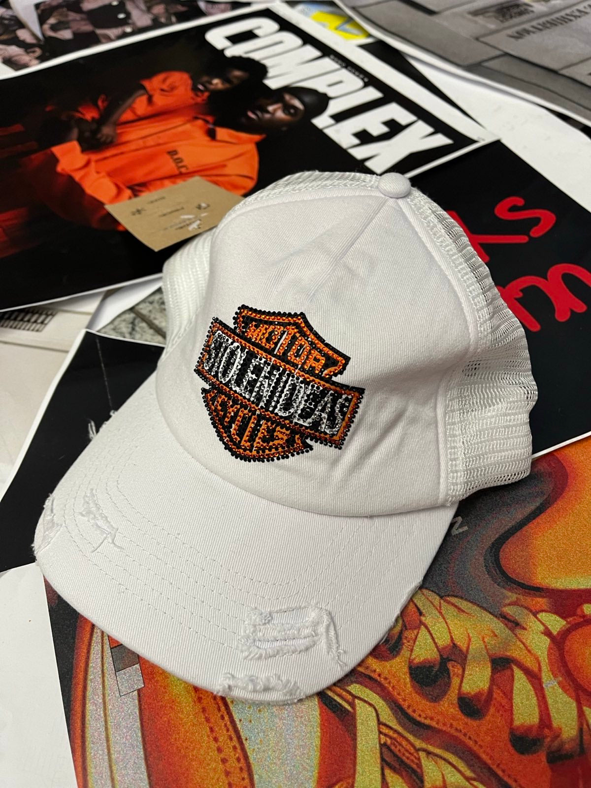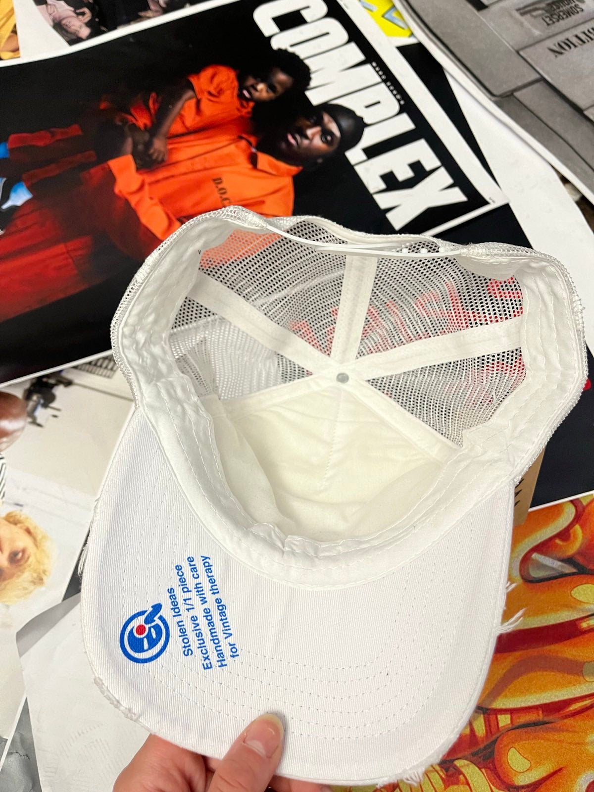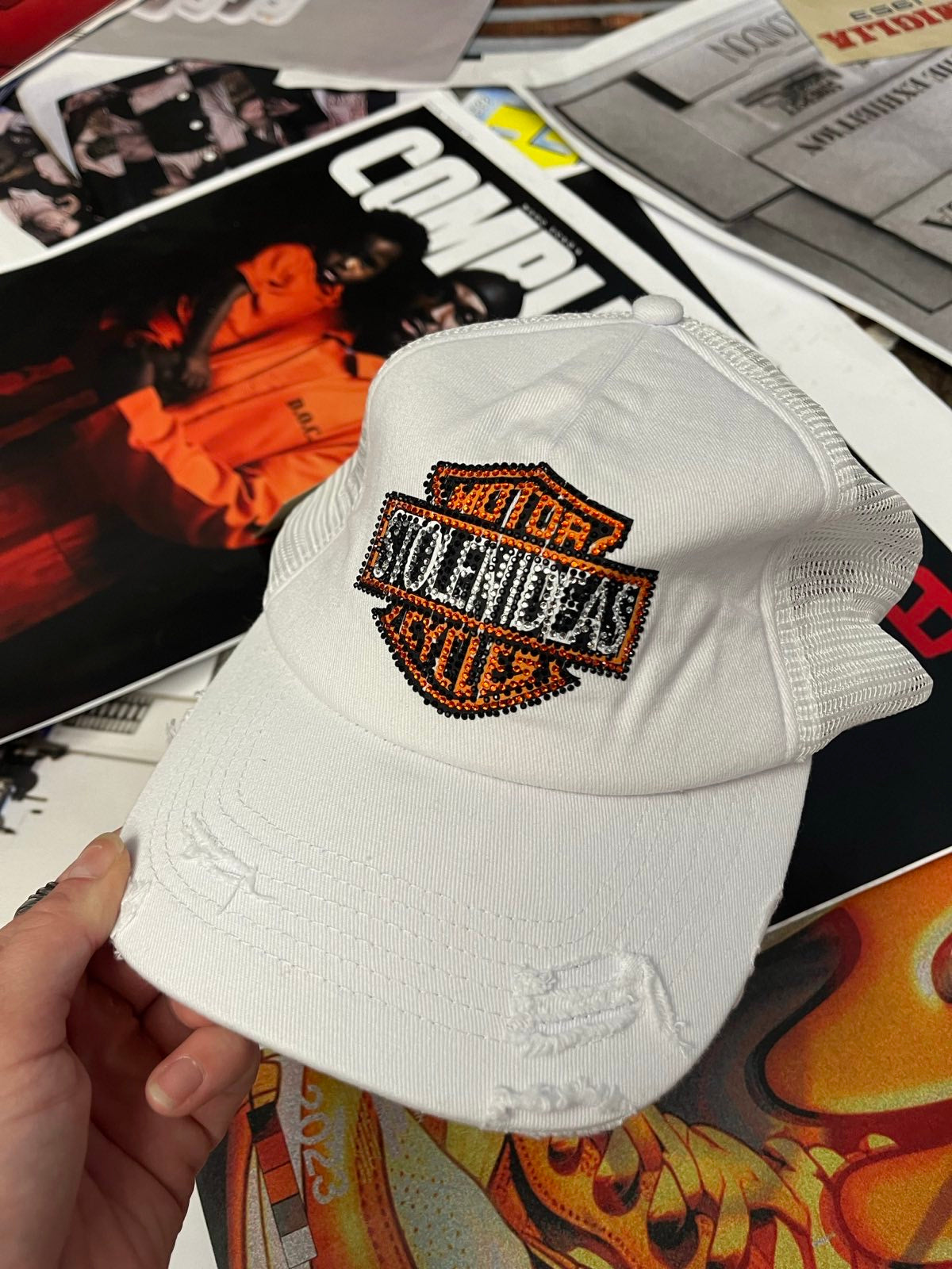 Bílá kšiltovka s potiskem aplikace rhinestones a DTF. Ručně aplikovaný distressed efekt.