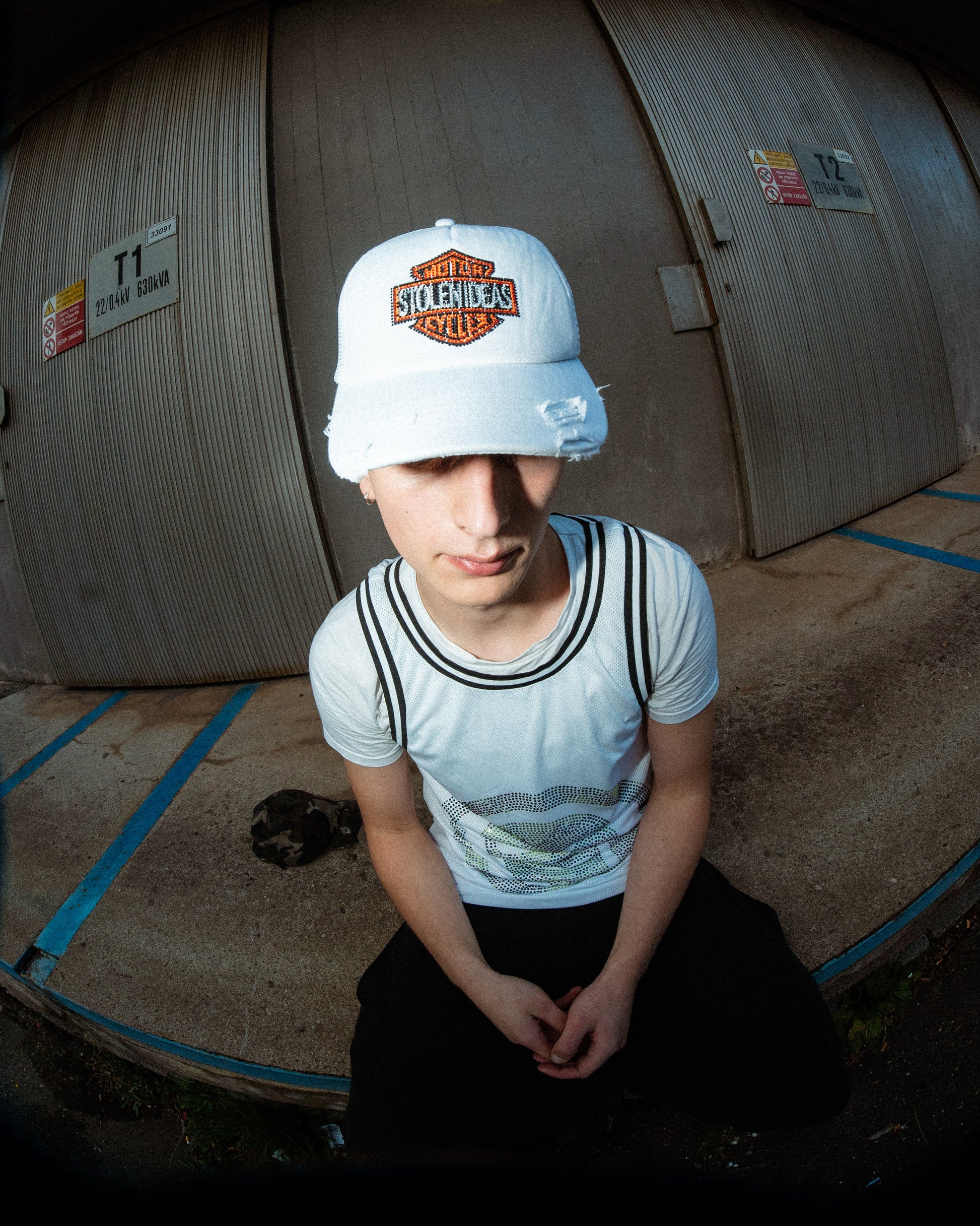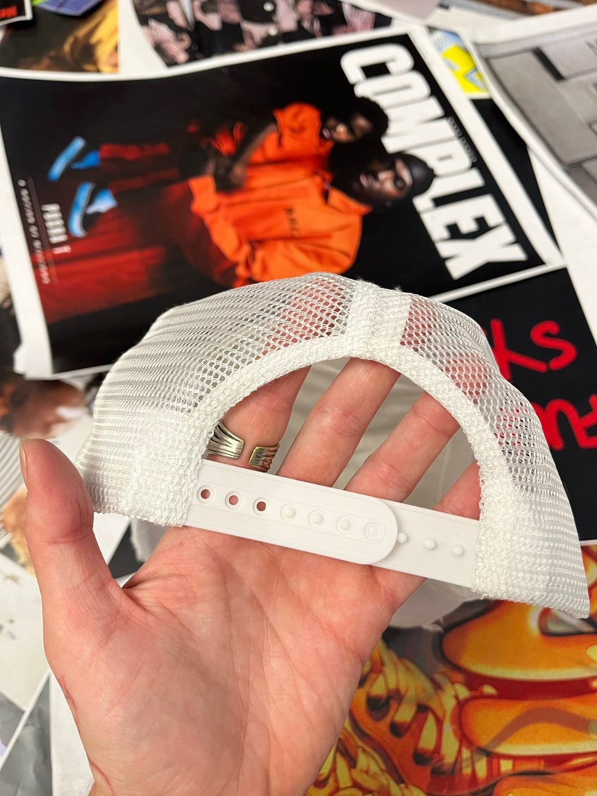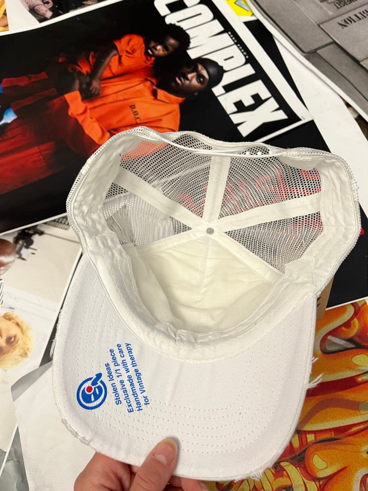 Bílá kšiltovka s potiskem aplikace rhinestones a DTF. Ručně aplikovaný distressed efekt.