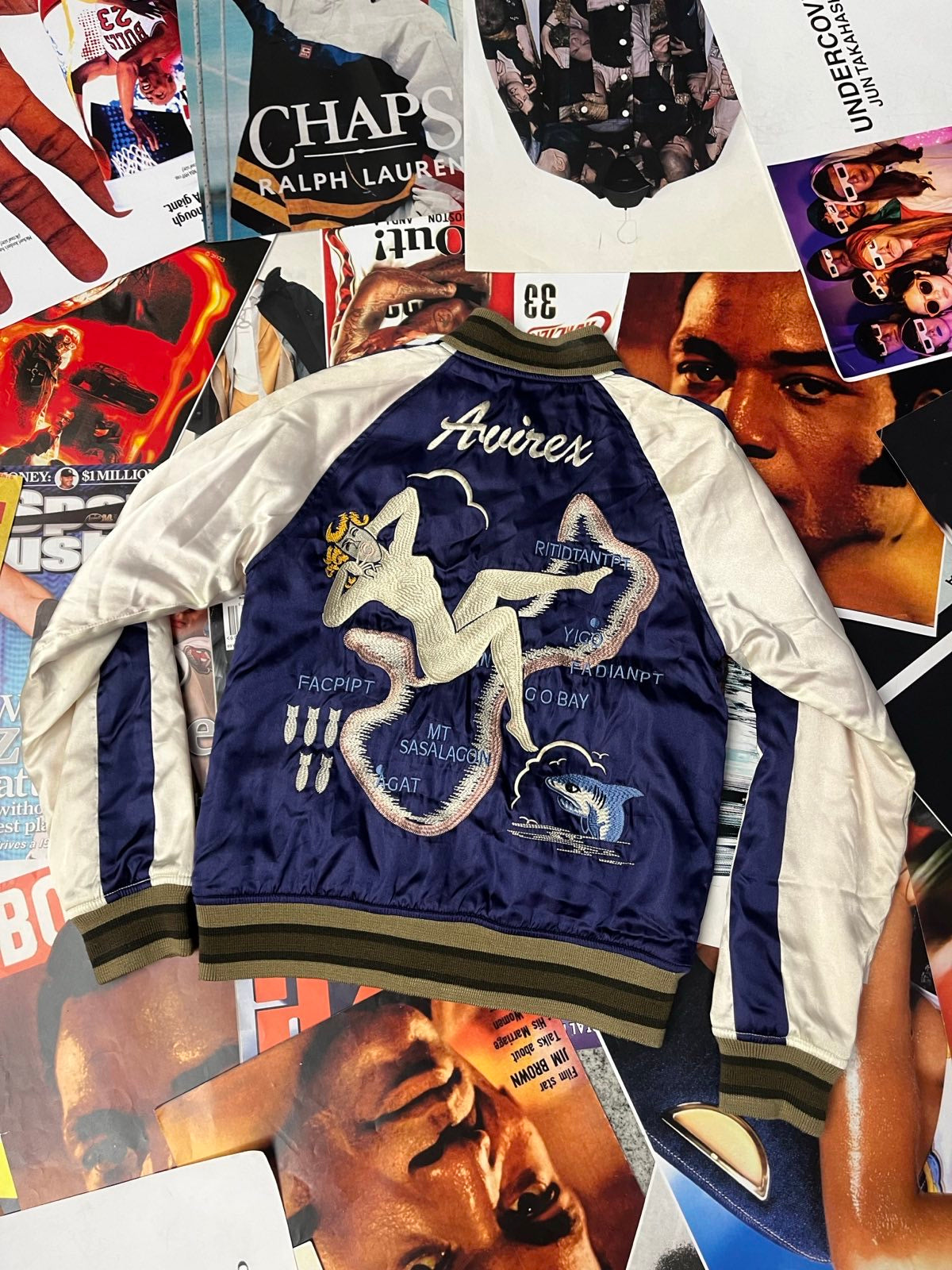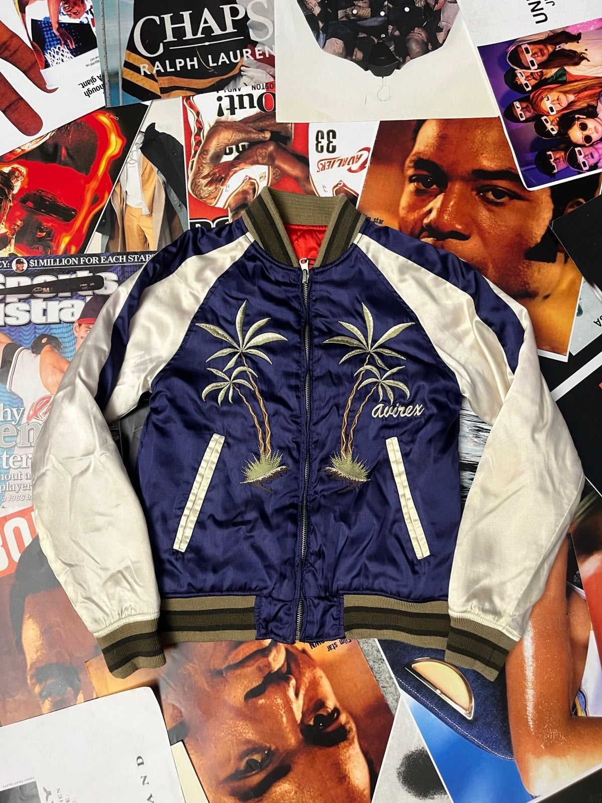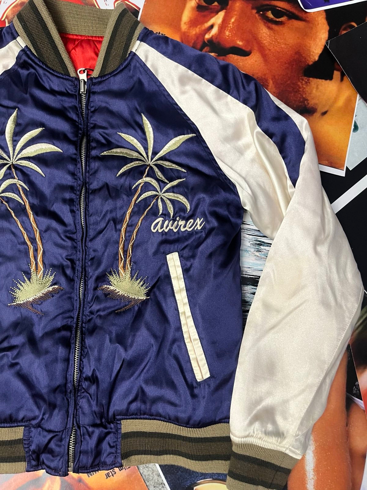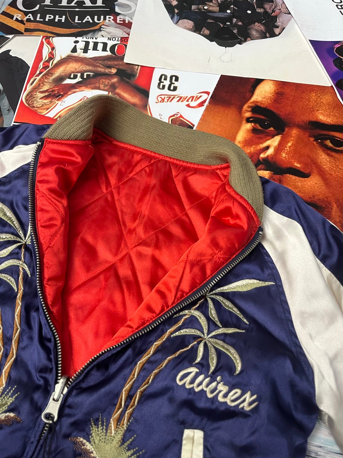 (S) Avirex BOMBER lesklý modro–bílý vyšité palmy na přední straně a spousta výšivek na zádech
