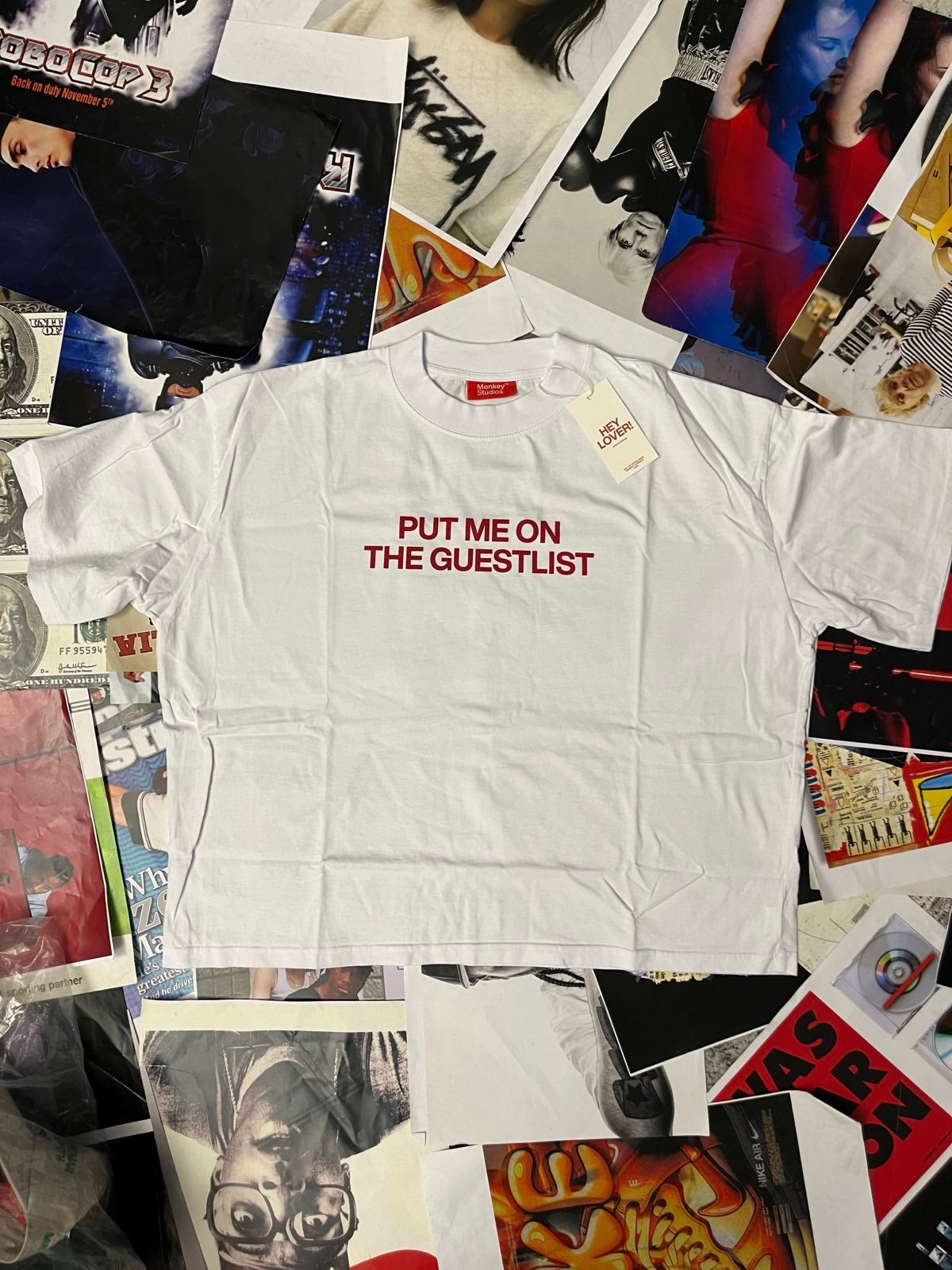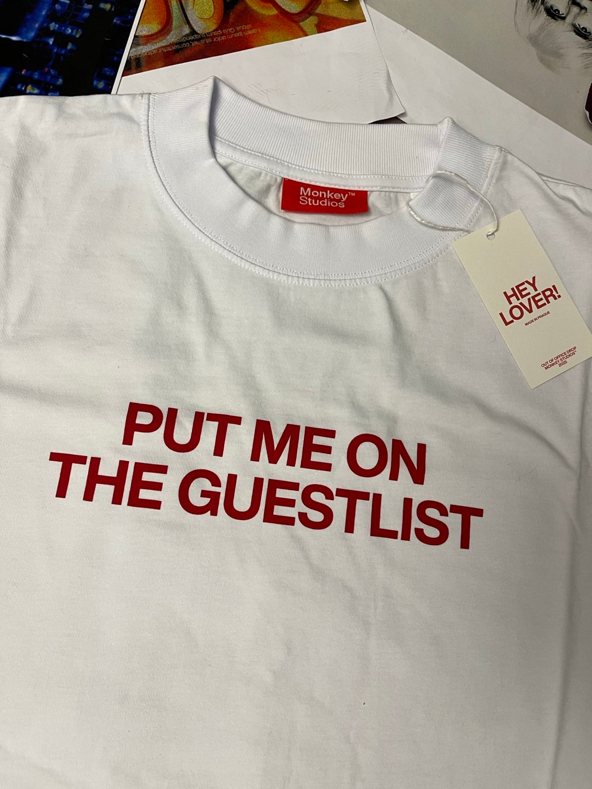 Bílé tričko červený nápis "Put me on the guestlist"