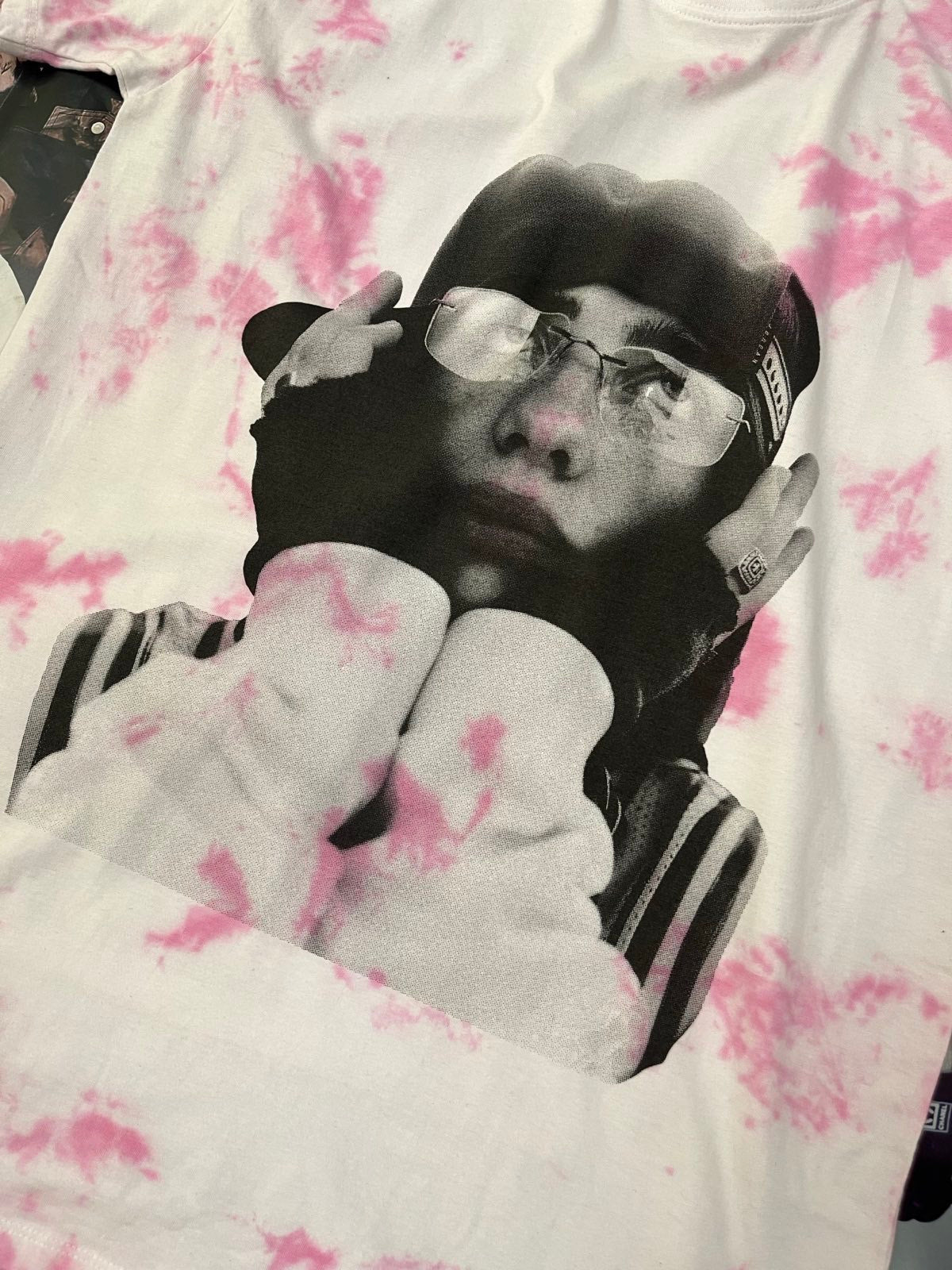 Triko BOOTLEG bílé s růžovou batikou a černým sítem Billie Eilish