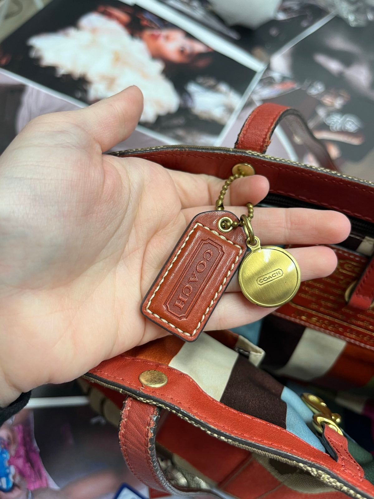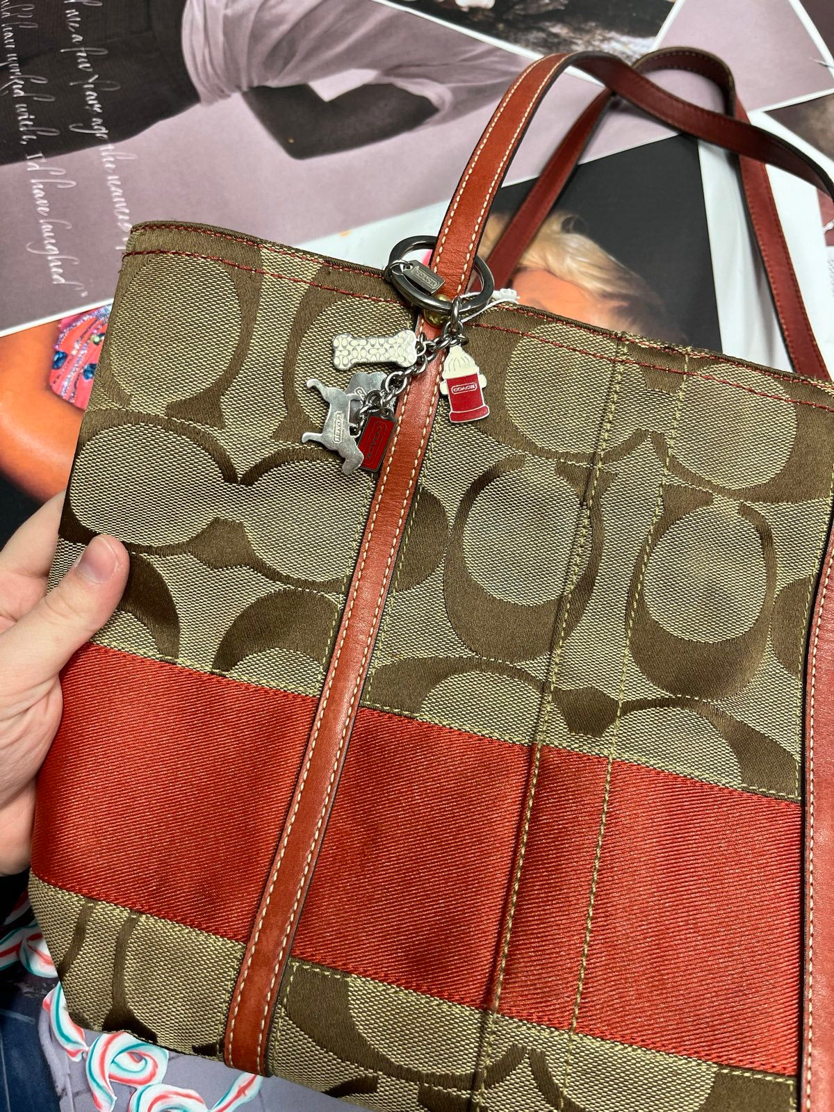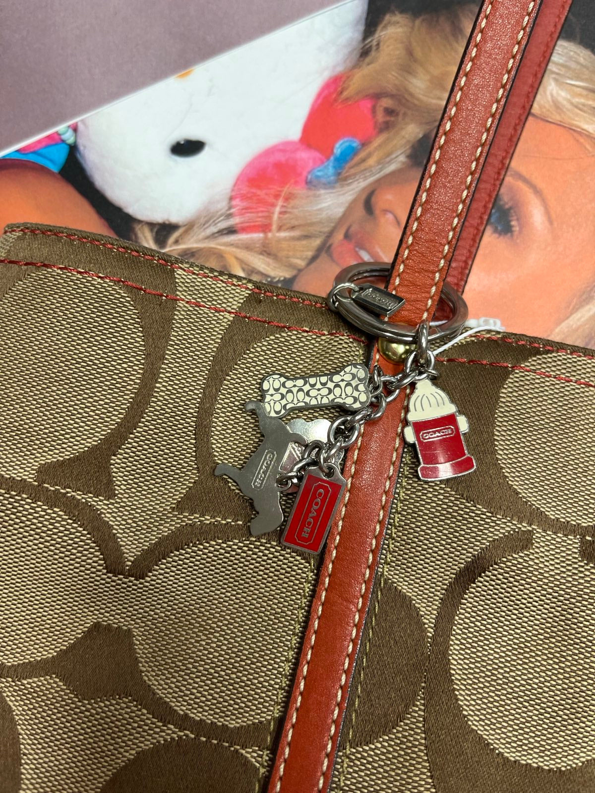 COACH kabelka béžová s monogramem a cihlově červenými detaily, přívěsky se psy