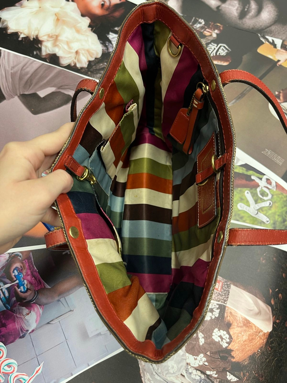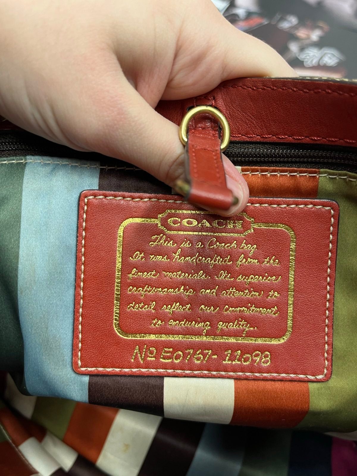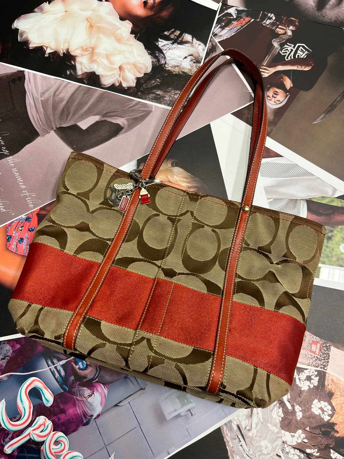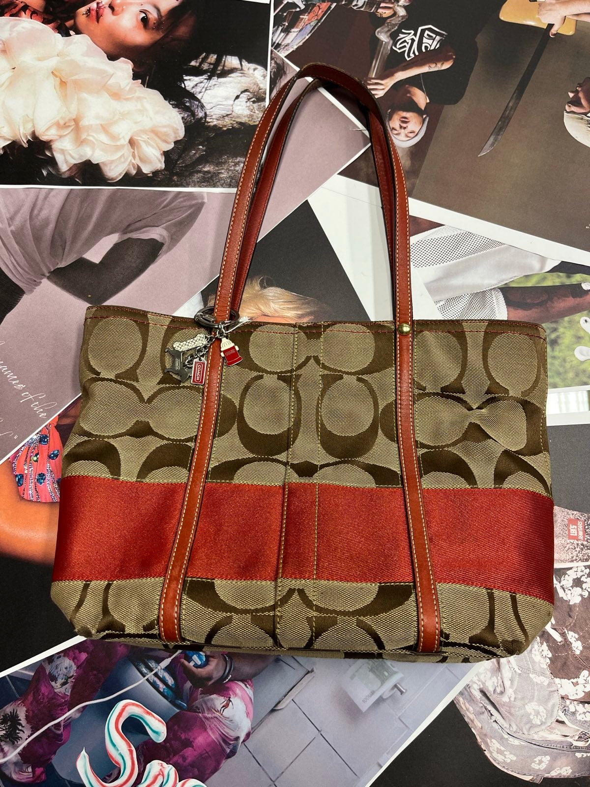 COACH kabelka béžová s monogramem a cihlově červenými detaily, přívěsky se psy