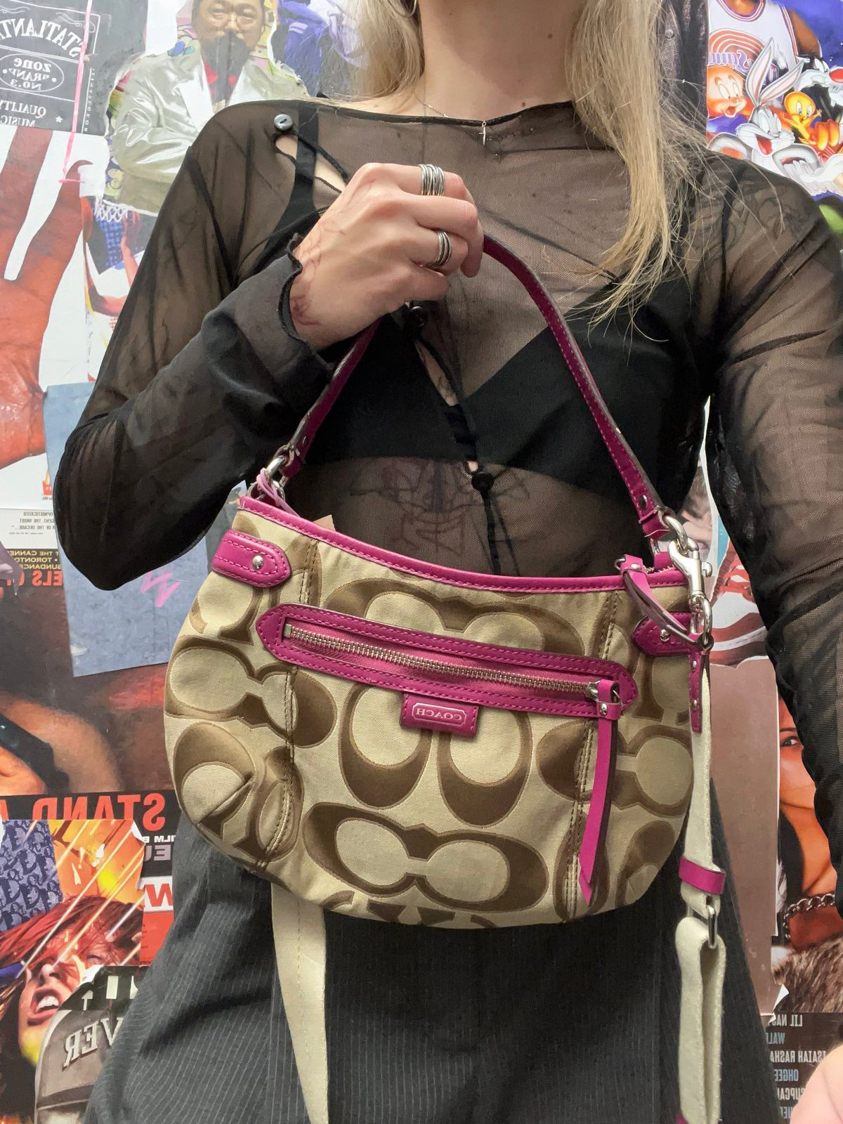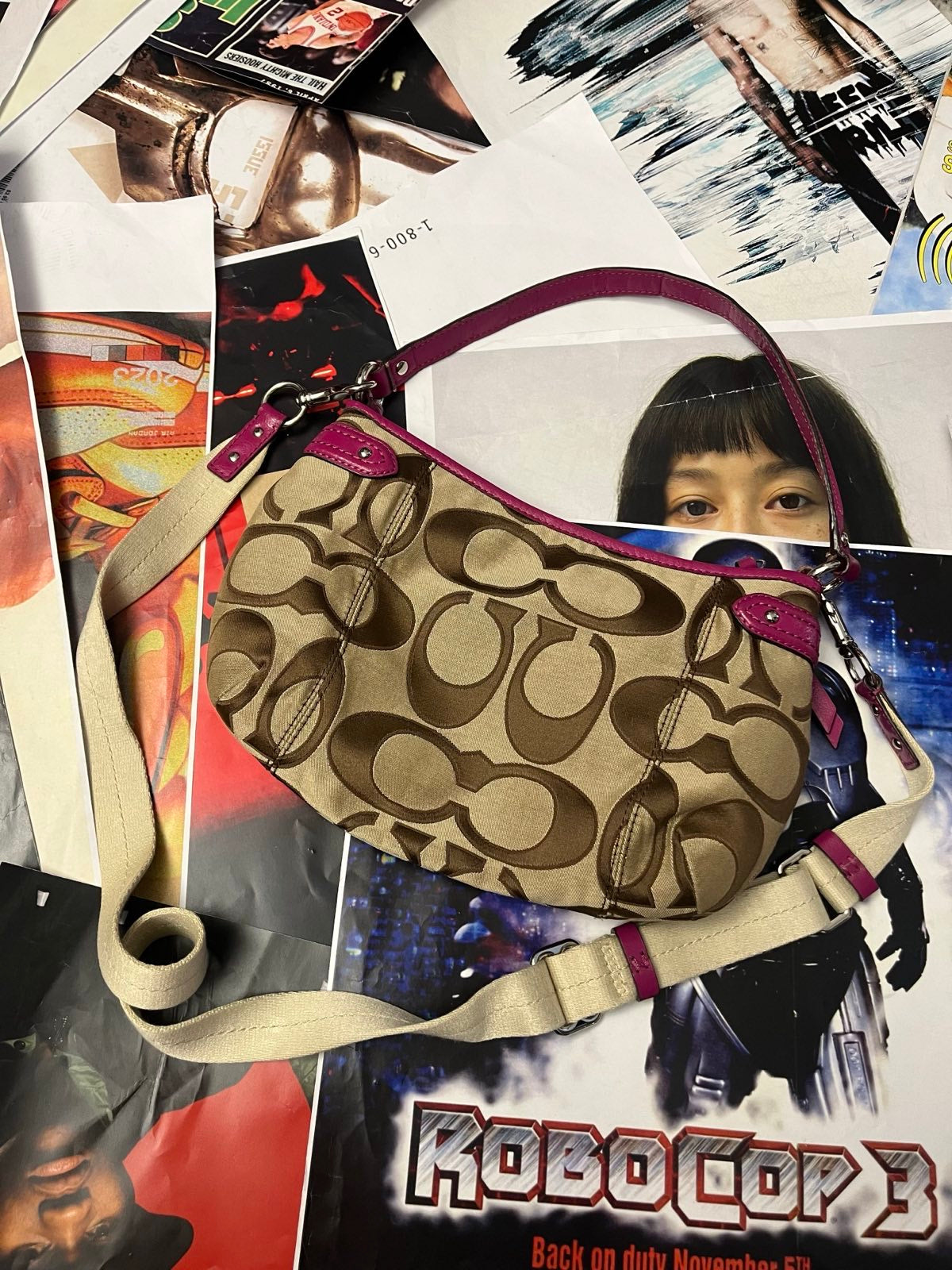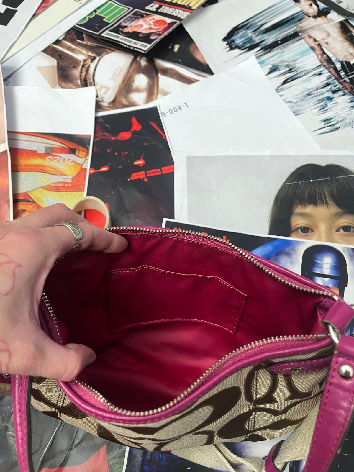 COACH kabelka hnědá s monogramem malá s fialovo–růžovými detaily