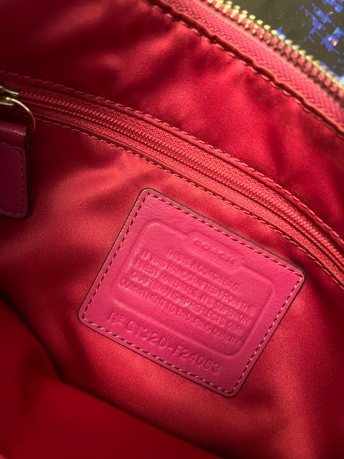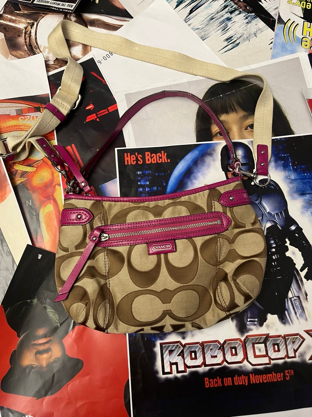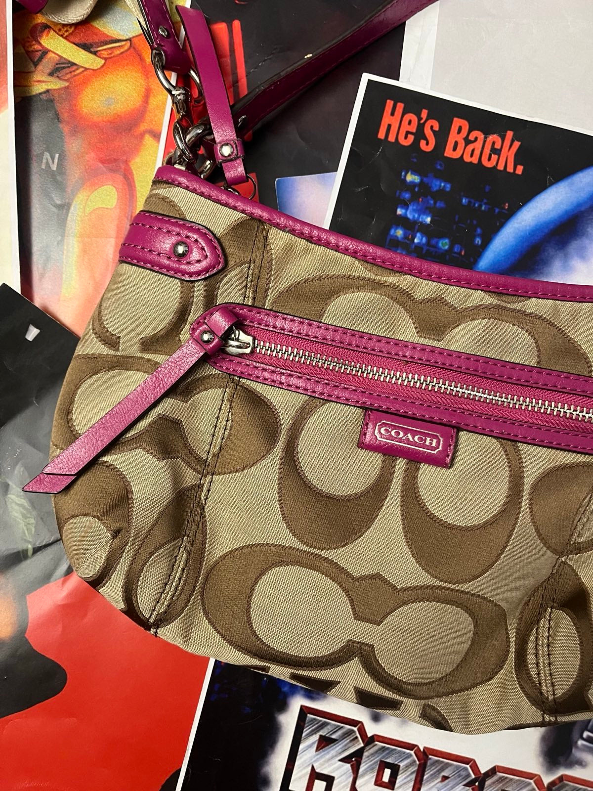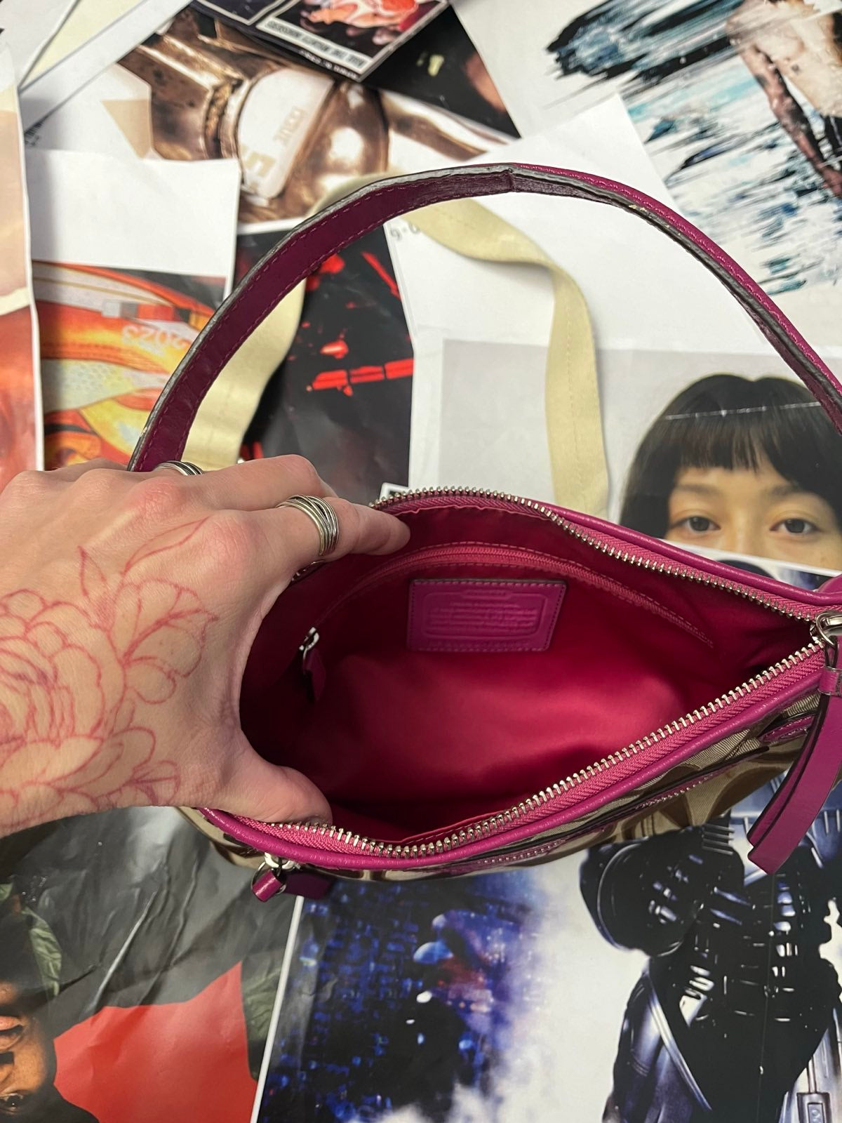 COACH kabelka hnědá s monogramem malá s fialovo–růžovými detaily