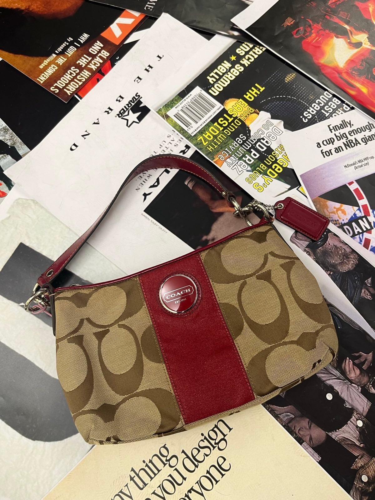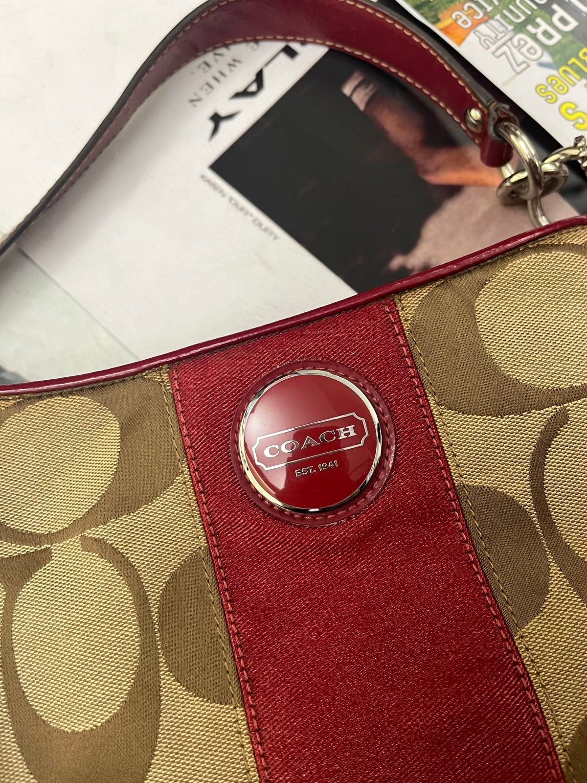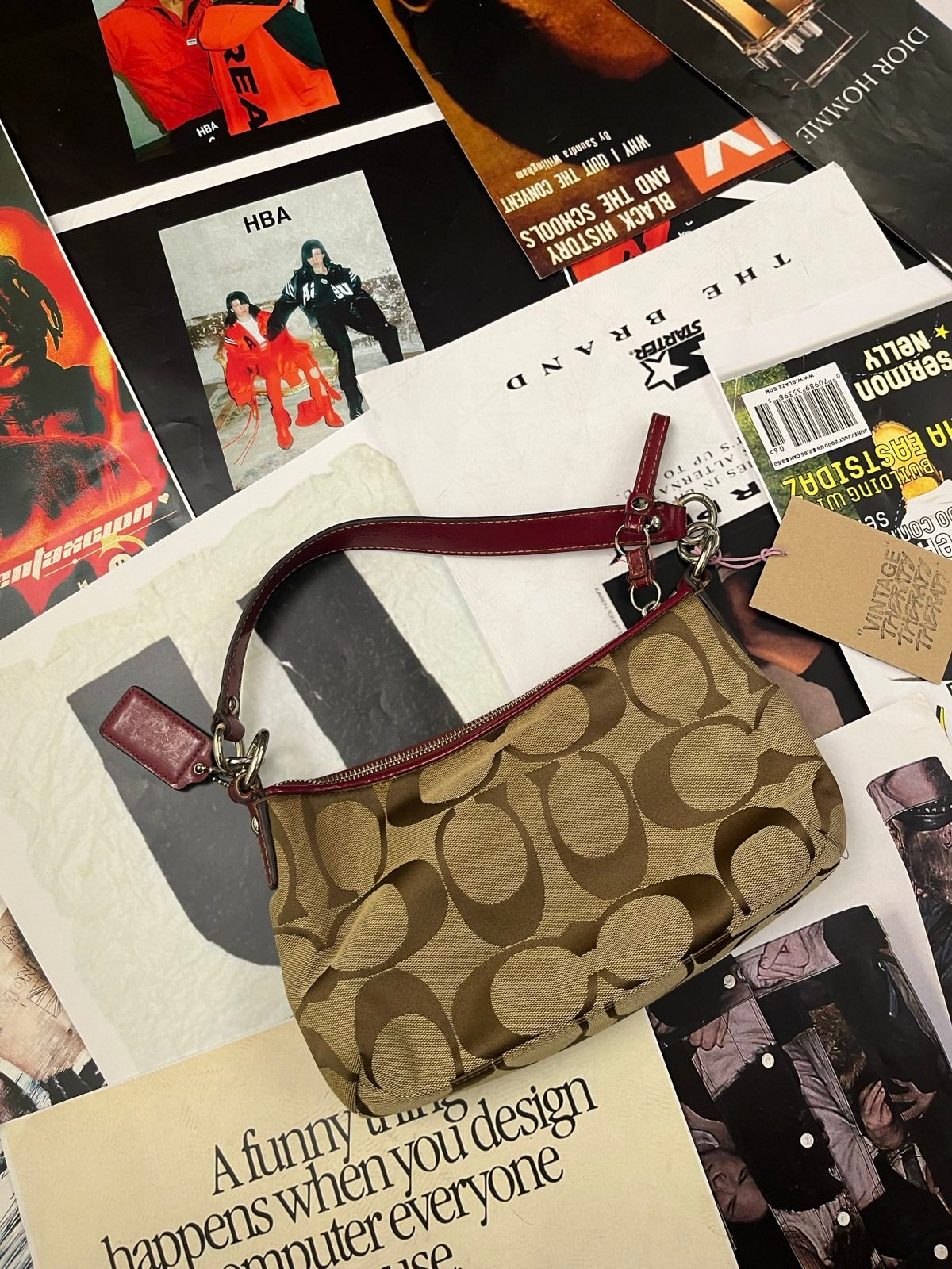 COACH kabelka hnědá s monogramem, červeným pruhem a koženými prvky (demi crossbody)