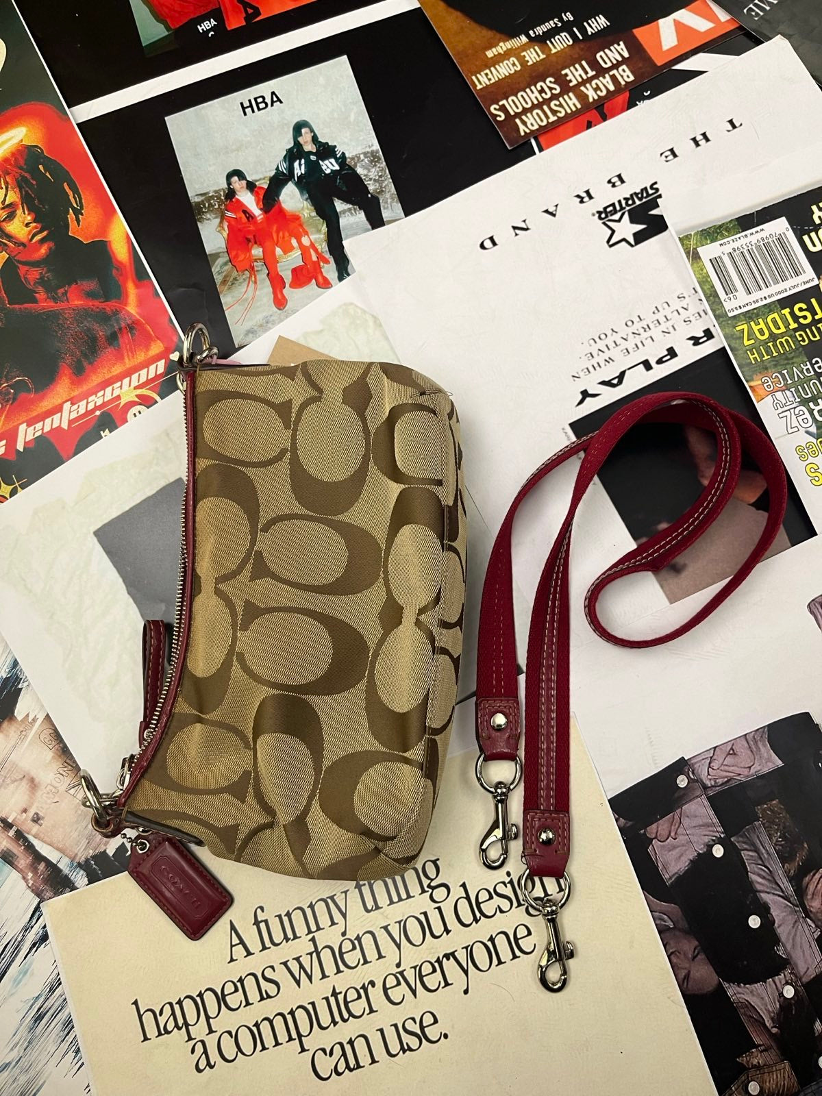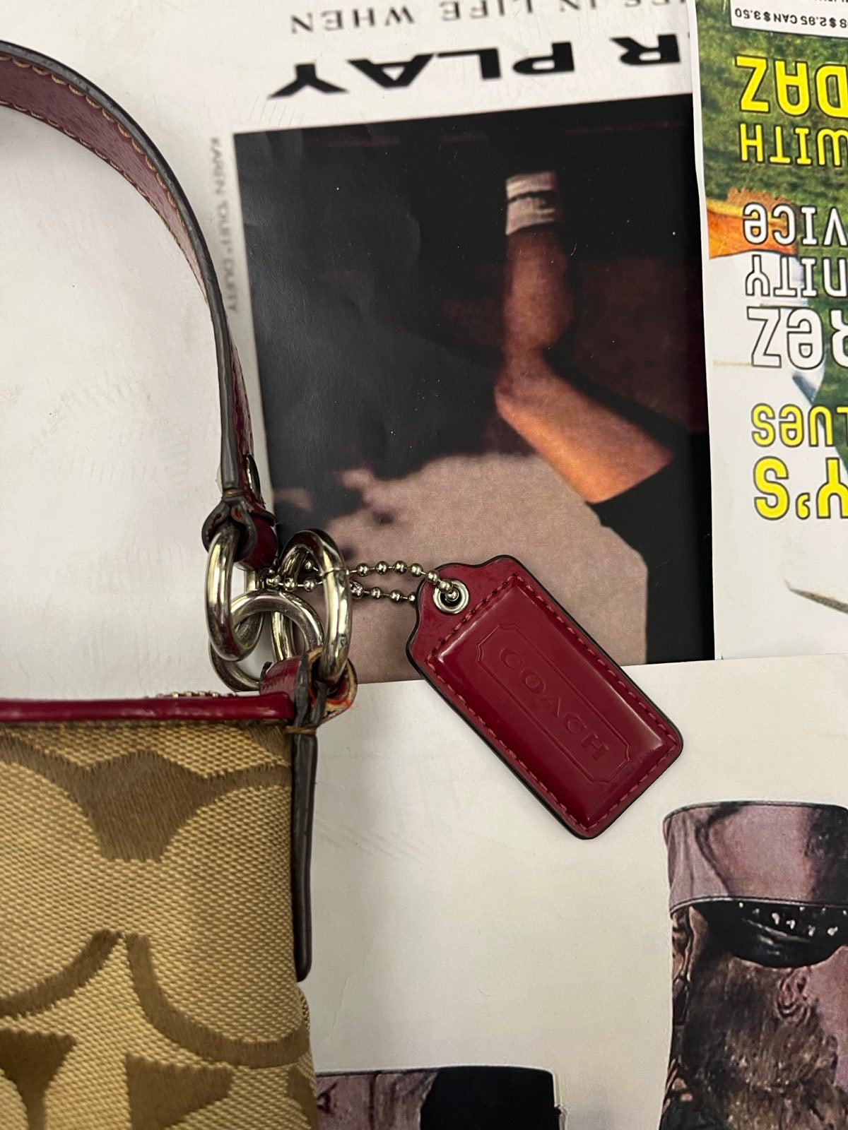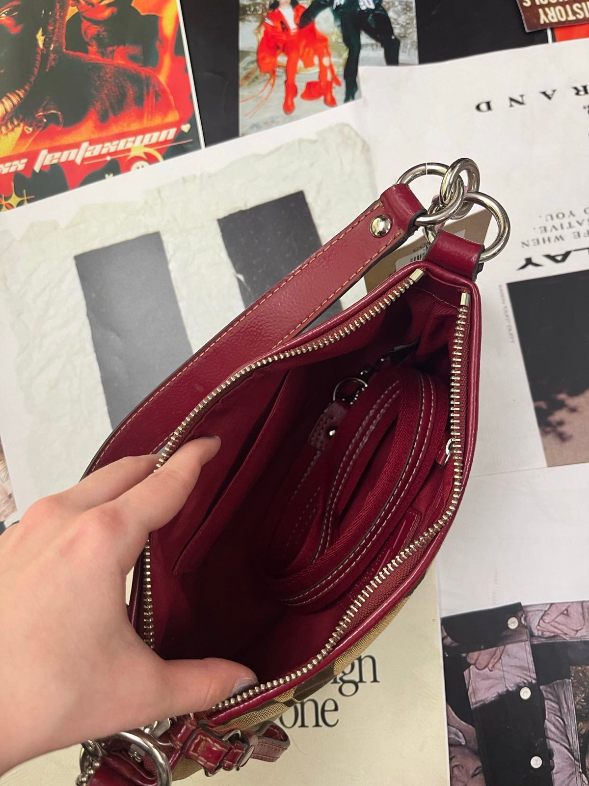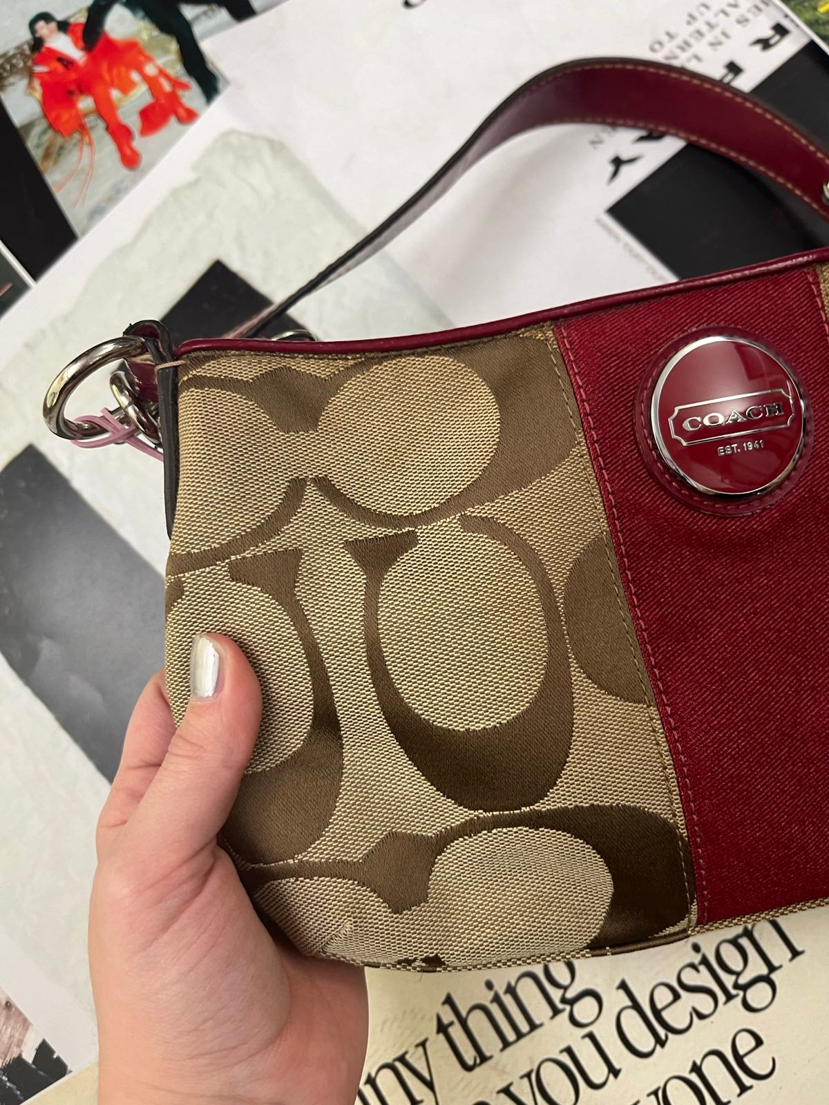 COACH kabelka hnědá s monogramem, červeným pruhem a koženými prvky (demi crossbody)