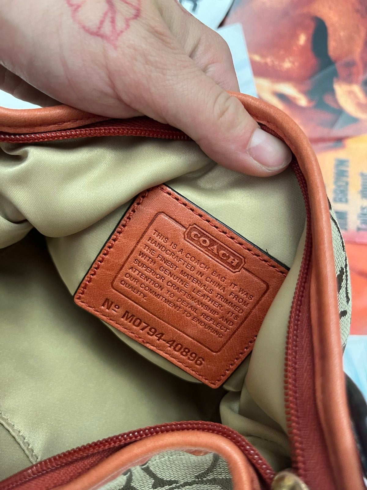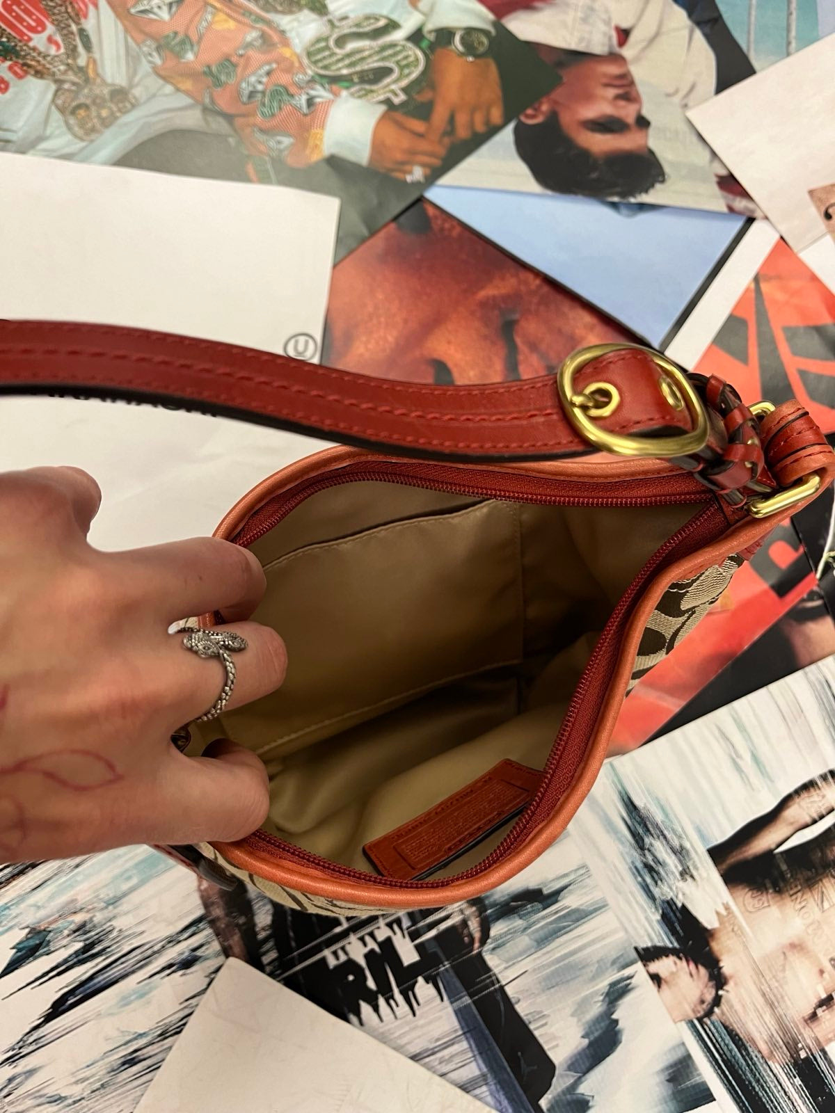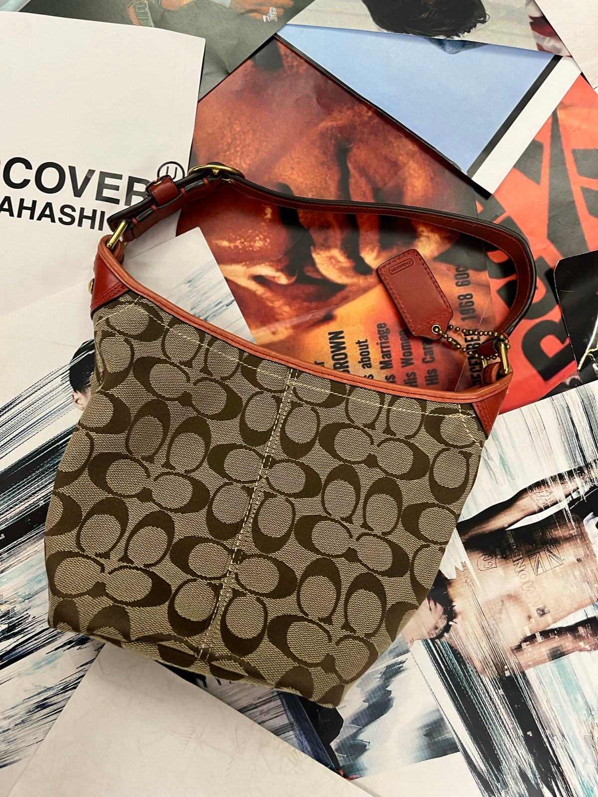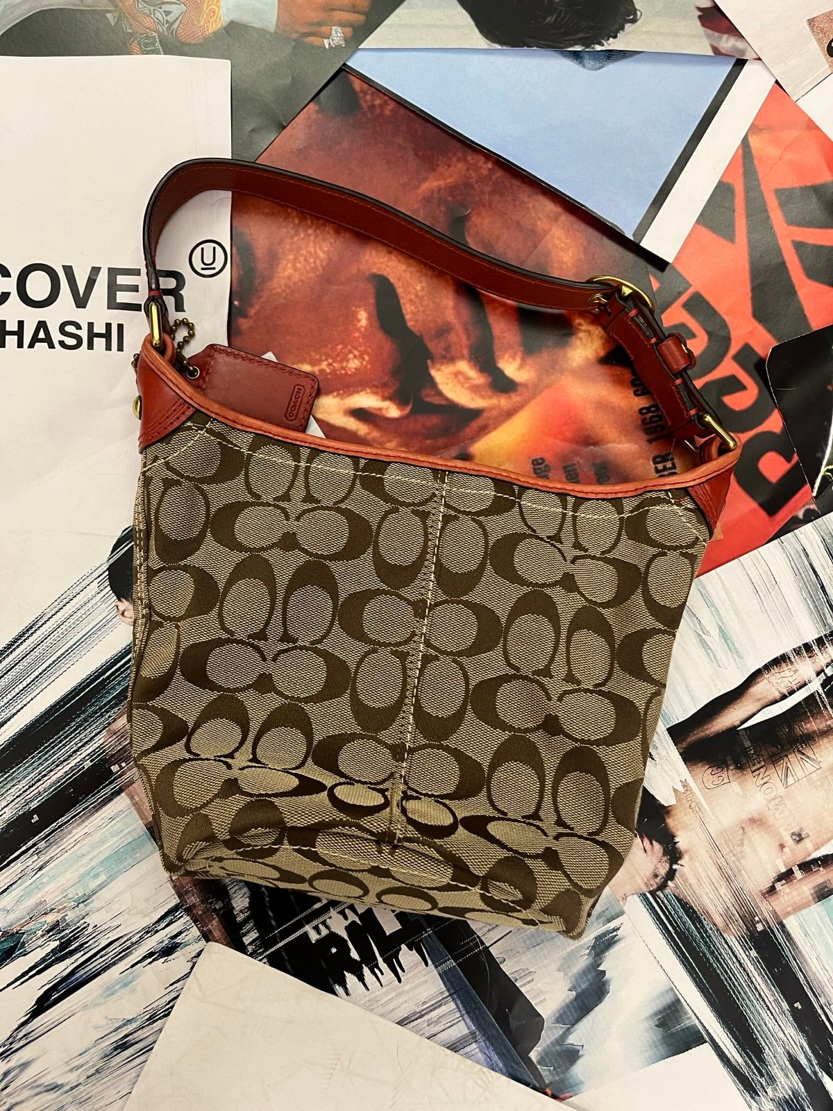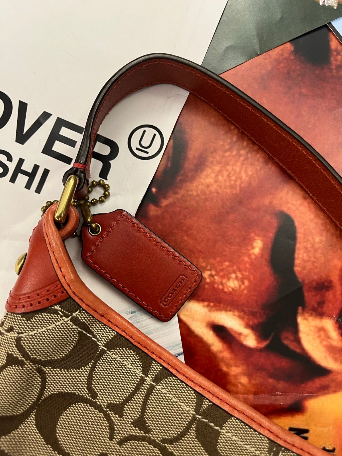Coach kabelka malá hnědá s monogramem a cihlovým koženým popruhem