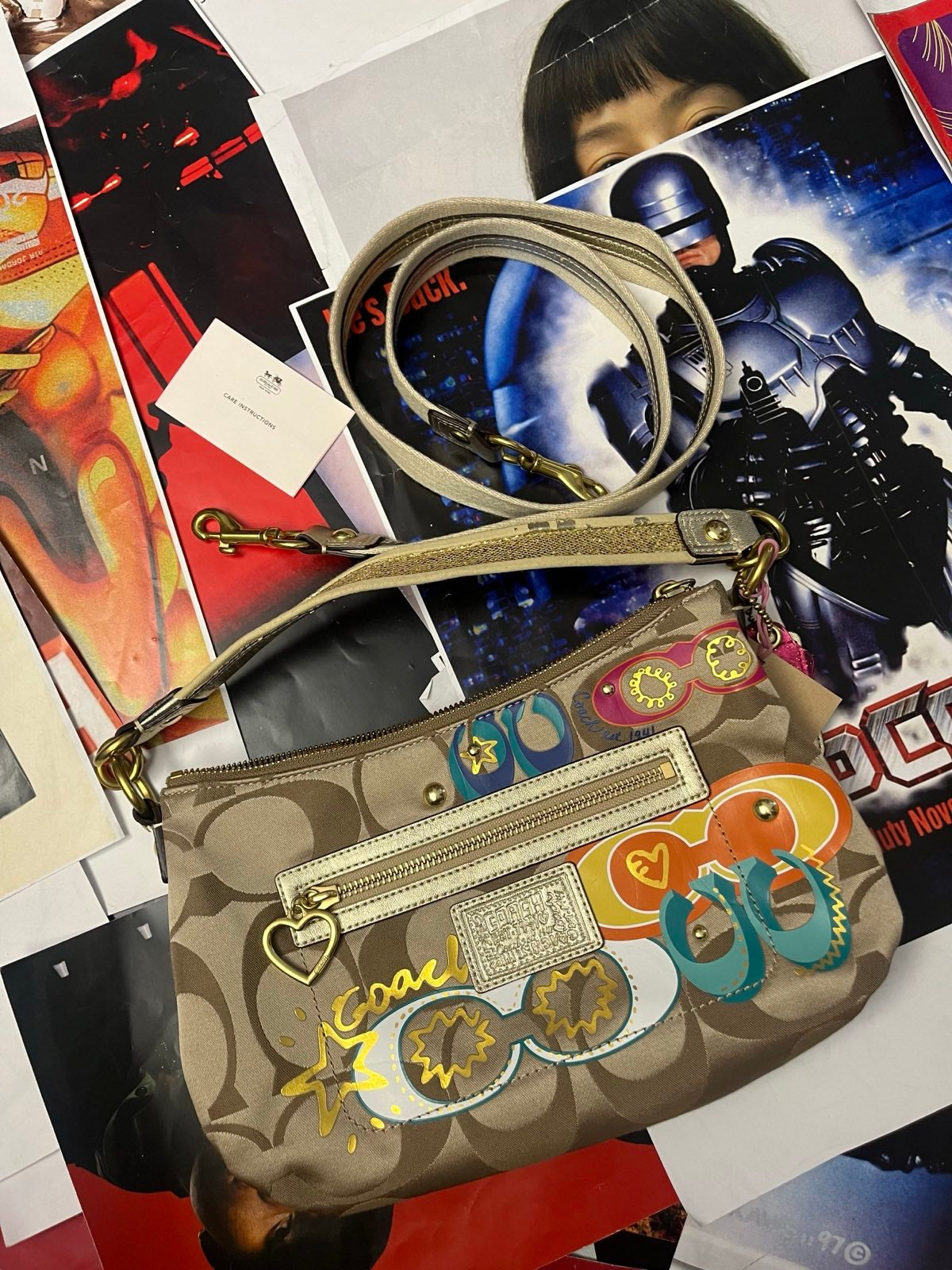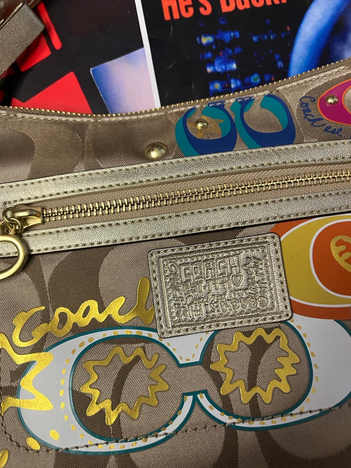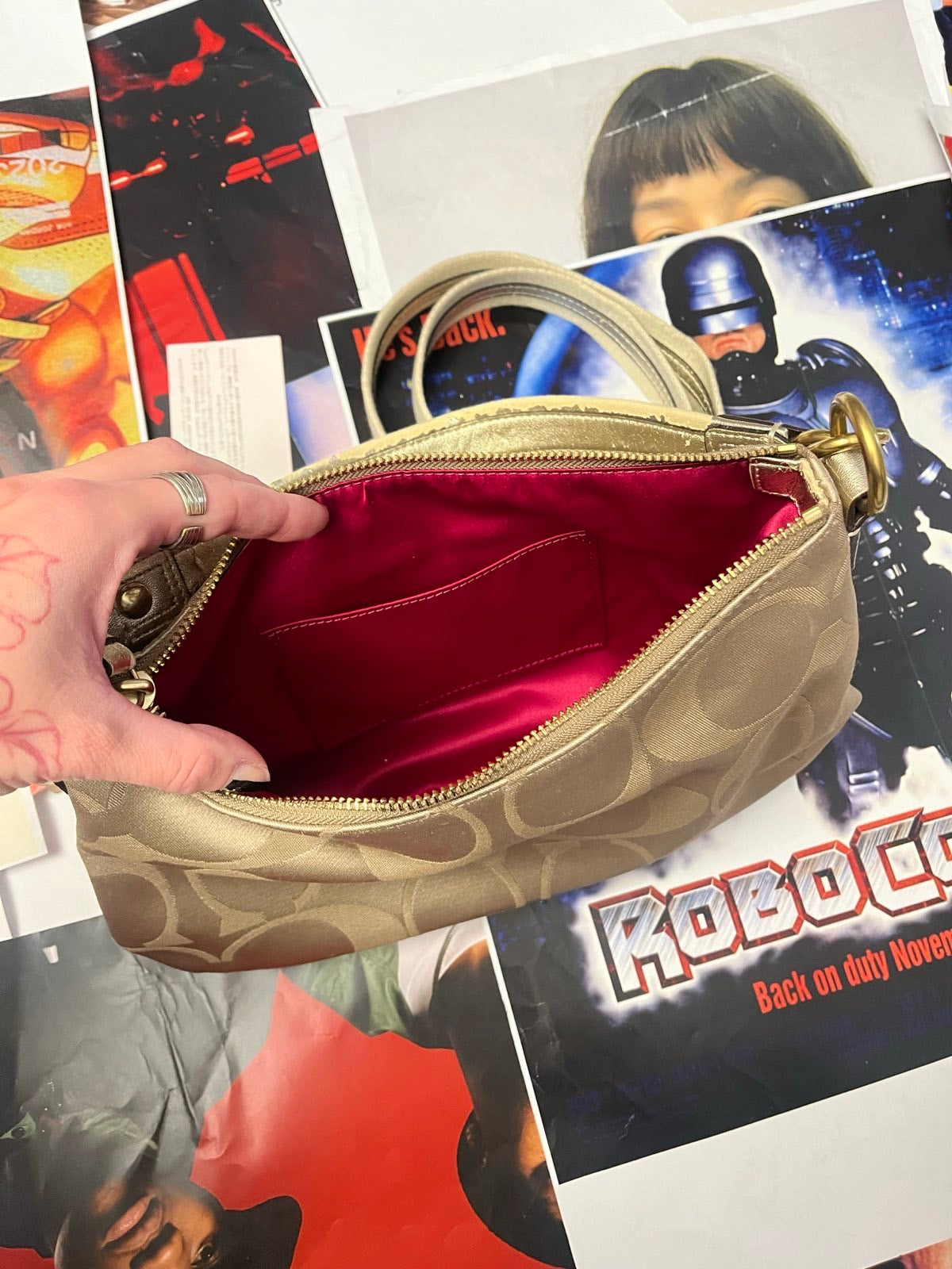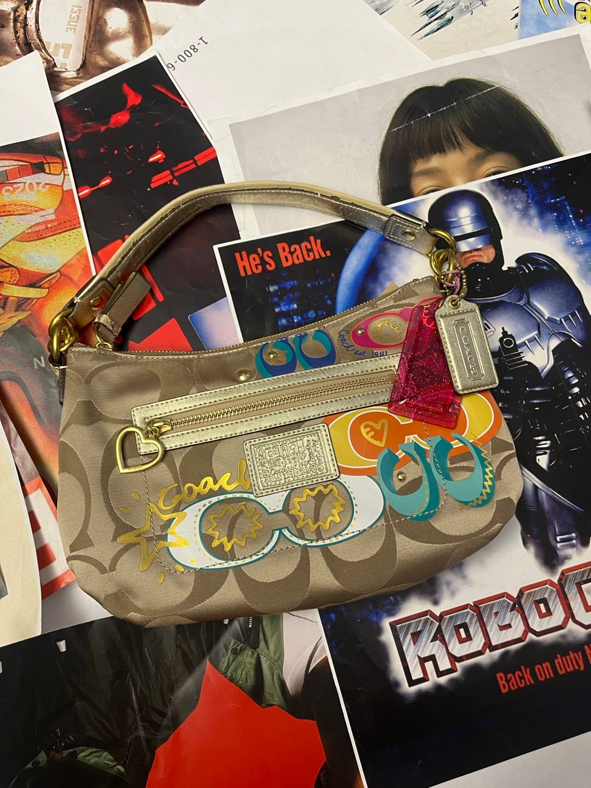 COACH kabelka malá zlatá s barevnou grafikou