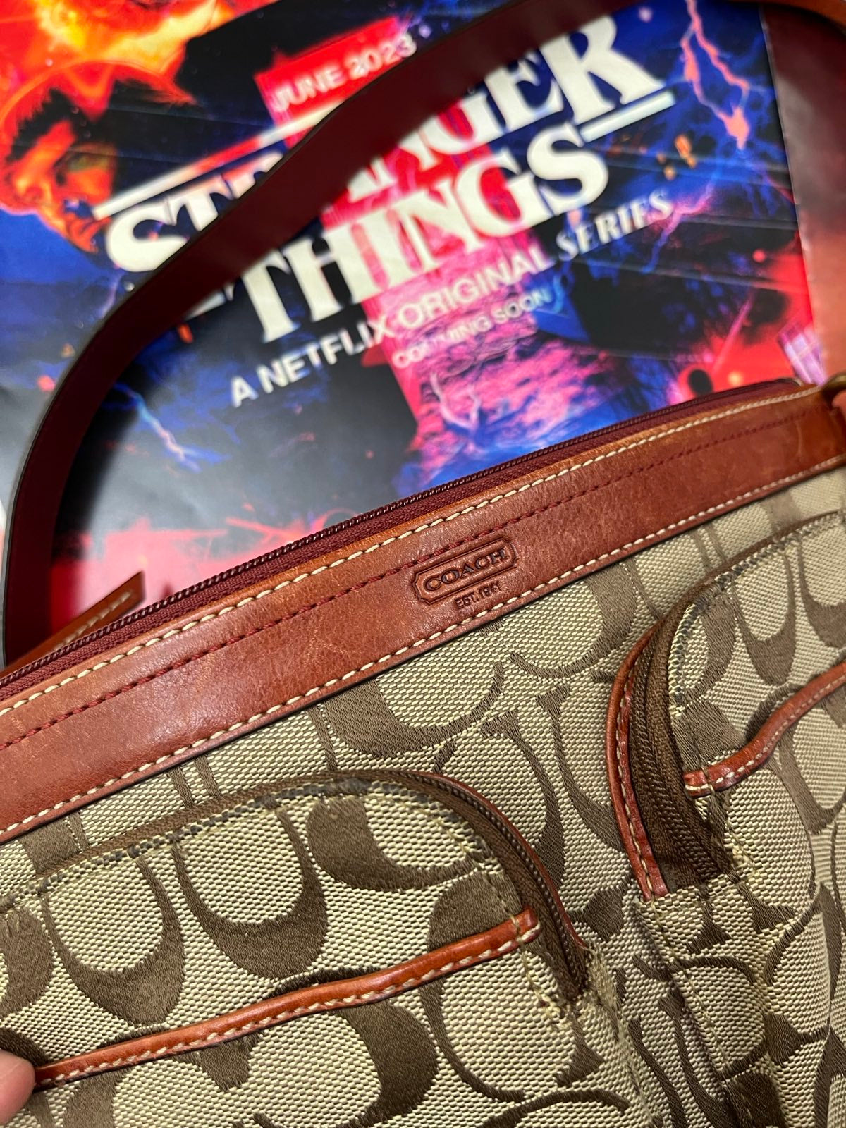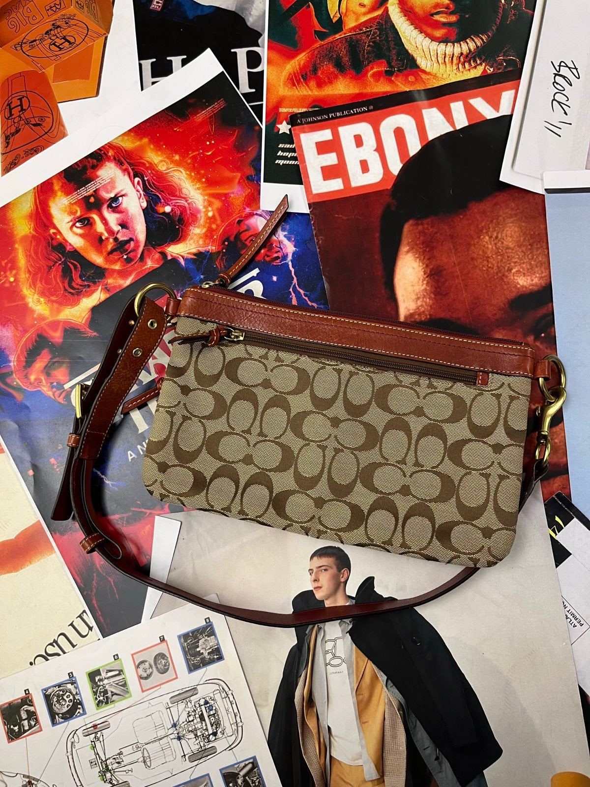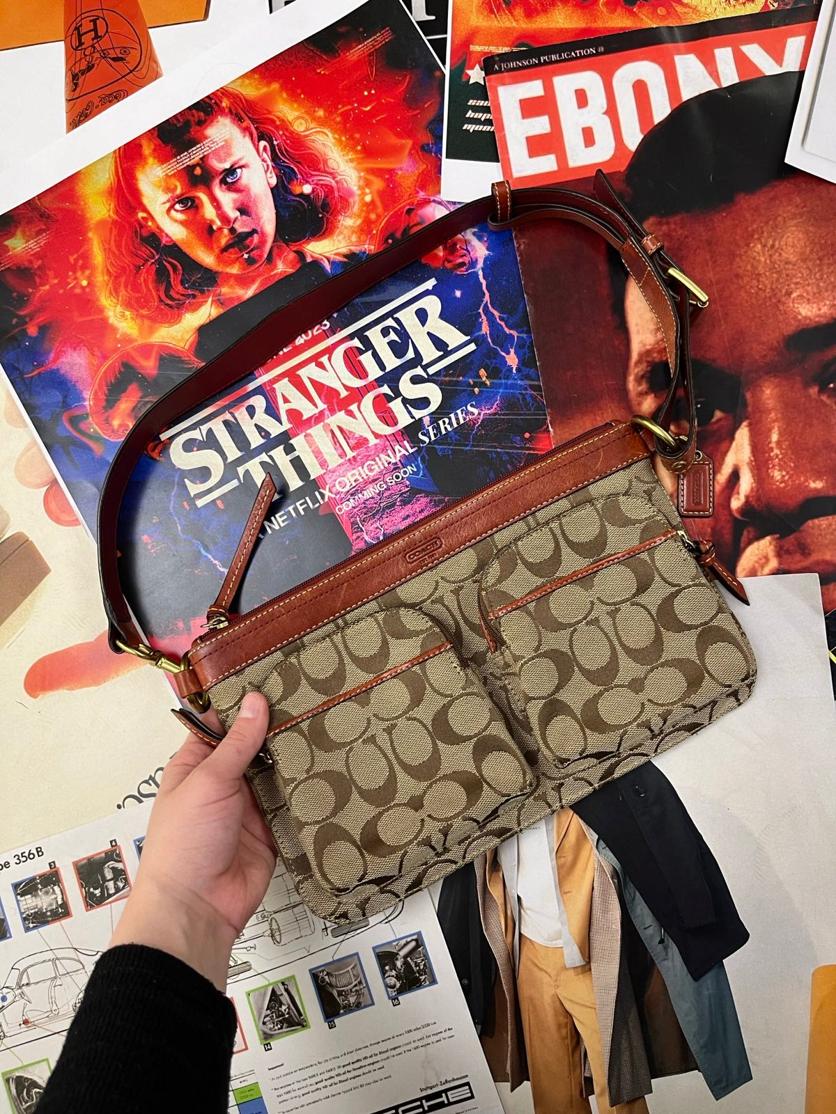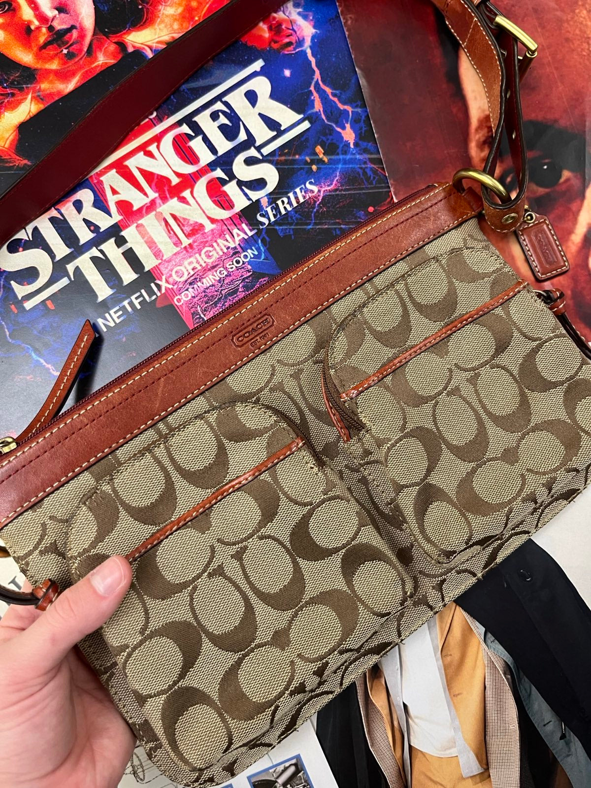 COACH kabelka menší béžová s monogramem a hnědými detaily