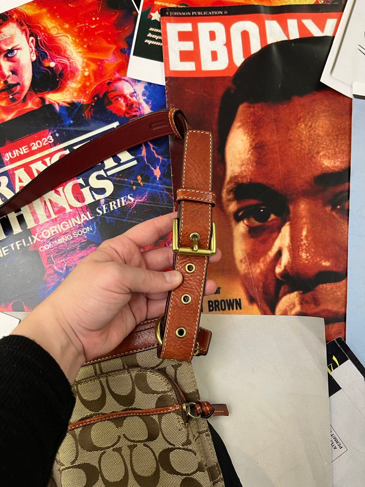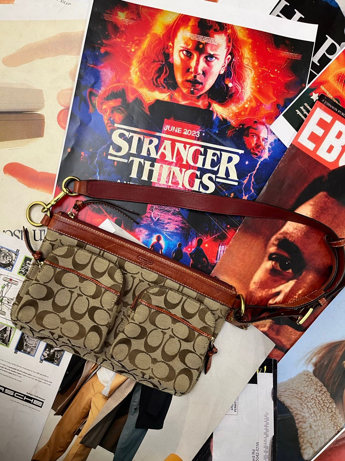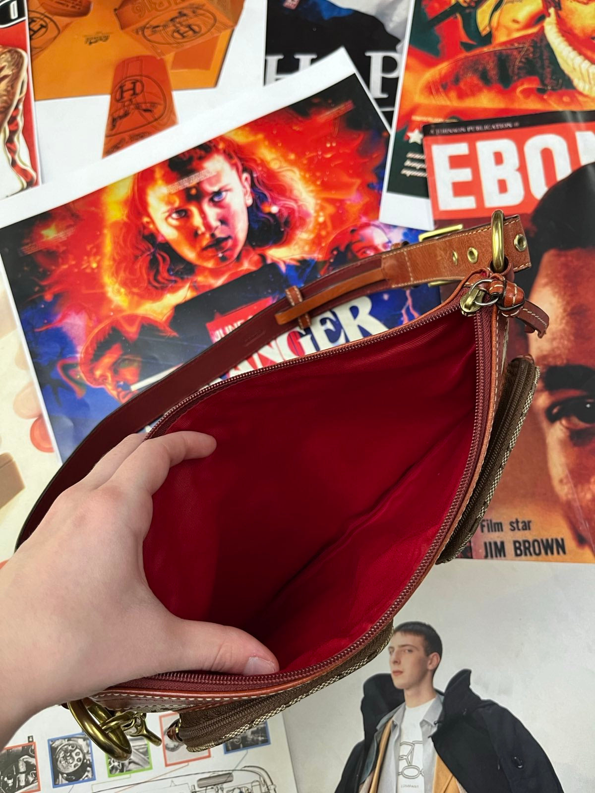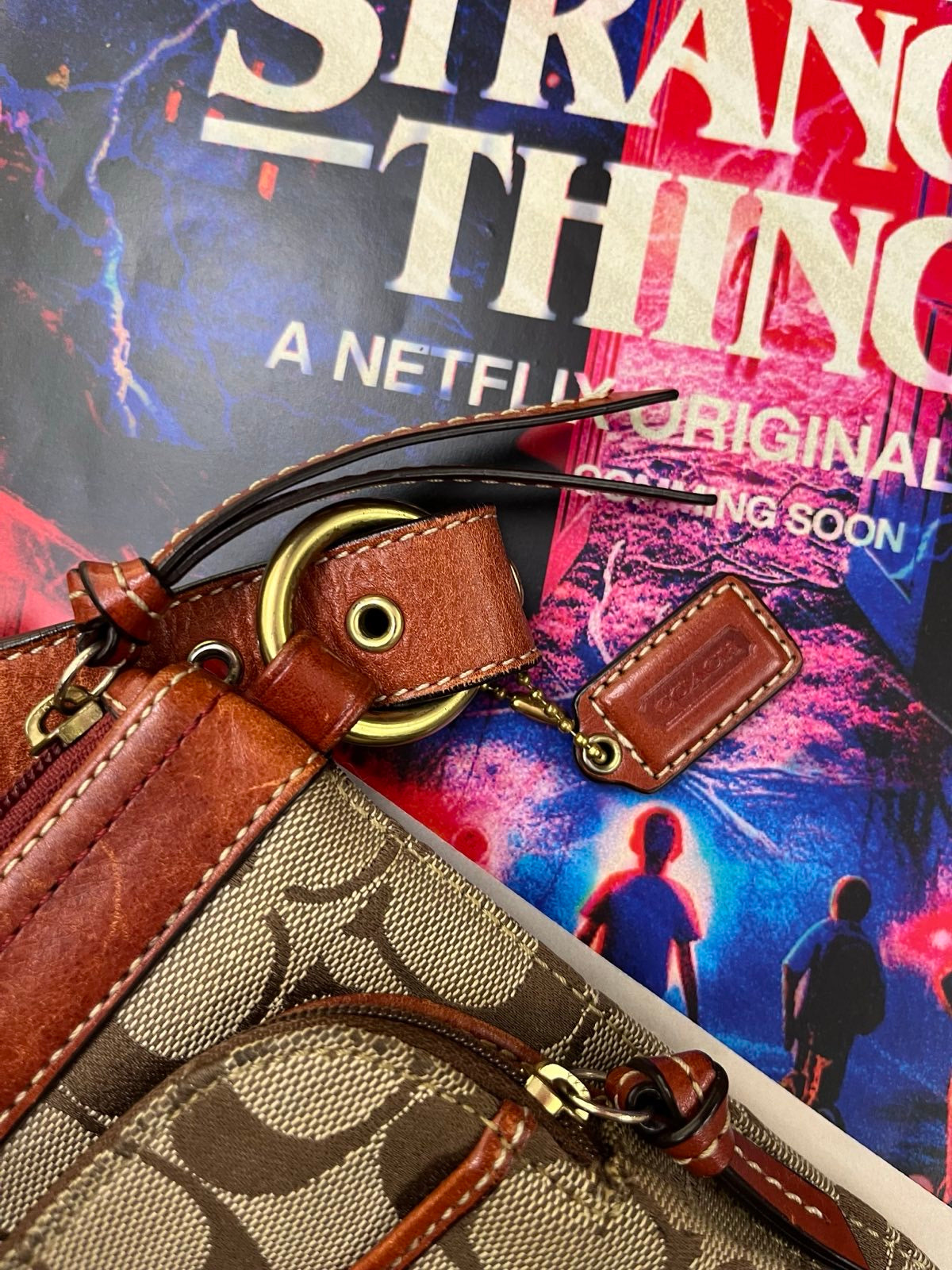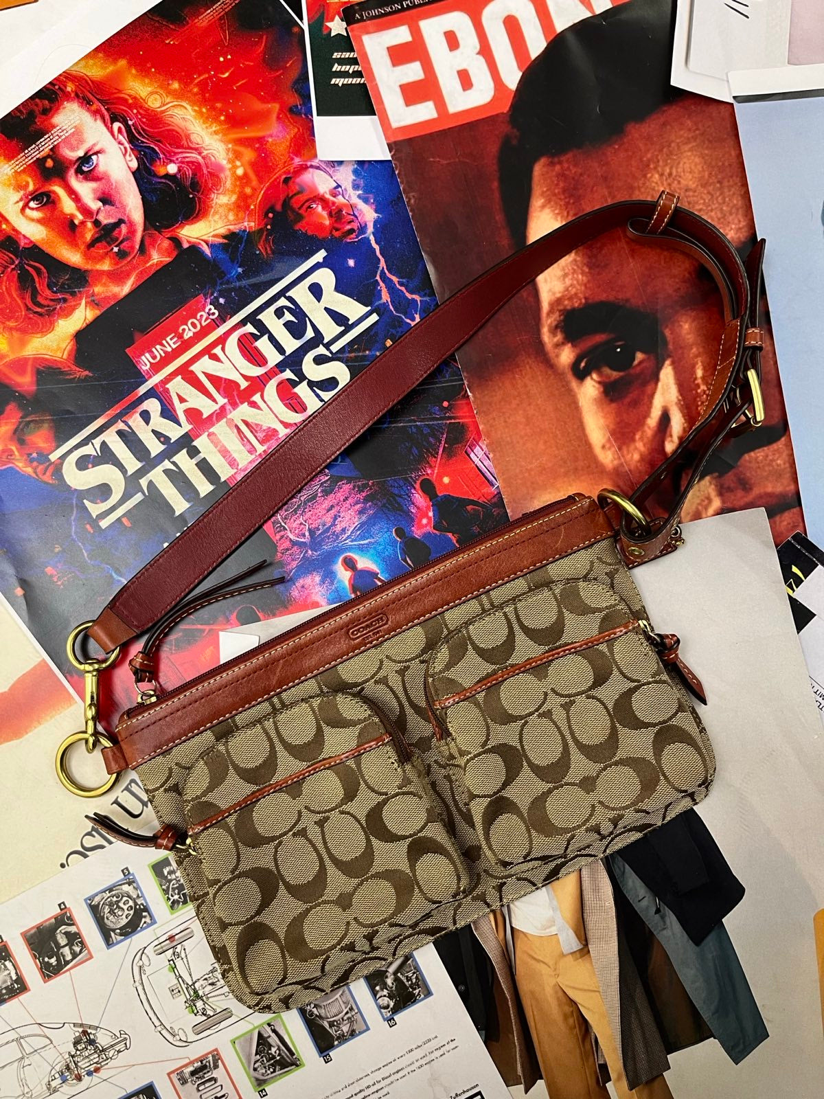 COACH kabelka menší béžová s monogramem a hnědými detaily