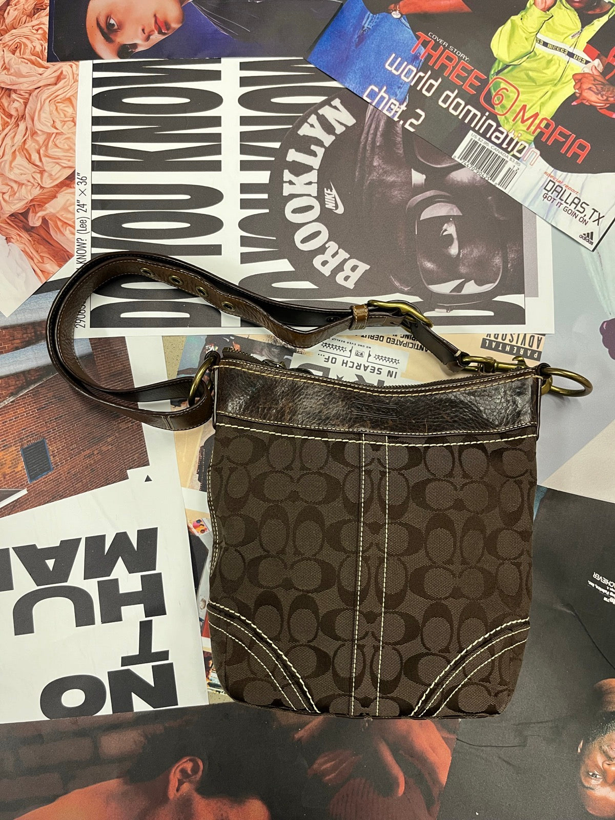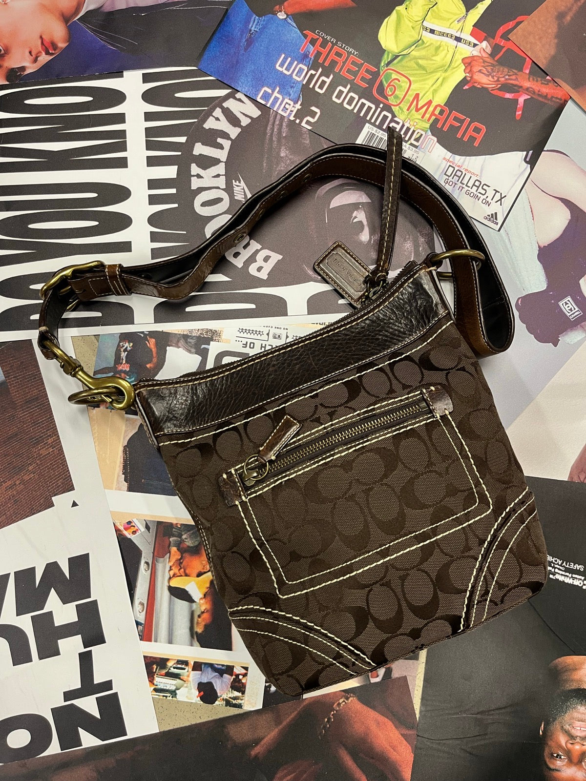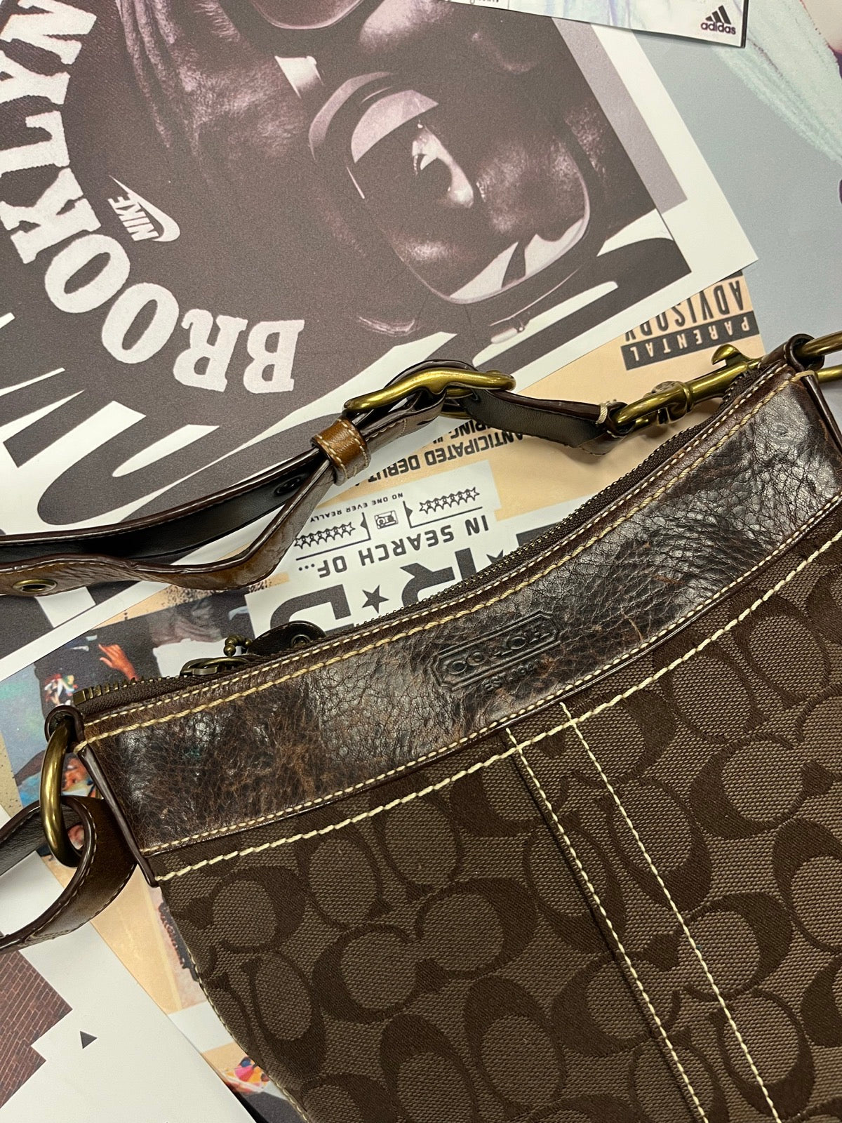 Coach kabelka přes rameno tmavě hnědá s monogramem značky a béžovým stitchingem
