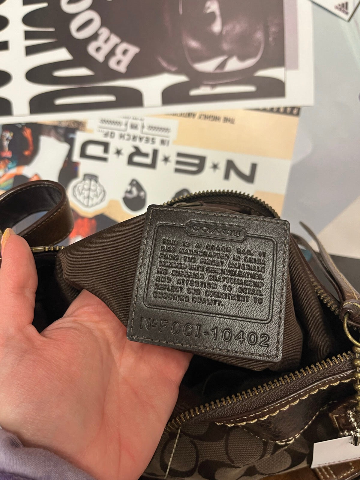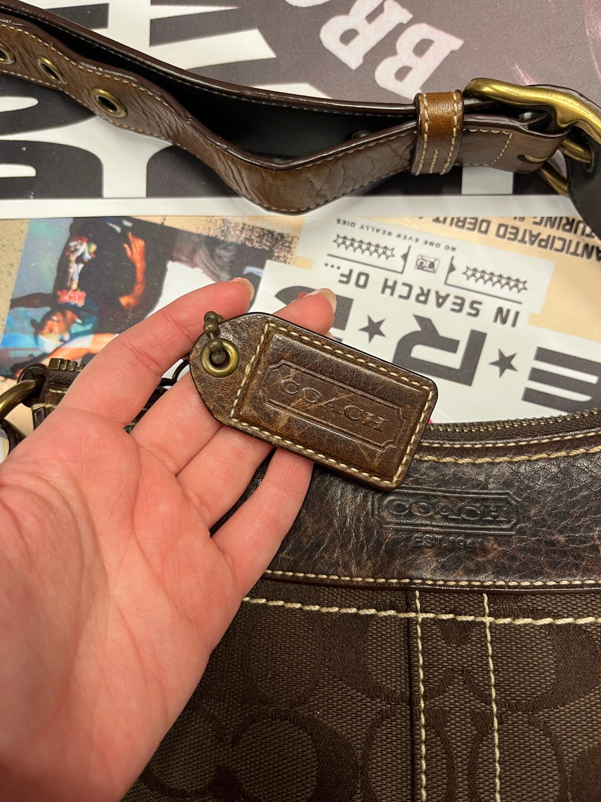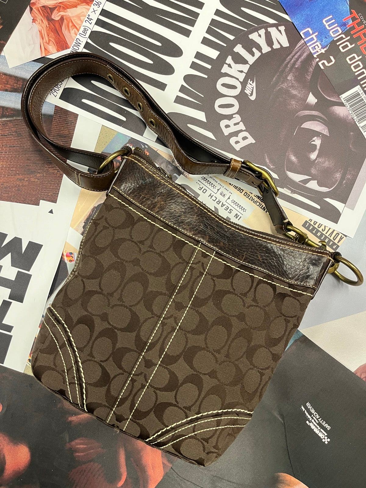 Coach kabelka přes rameno tmavě hnědá s monogramem značky a béžovým stitchingem