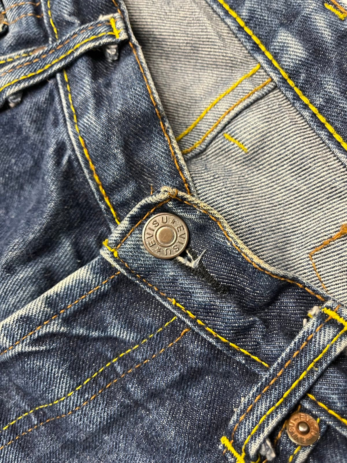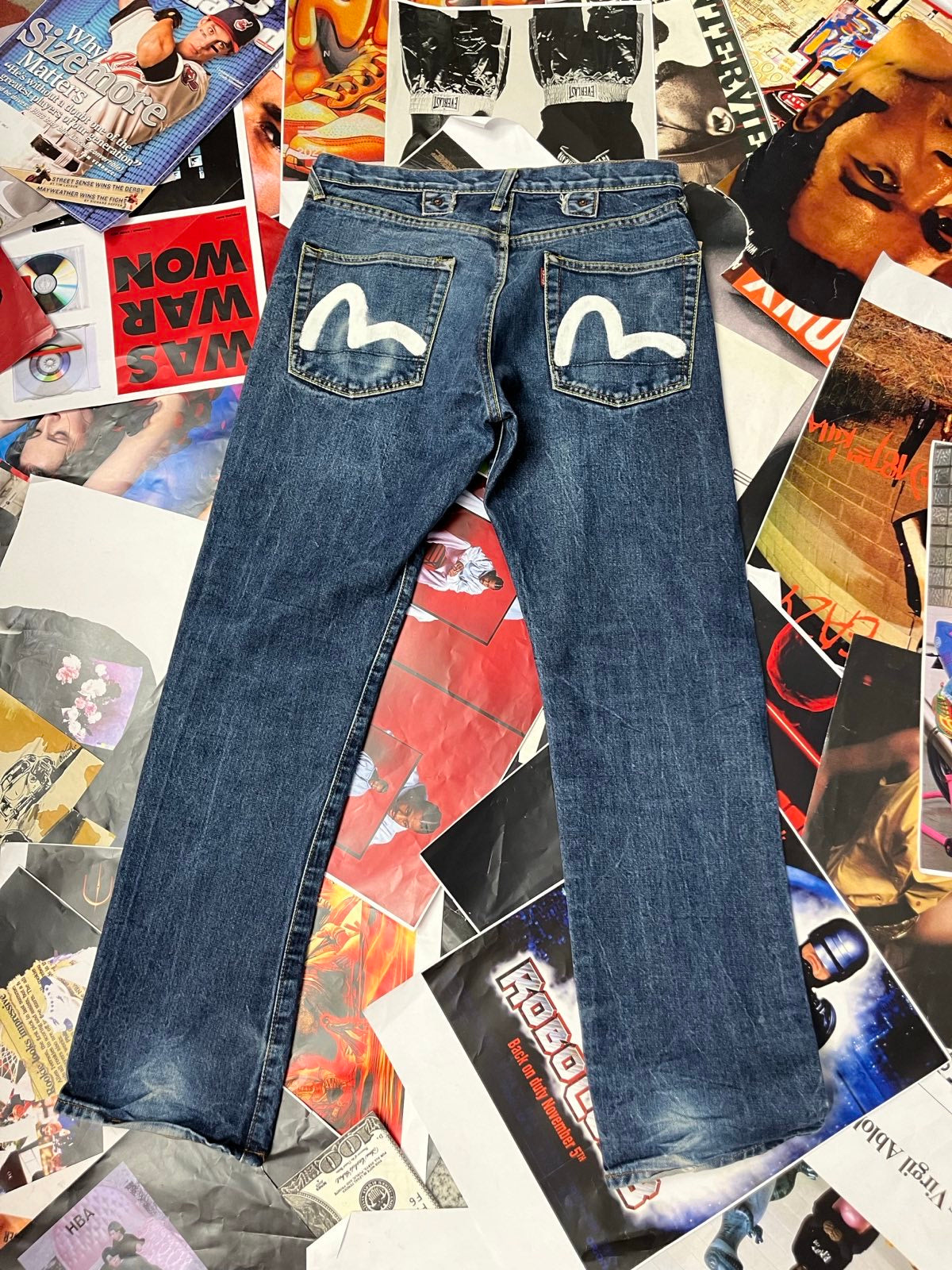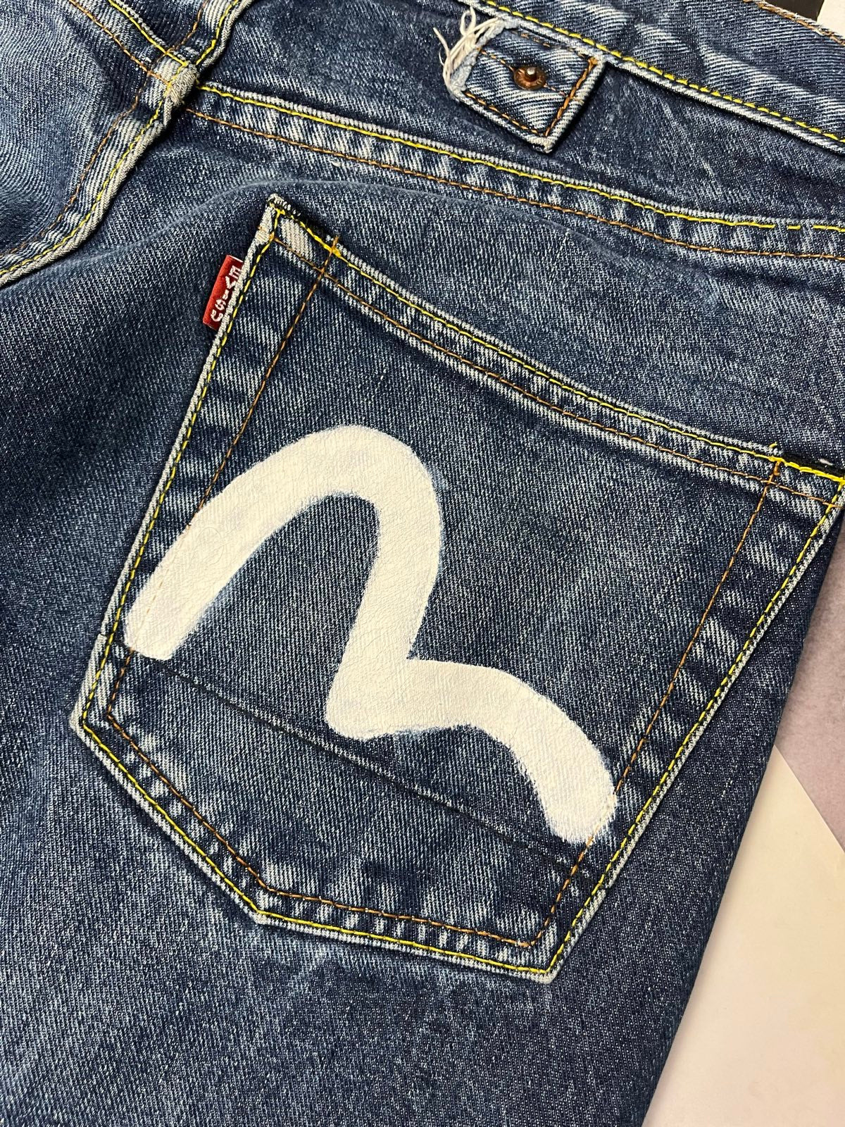 (L) Evisu modré DŽÍNY s bílým logem na zadních kapsách