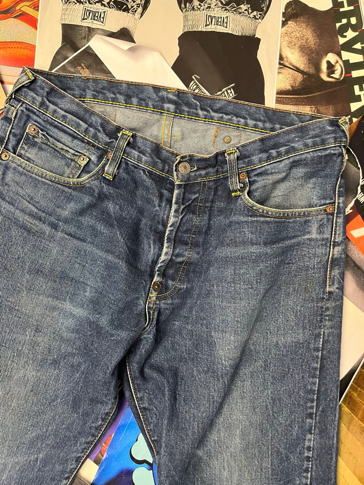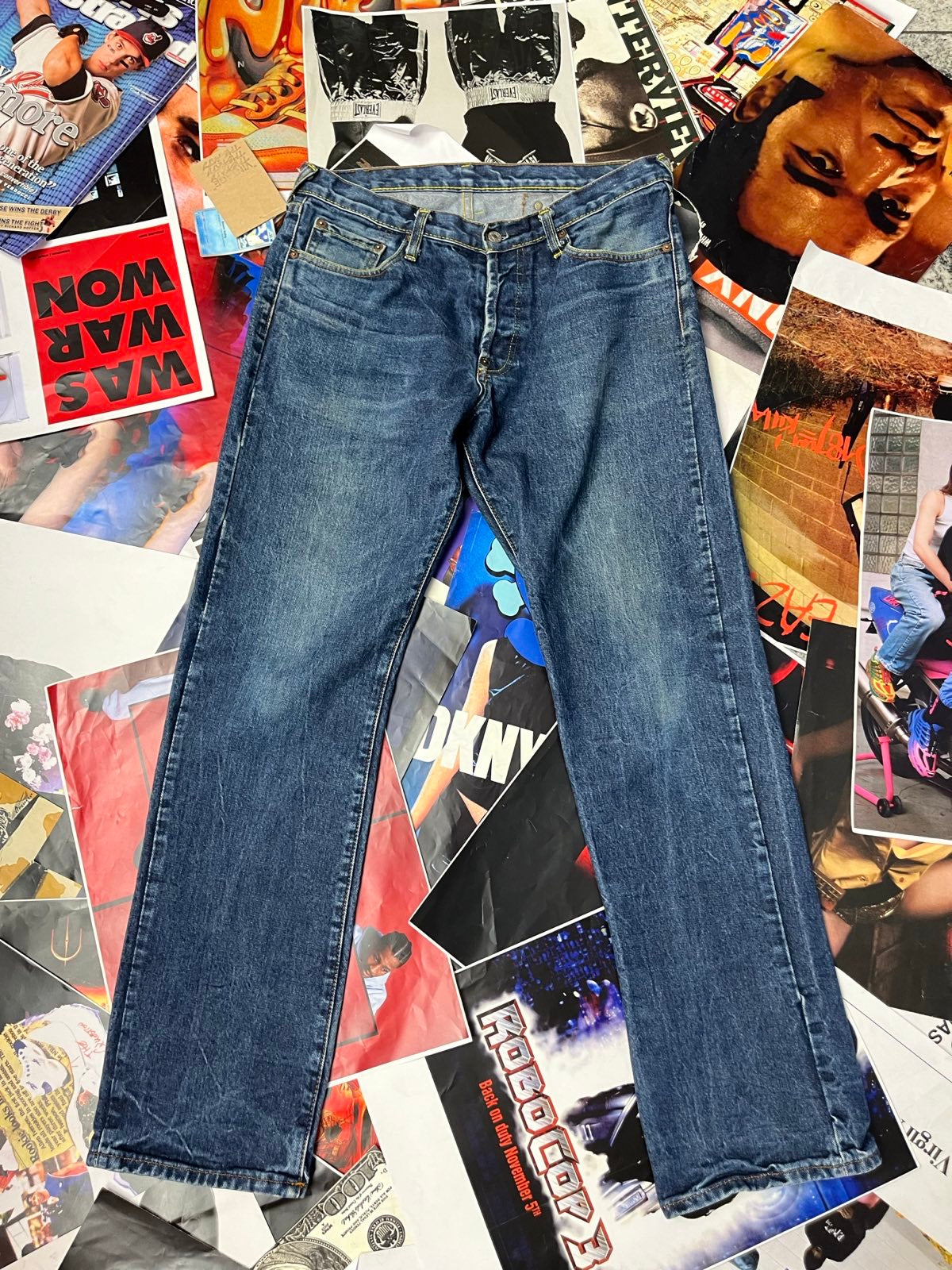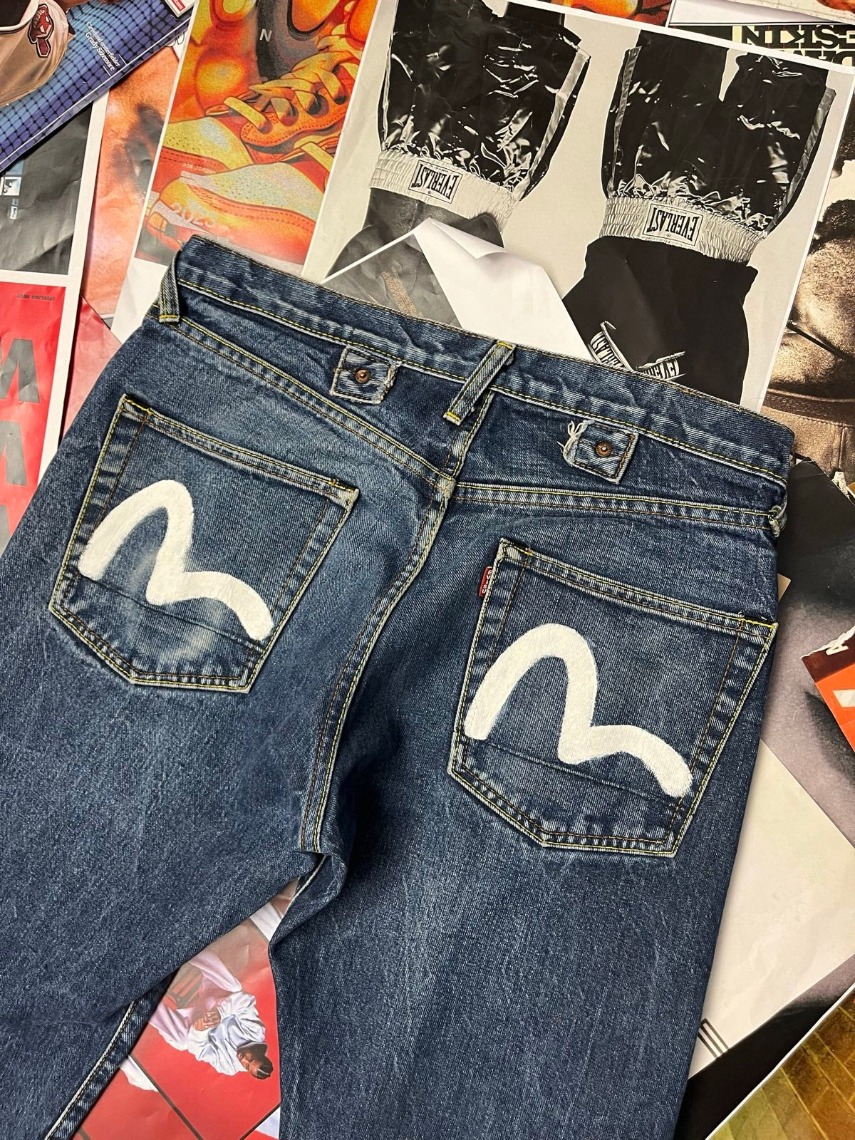 (L) Evisu modré DŽÍNY s bílým logem na zadních kapsách