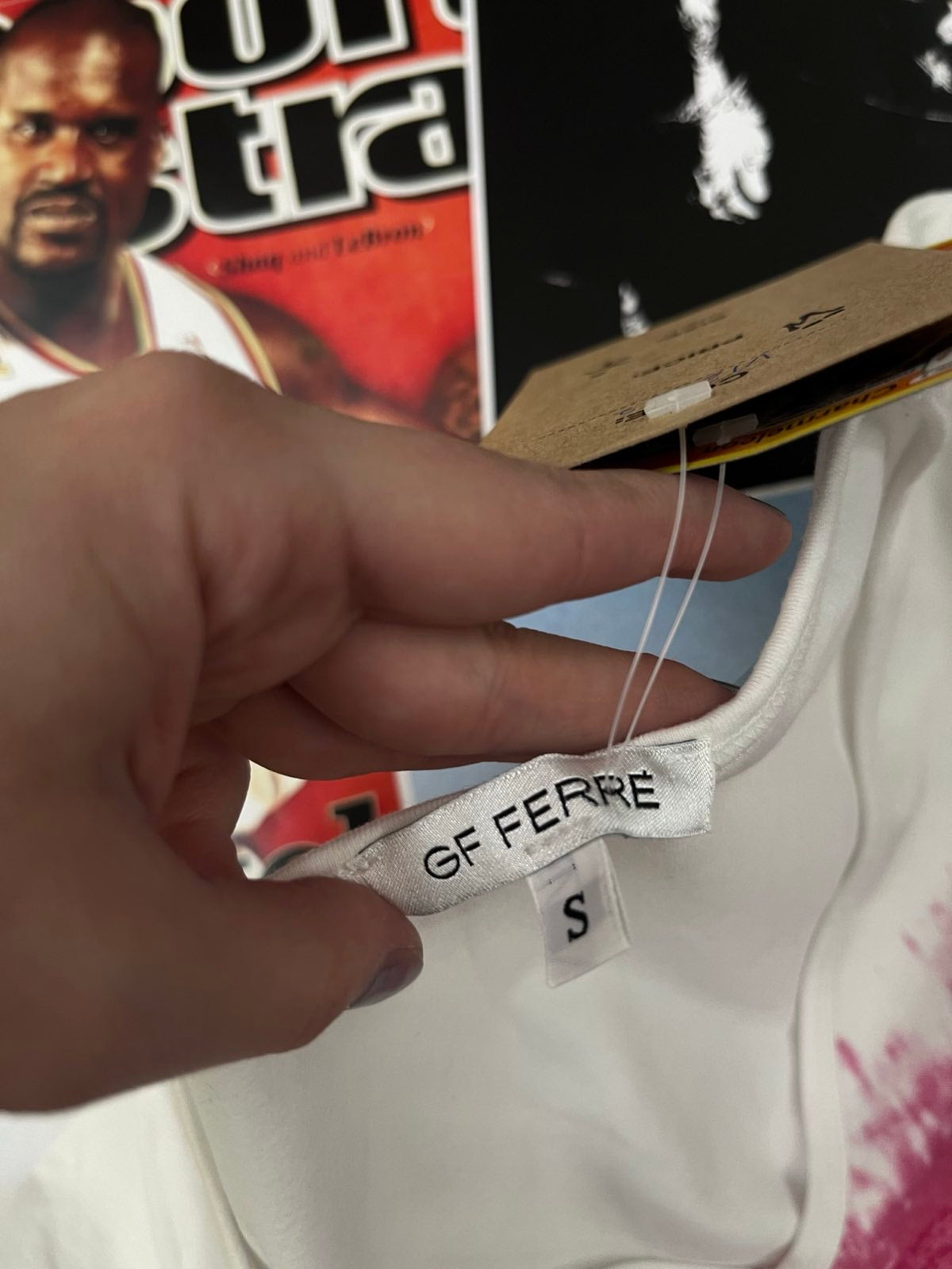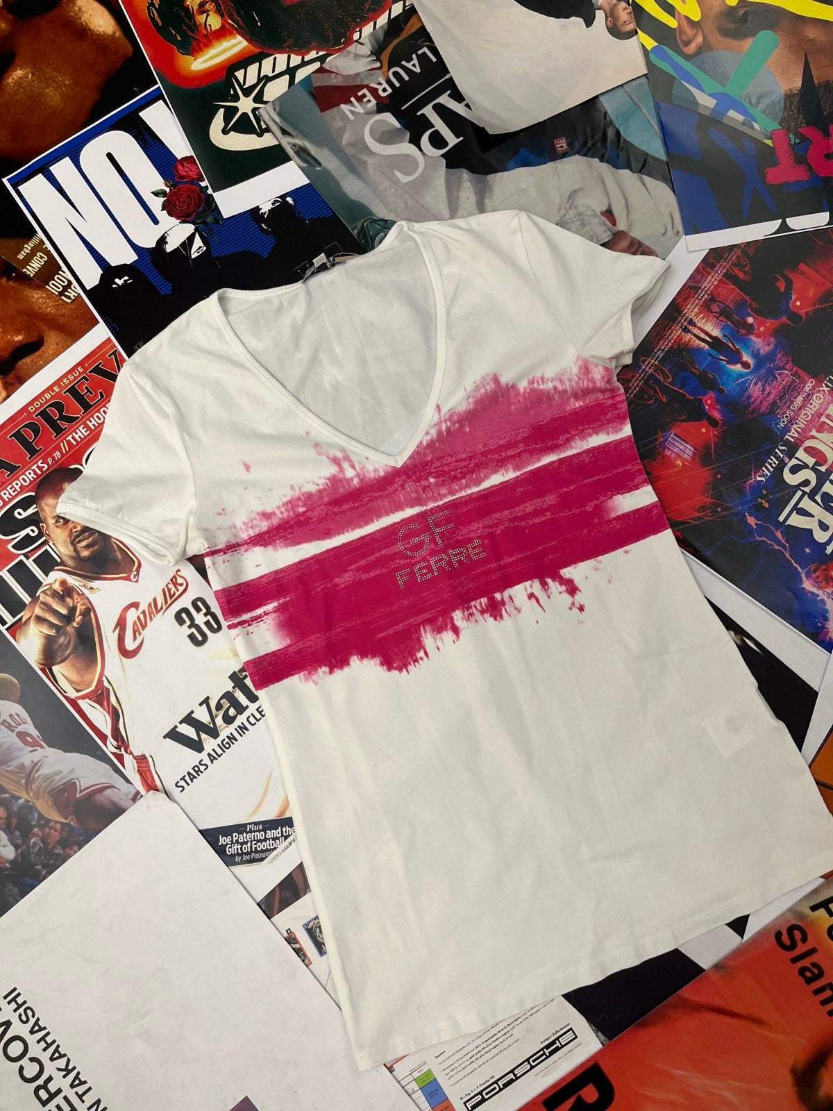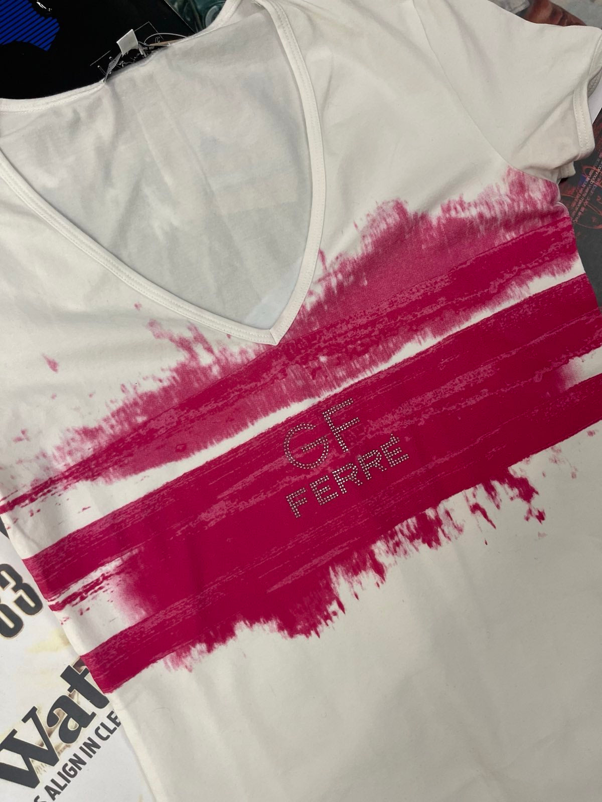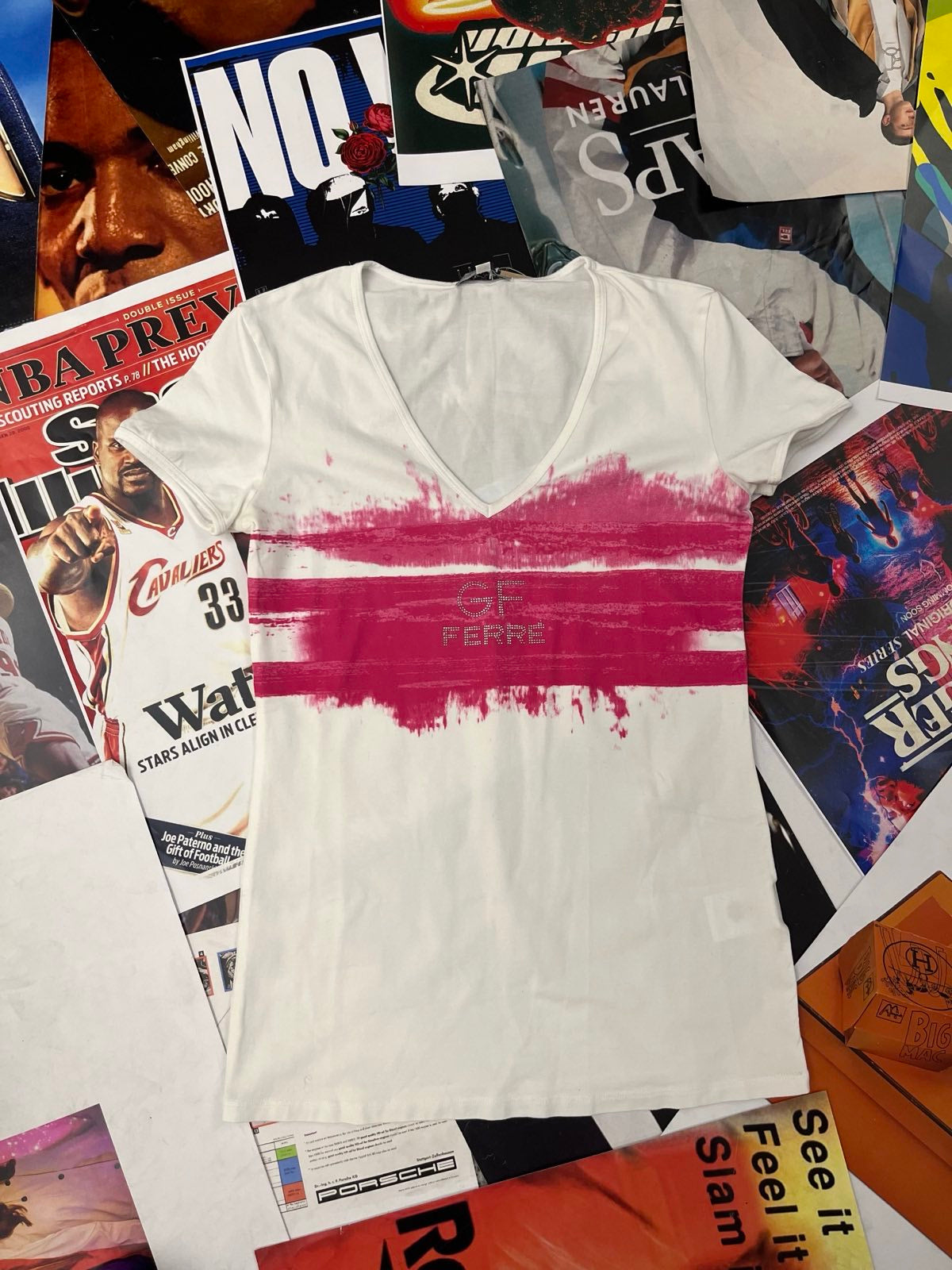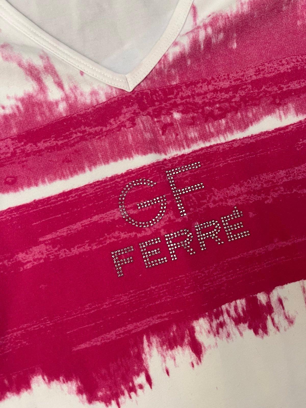 (S) GF Ferré TRIKO dámské bílé s růžovým flekem na hrudi, nápis z kamínků