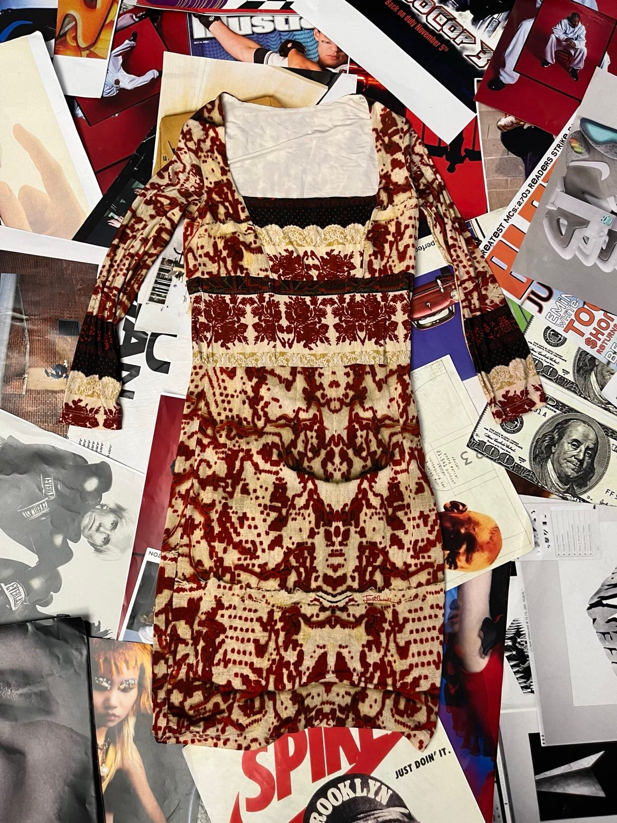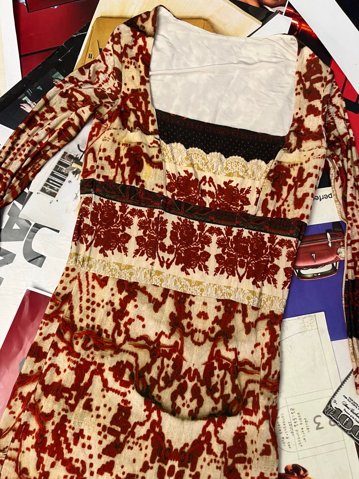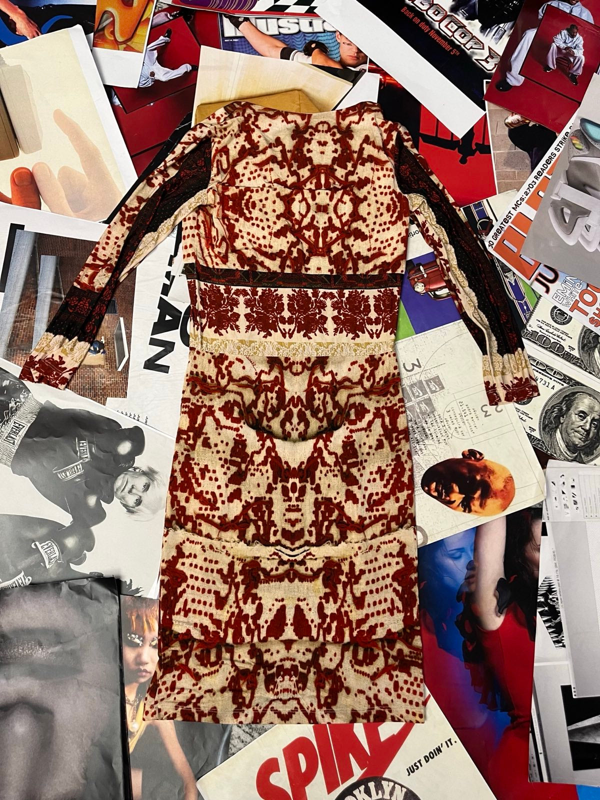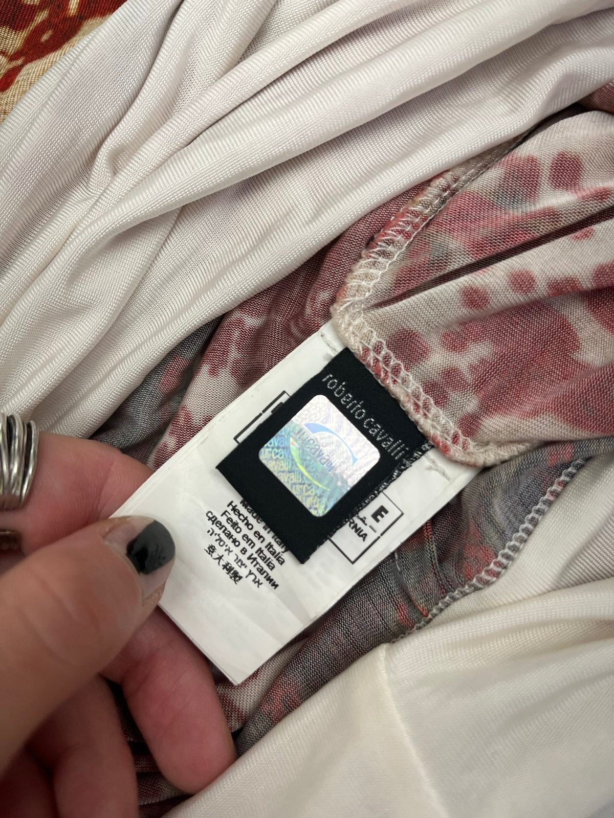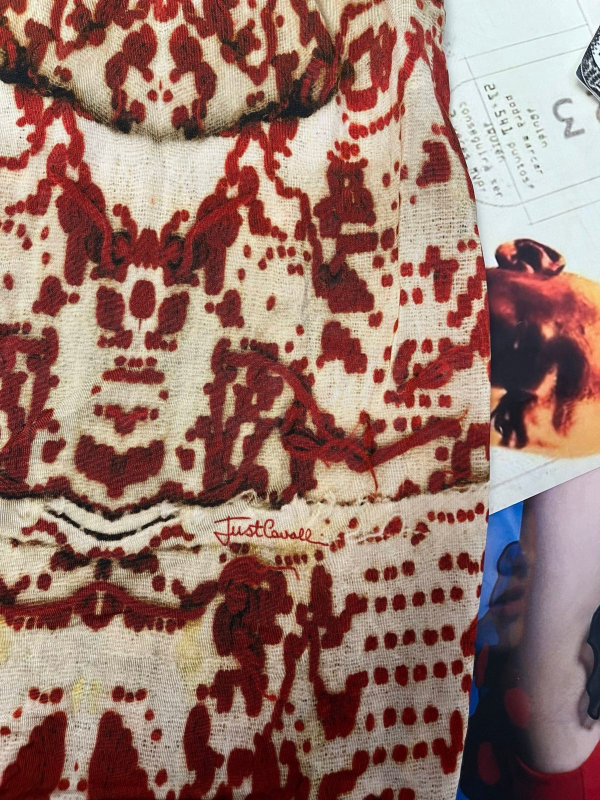 Just Cavalli šaty midi uplé béžová s bordo, krajky, černé detaily M