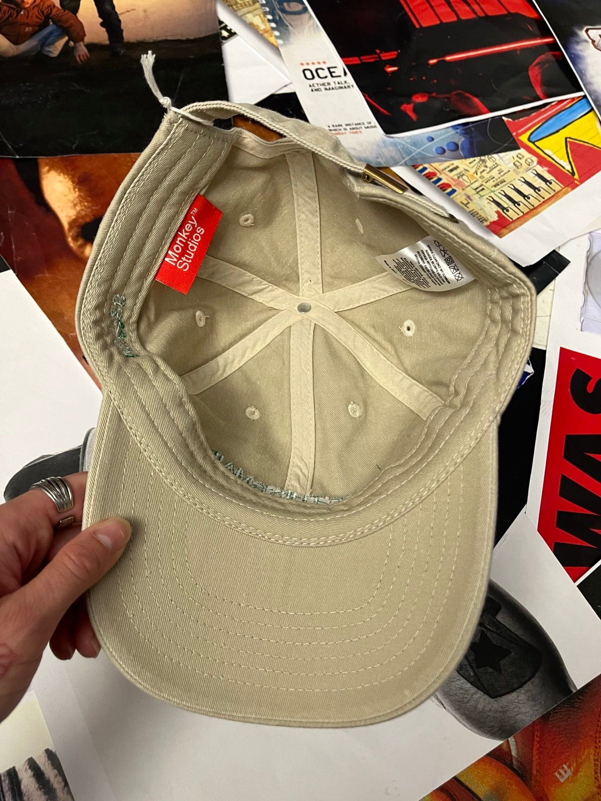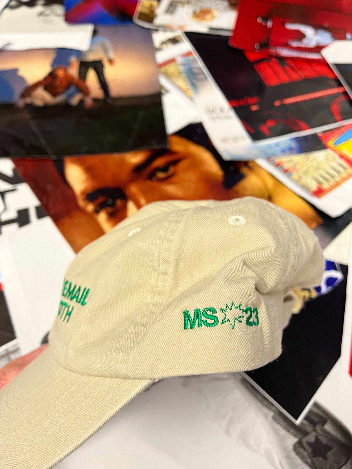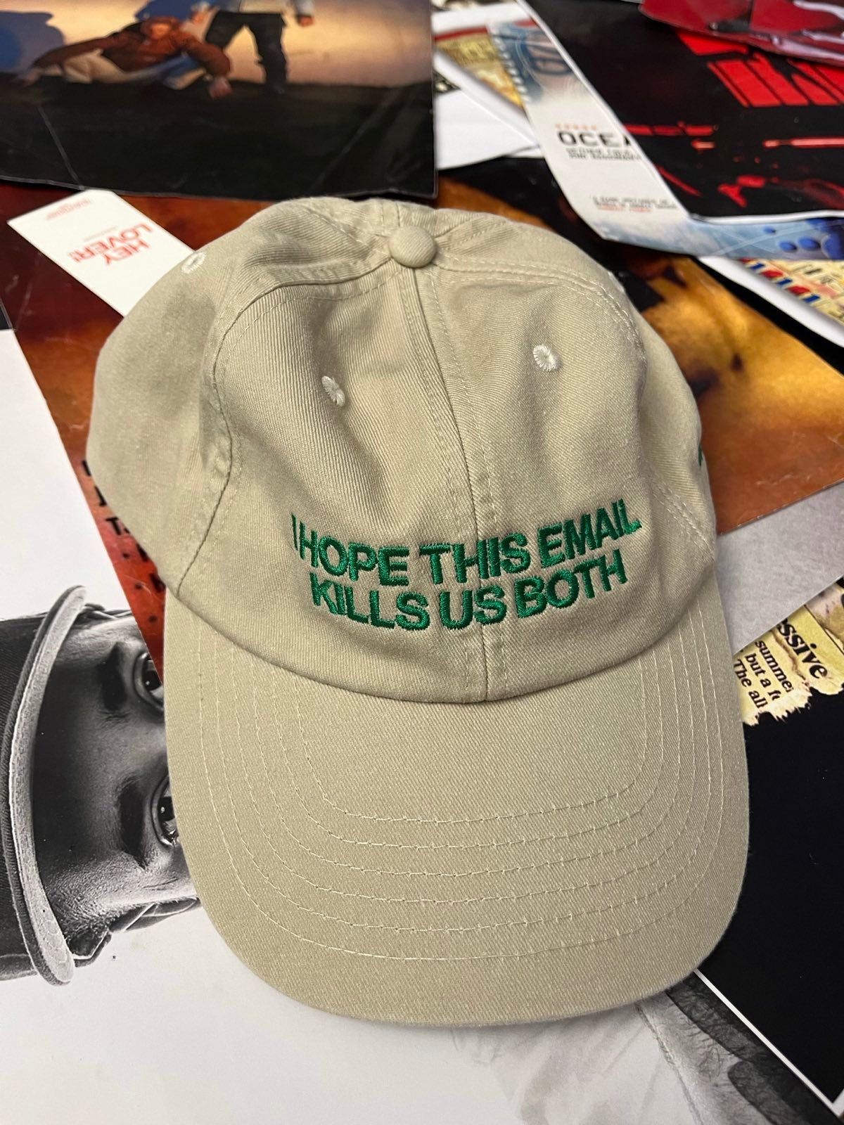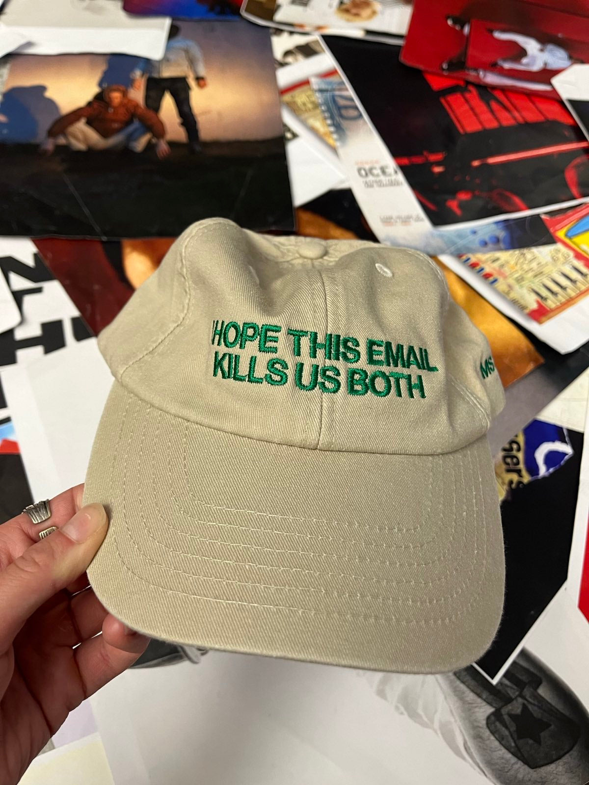 Kšiltovka béžová se zeleným nápisem "I hope this email kills us both"