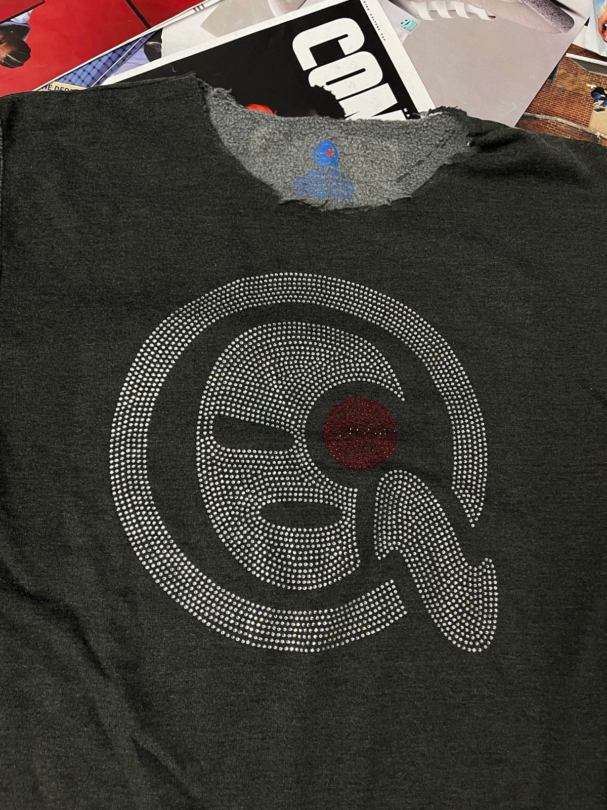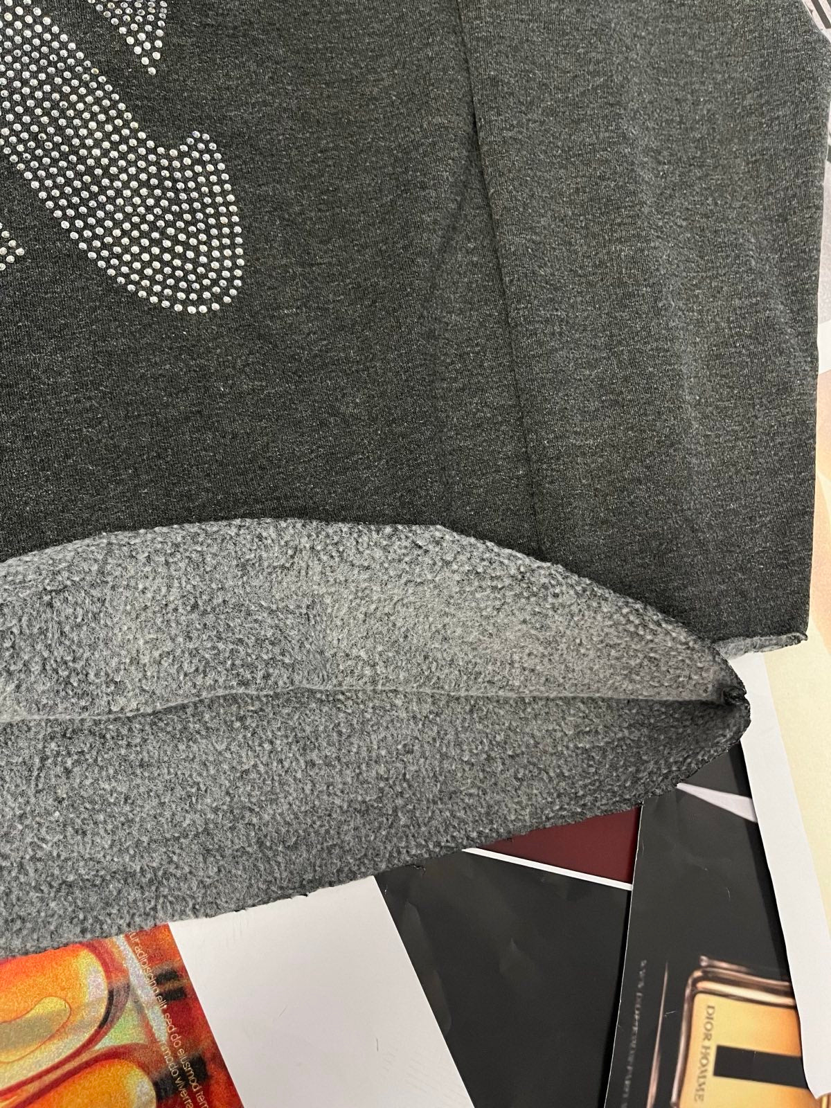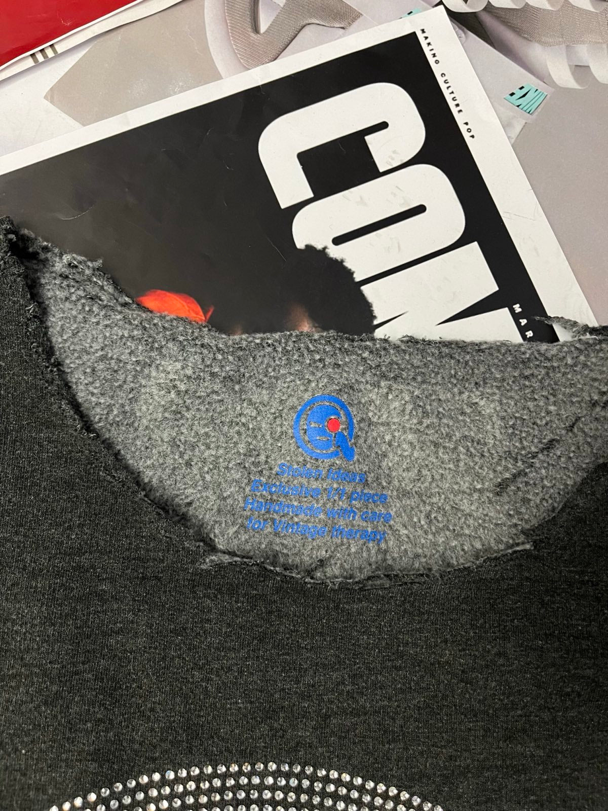 Šedý stonewashed crewneck s potiskem aplikace rhinestones, velikost L. Ručně aplikovaný distressed efekt.