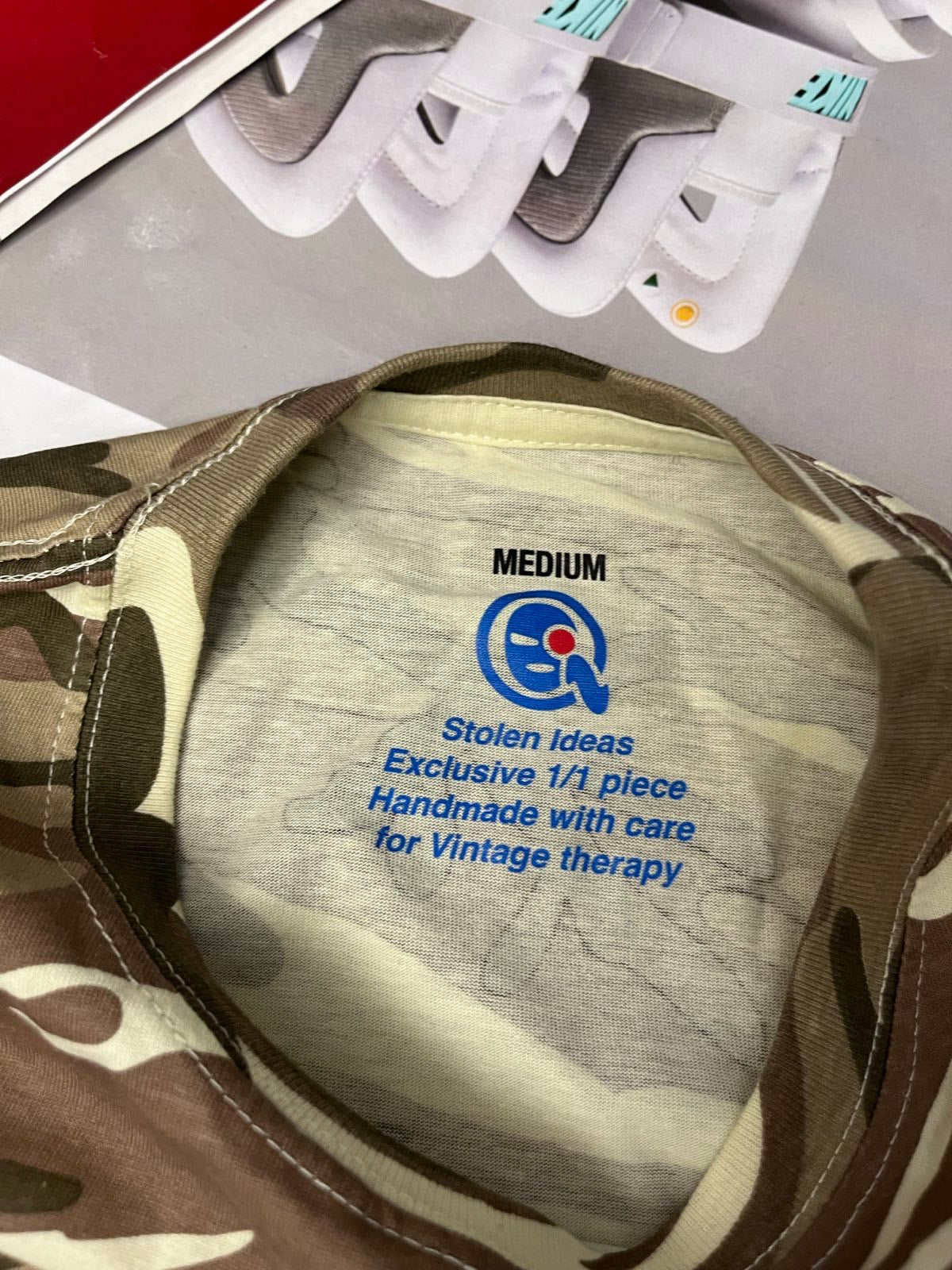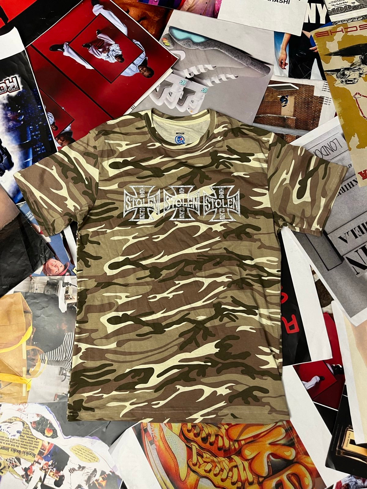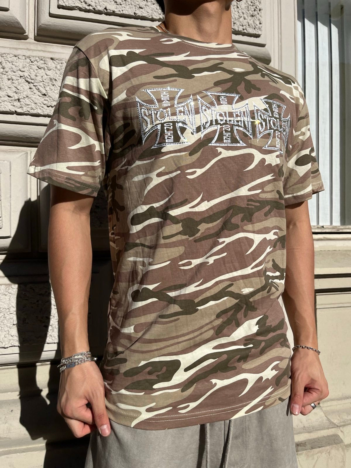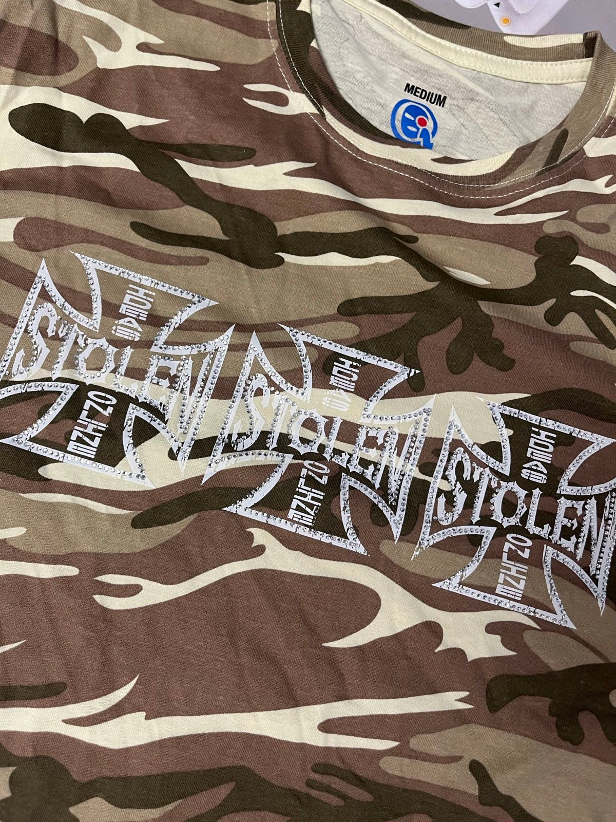 Camo triko s potiskem aplikace rhinestones a DTF, velikost M.