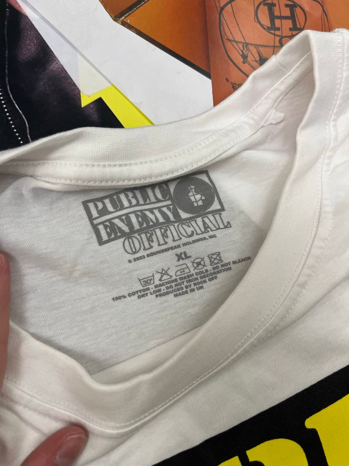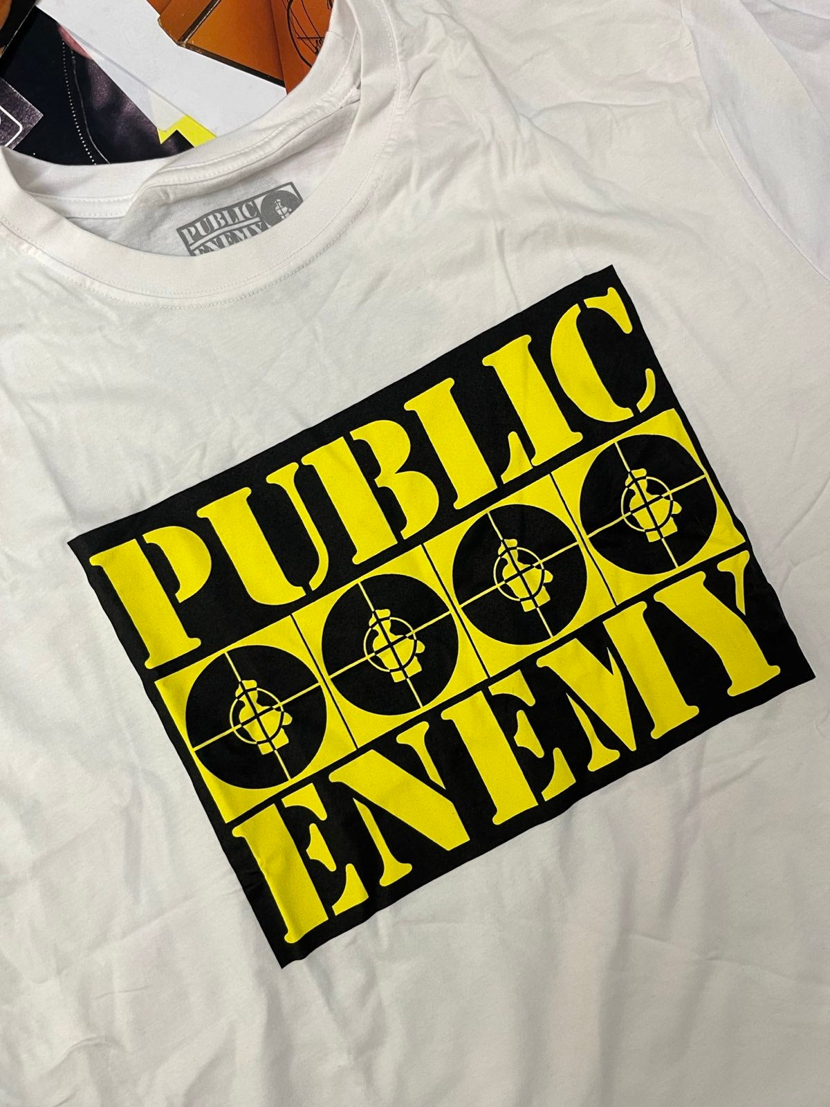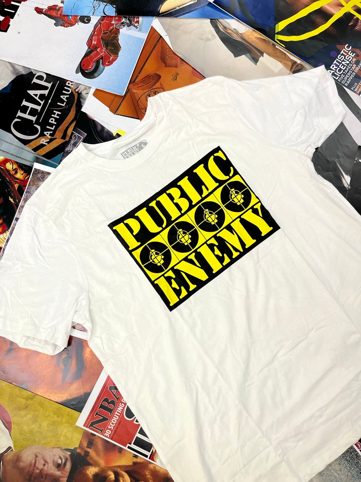 Public Enemy TRIKO bílé se žlutým nápisem v černém rámečku
