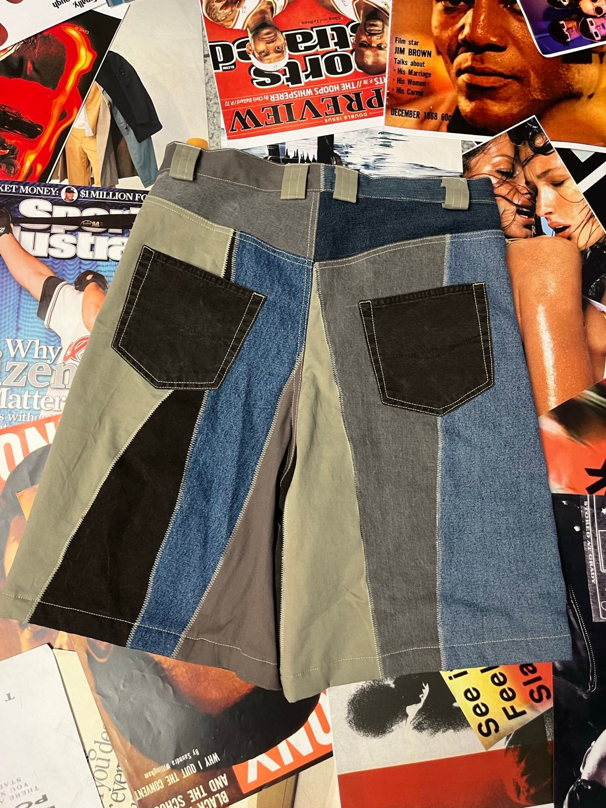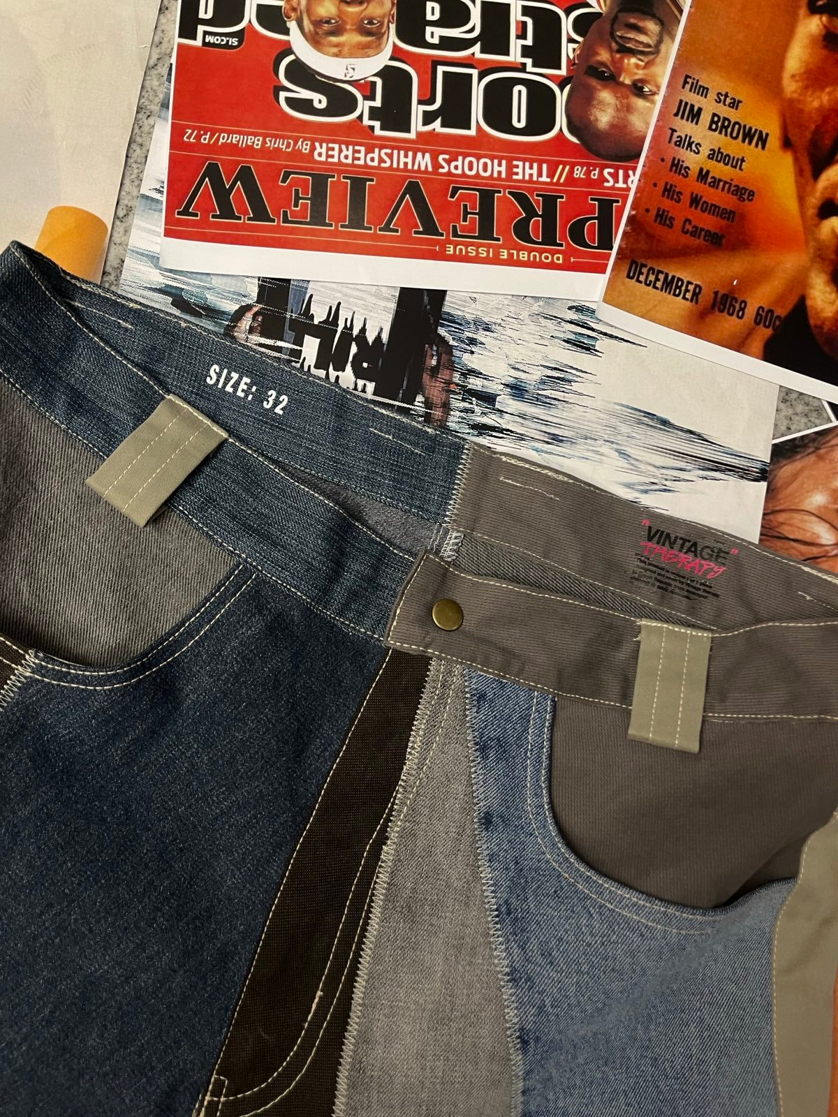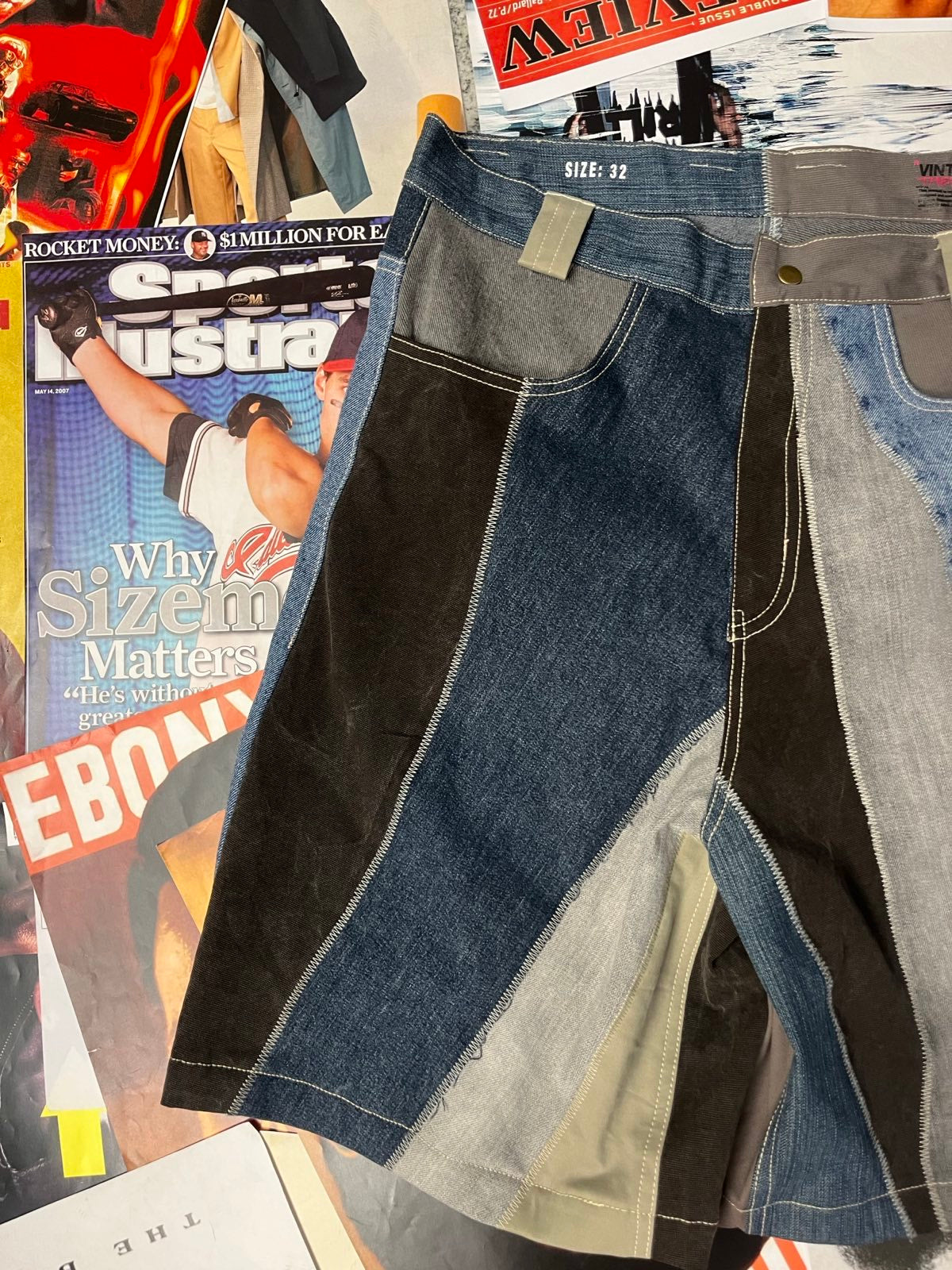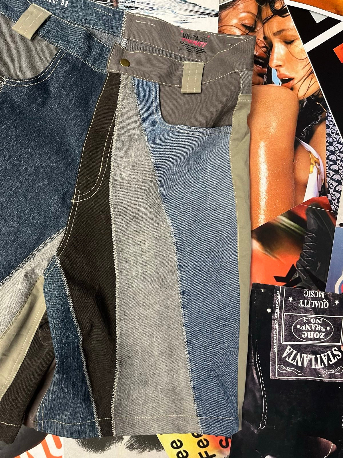 (L) Reworked KRAŤASY denim modro-šedo-béžové