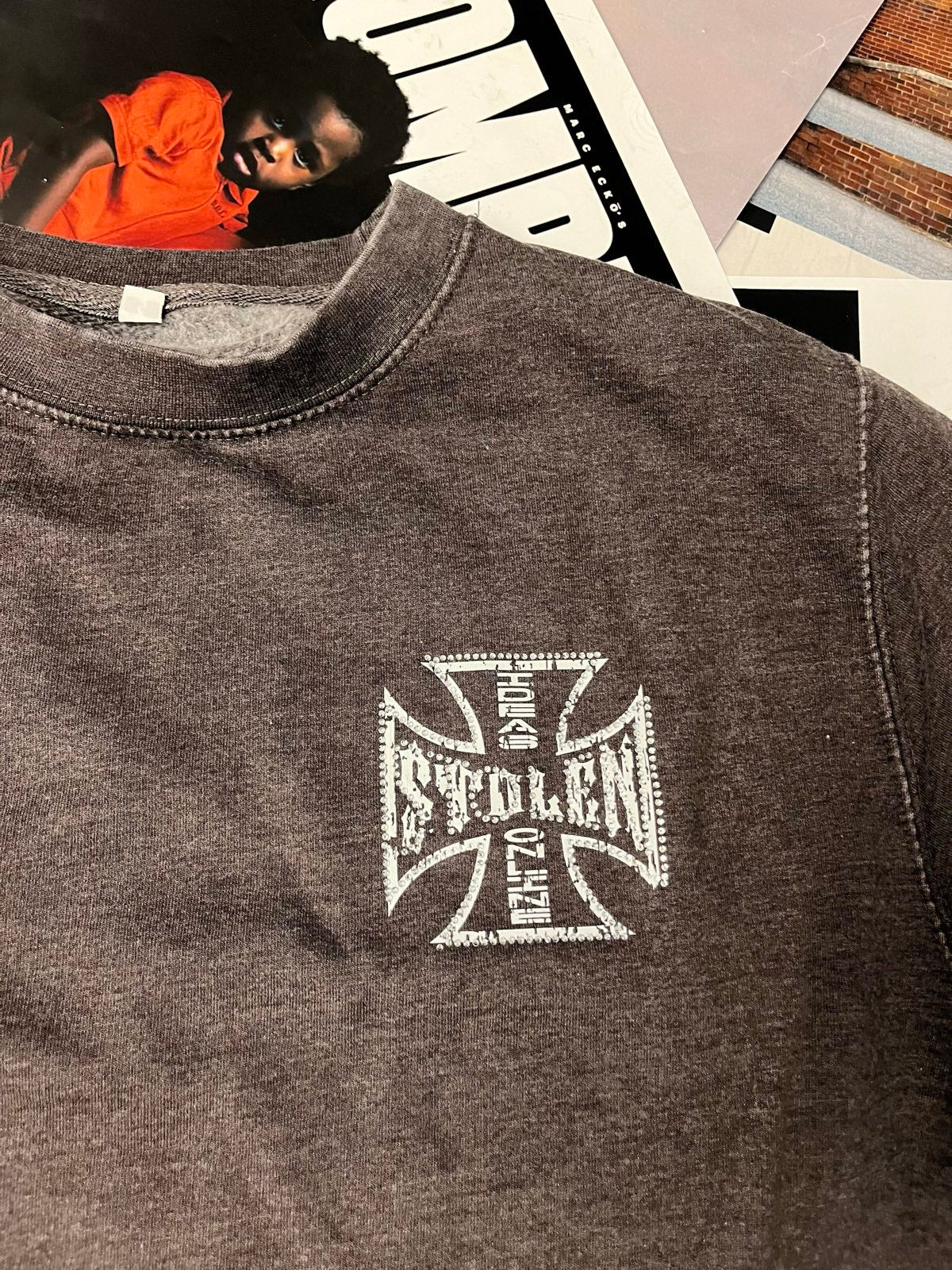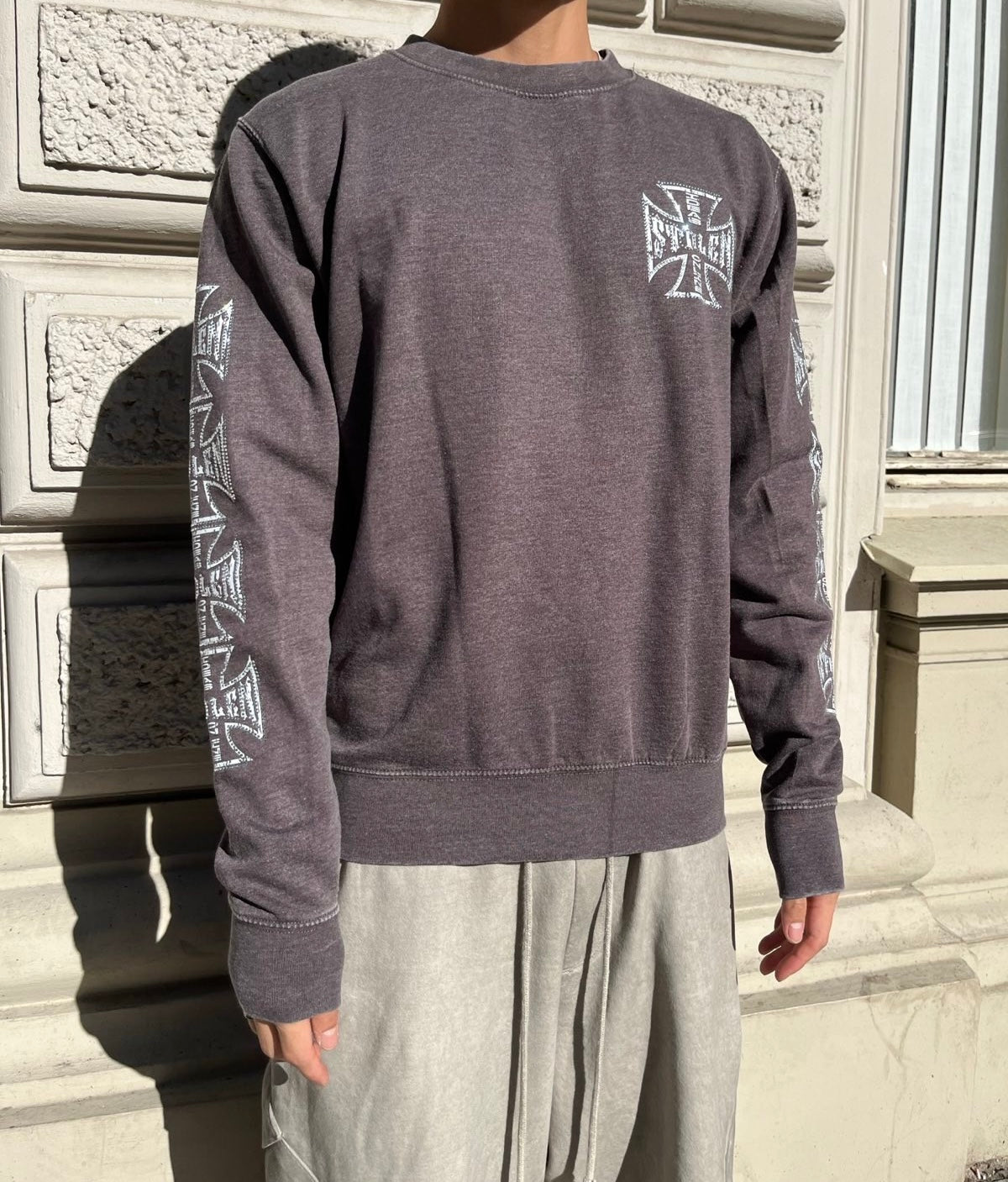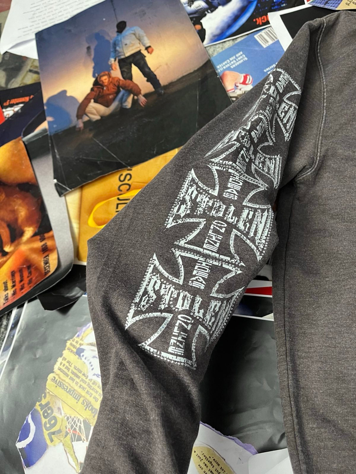 Šedo–hnědý stonewashed crewneck s potiskem aplikace rhinestones a DTF, velikost S.