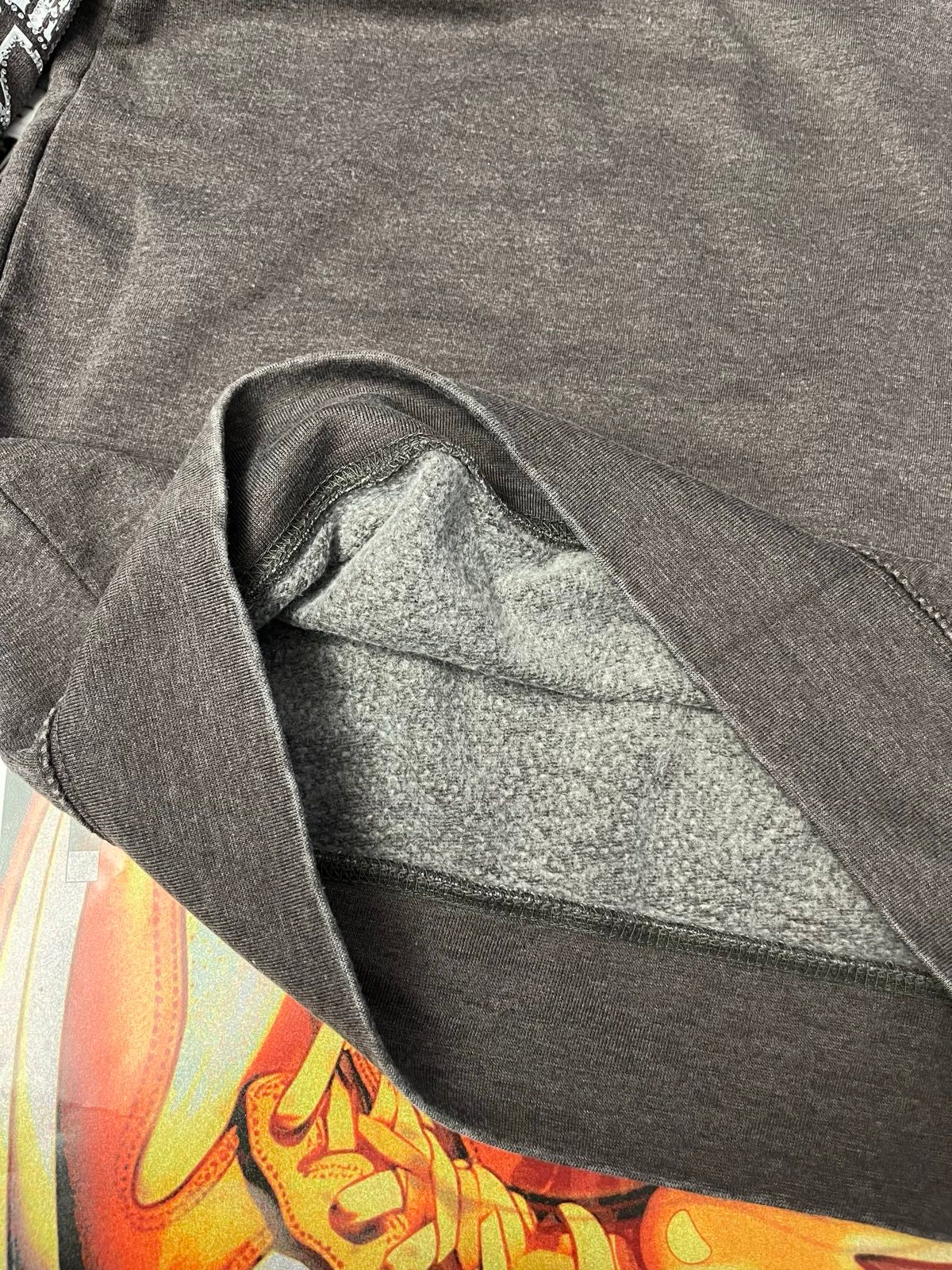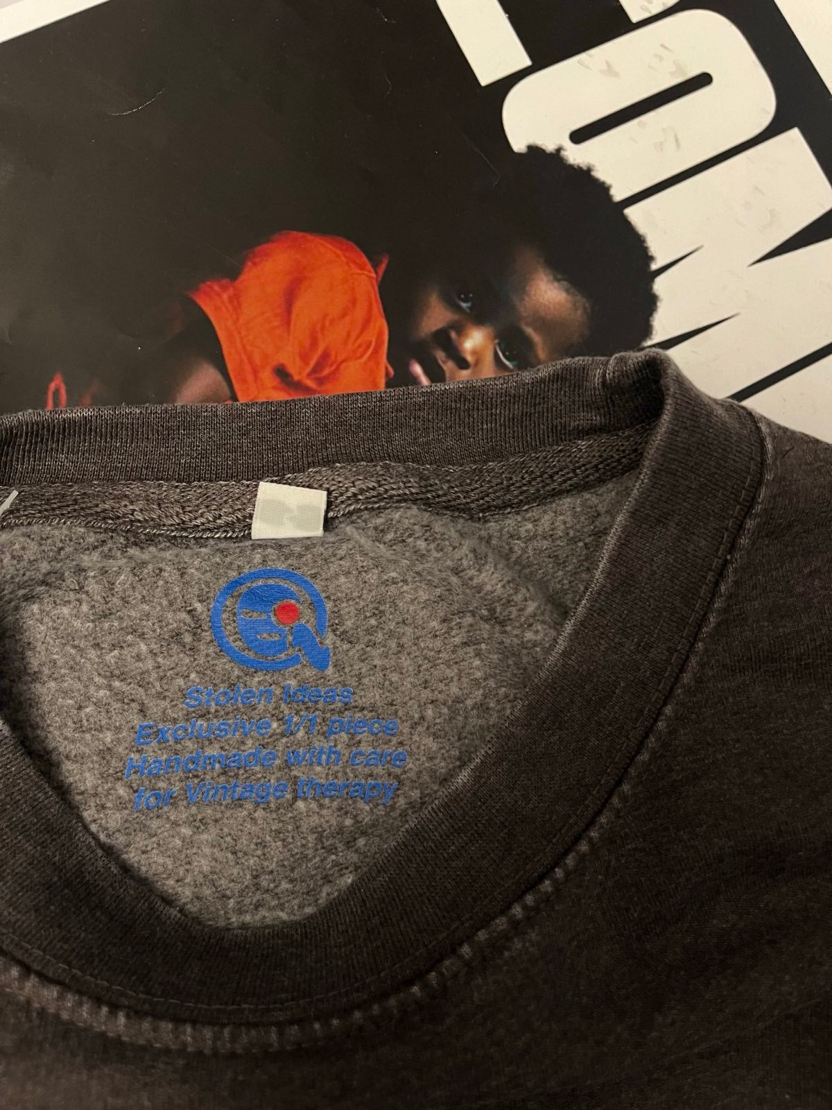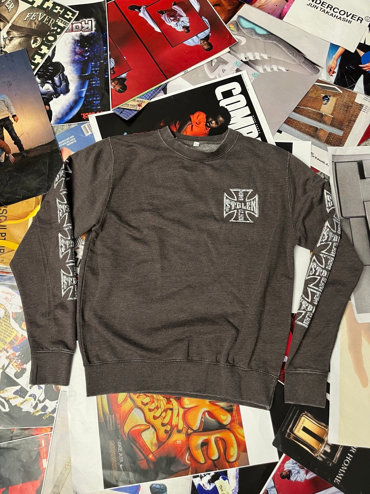 Šedo–hnědý stonewashed crewneck s potiskem aplikace rhinestones a DTF, velikost S.