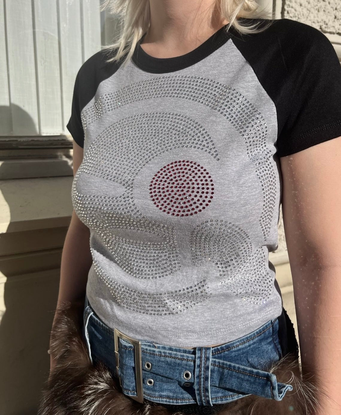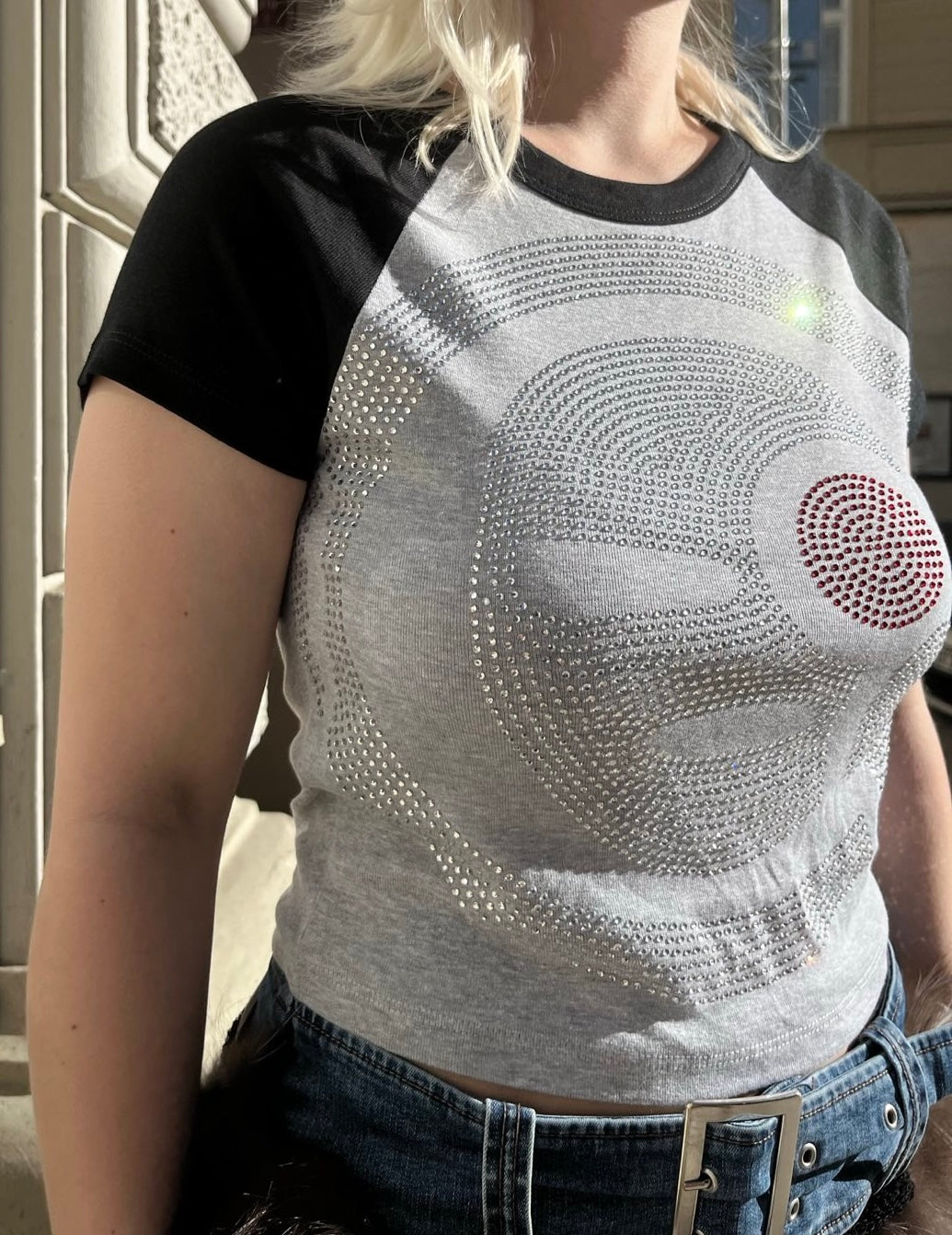 Šedé baby tee s potiskem aplikace rhinestones, velikost S.