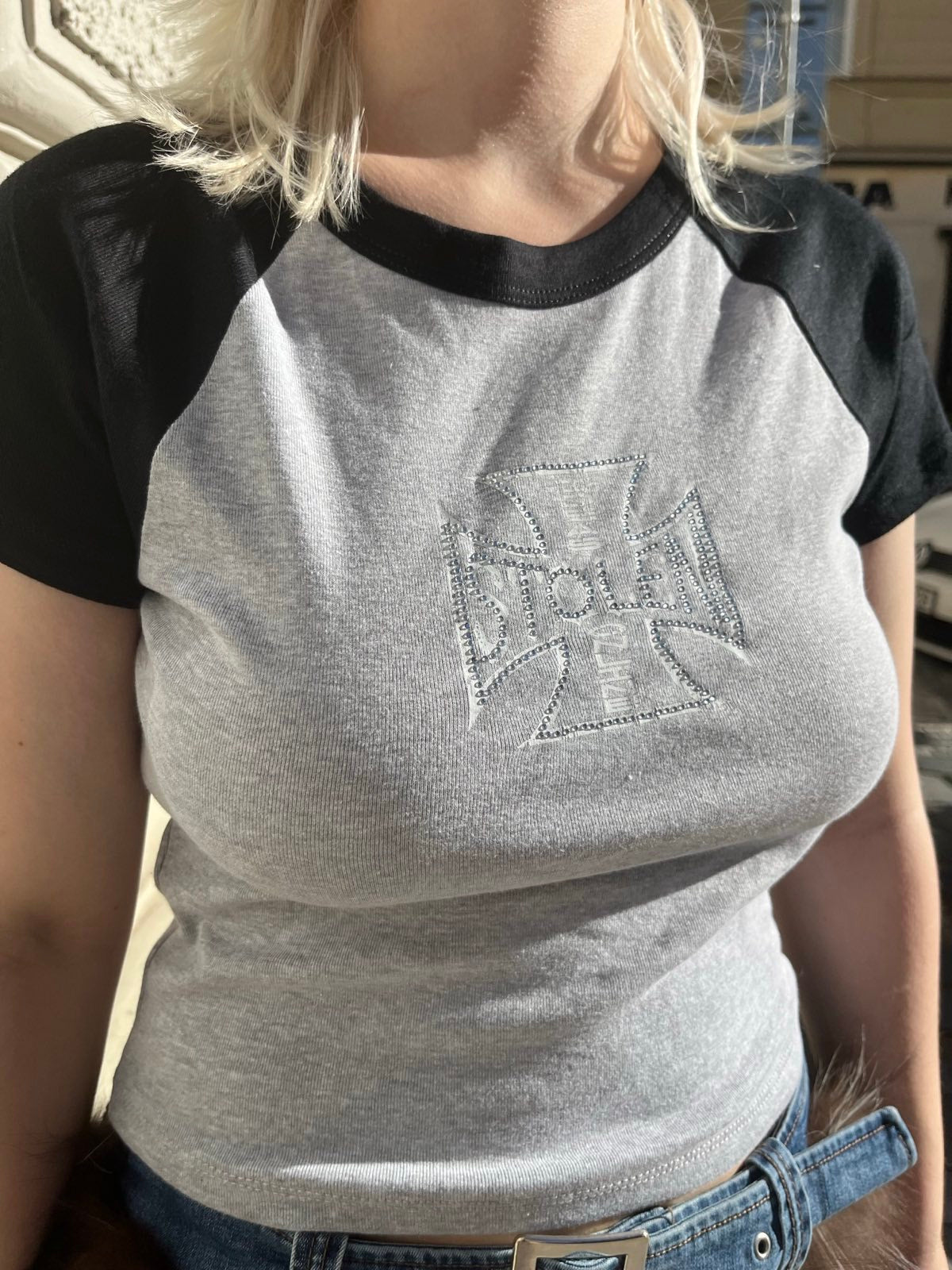 Šedé baby tee s potiskem aplikace rhinestones a DTF, velikost S.