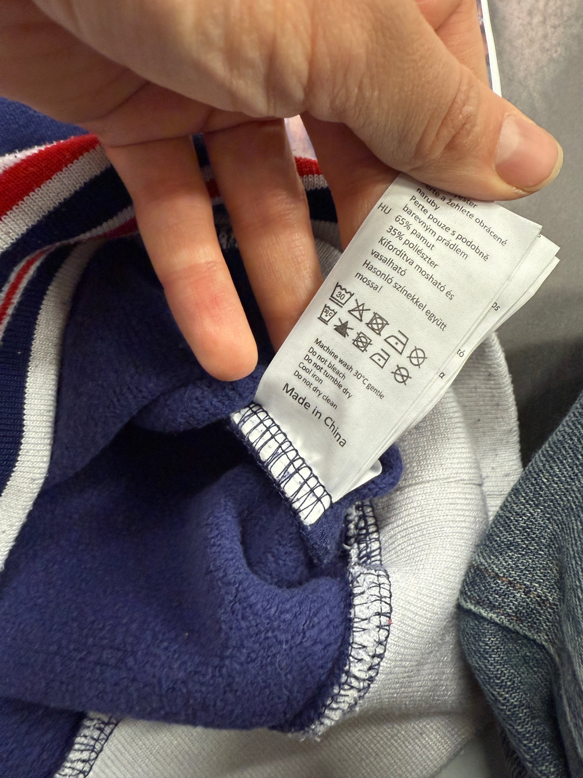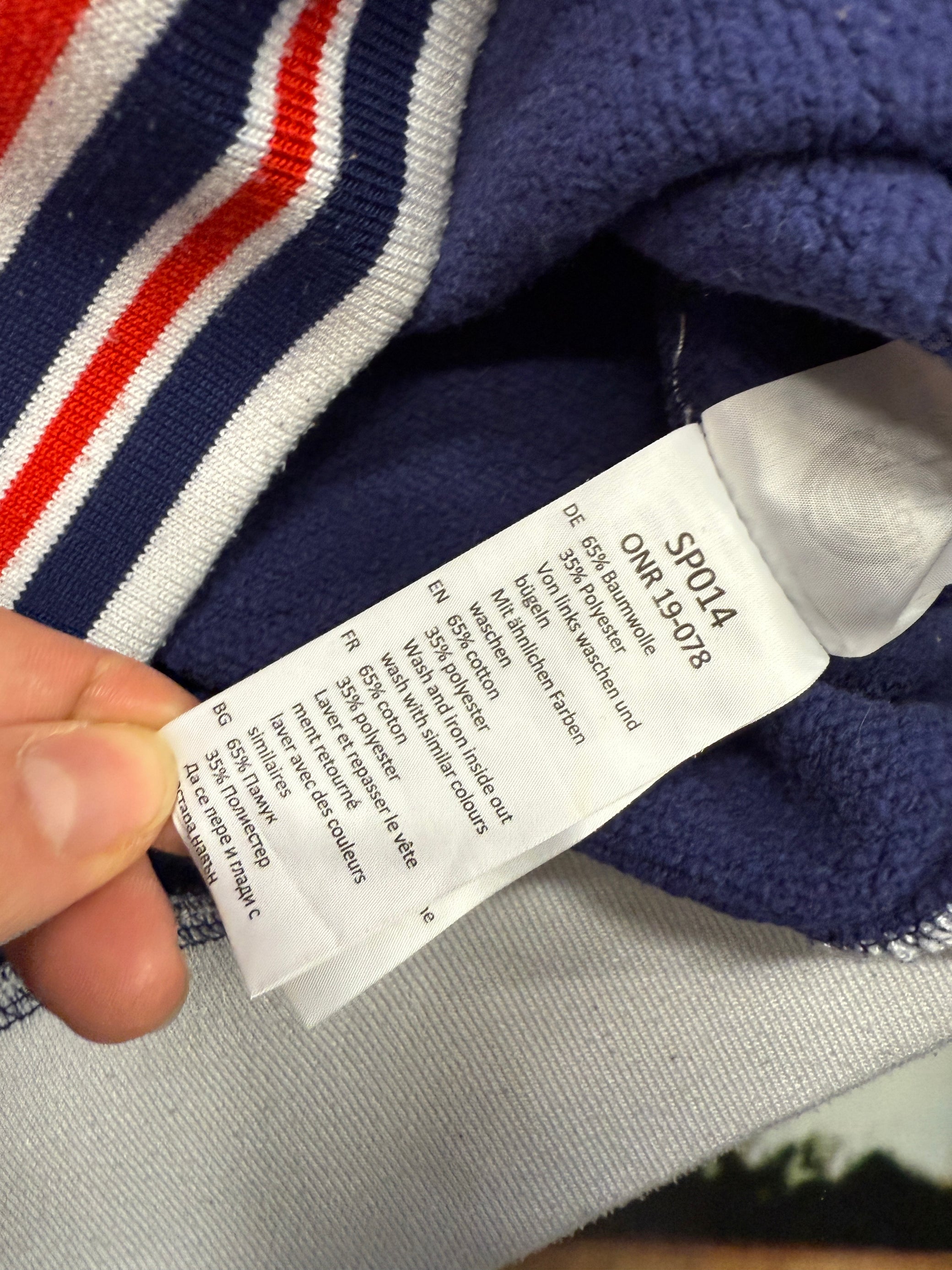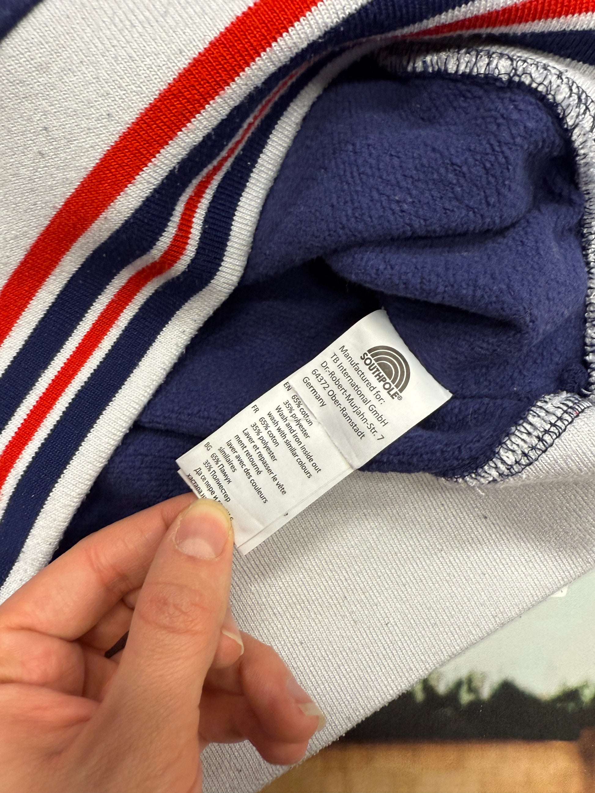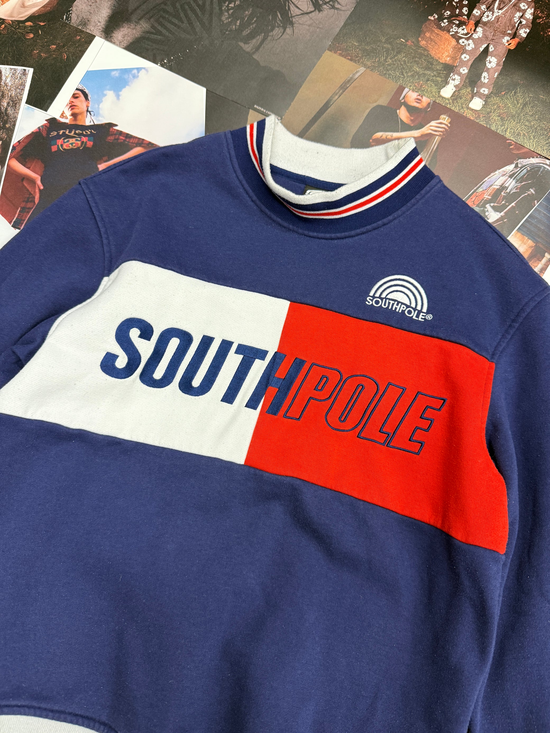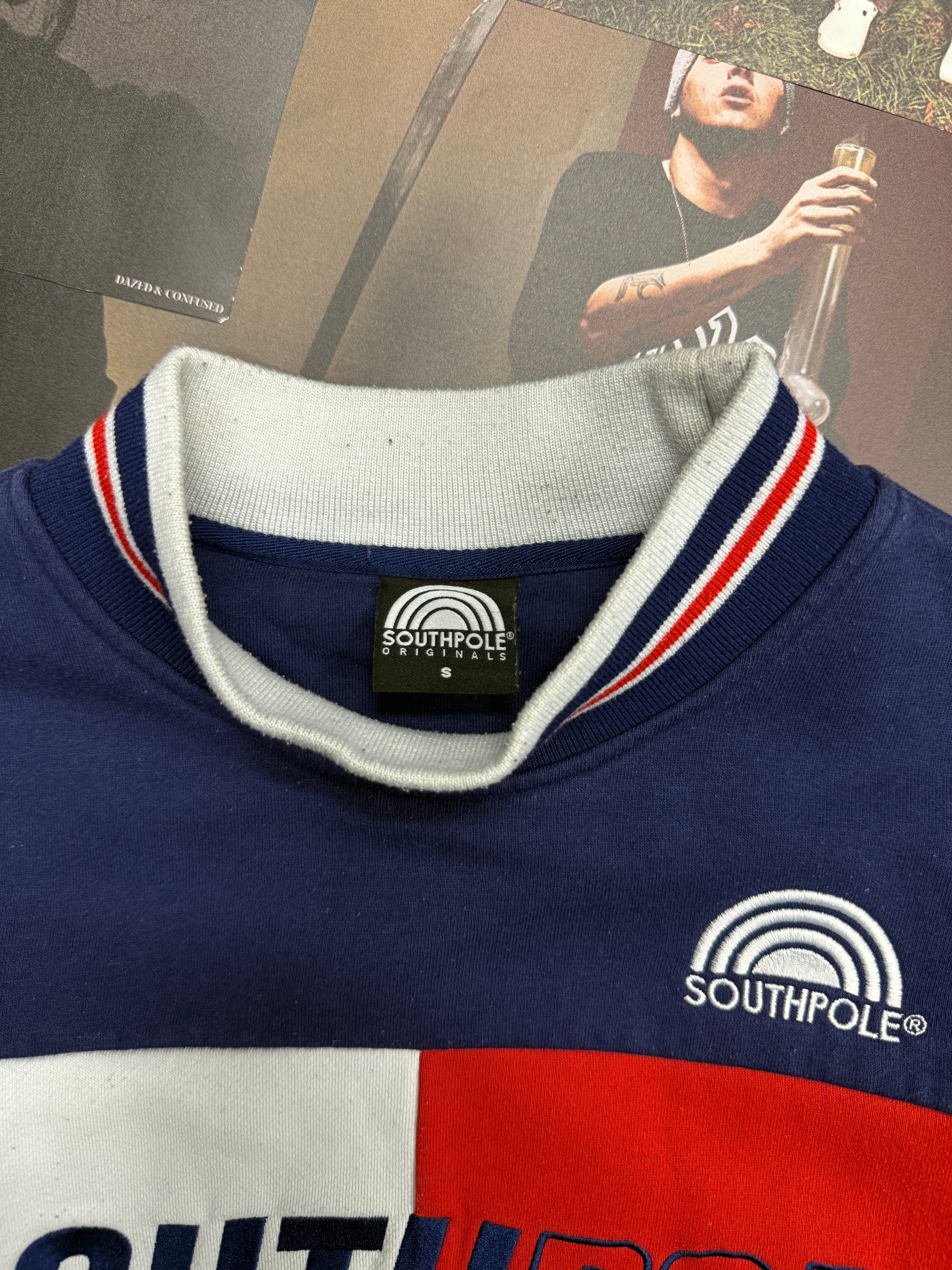 (S) Southpole crewneck modrý s červeno bílým obdélníkem na hrudi a logem Southpole