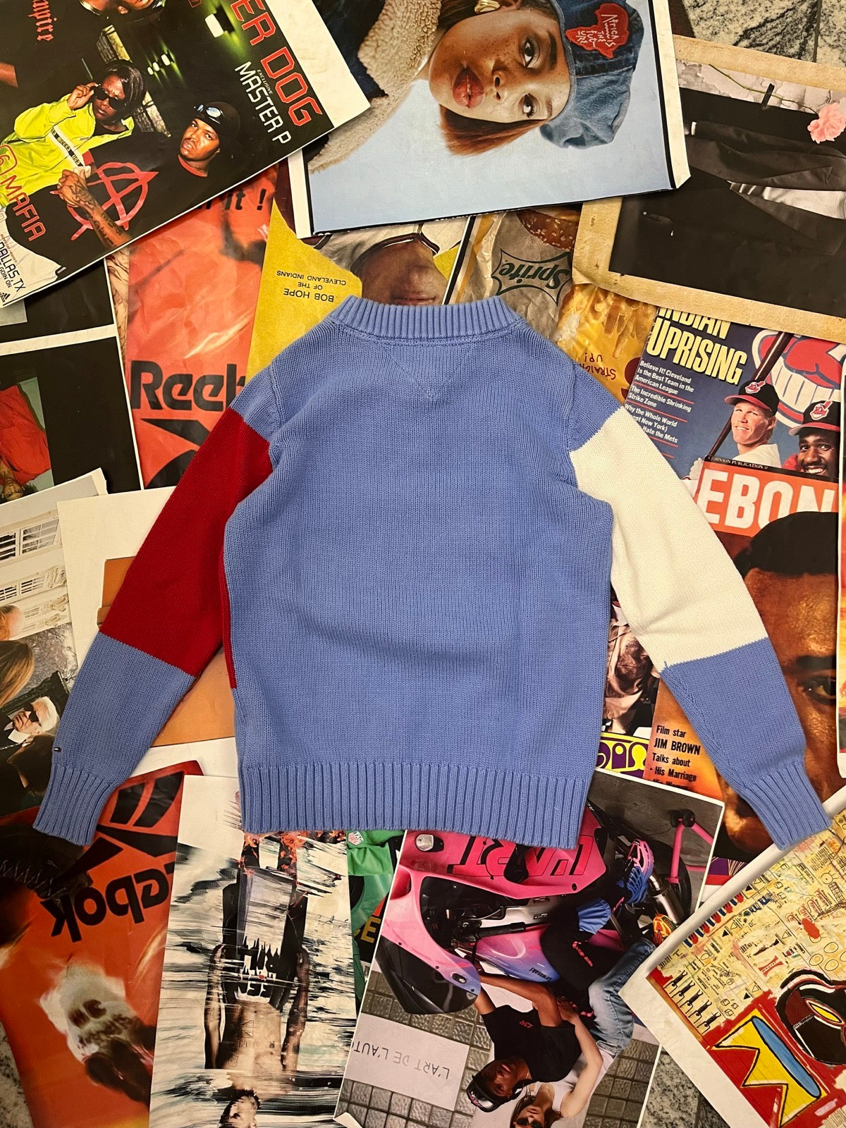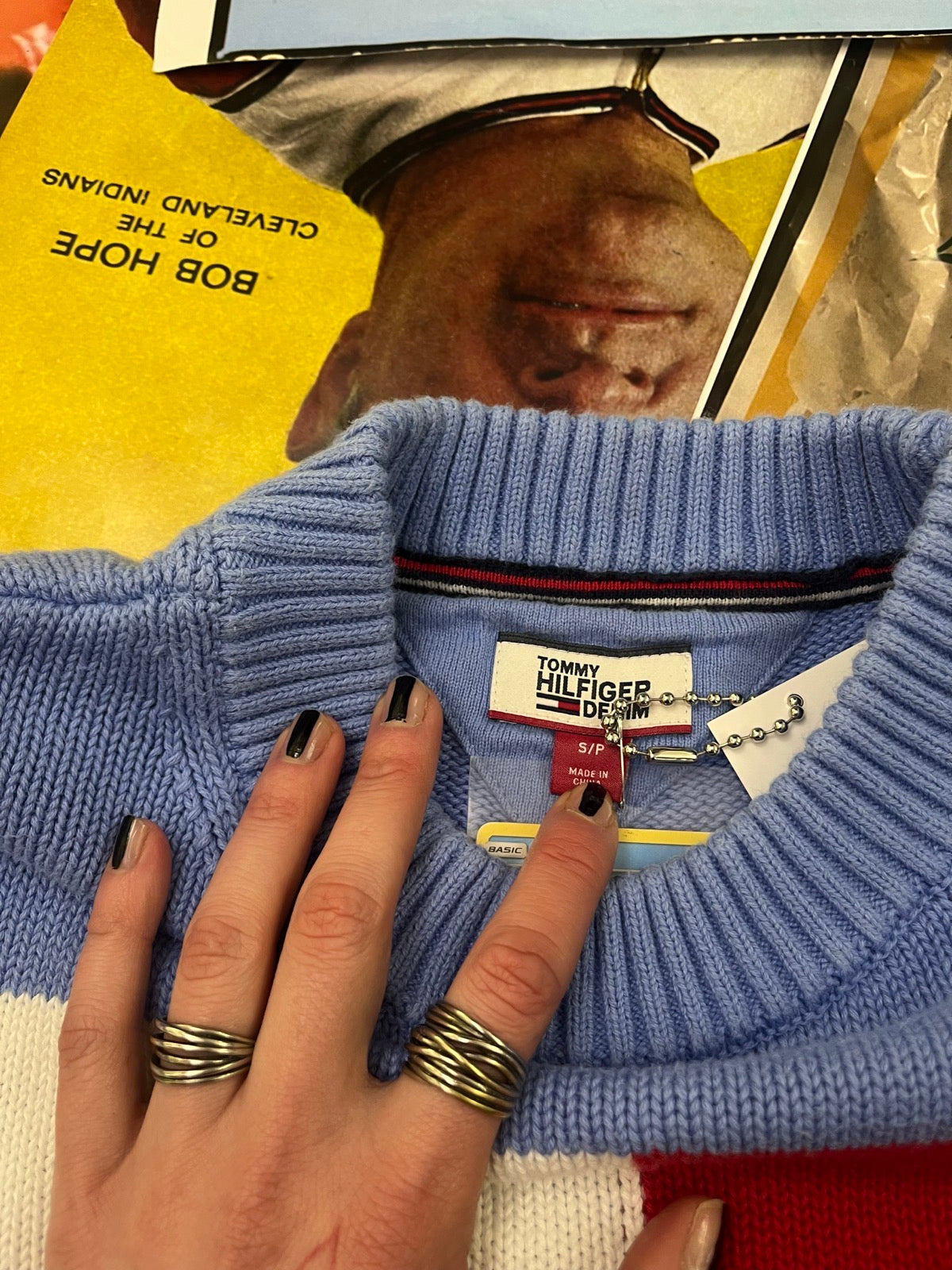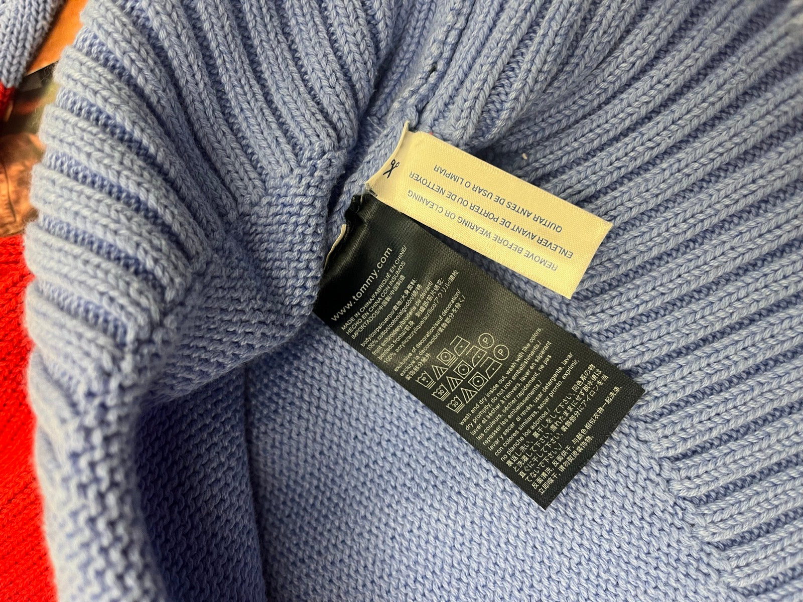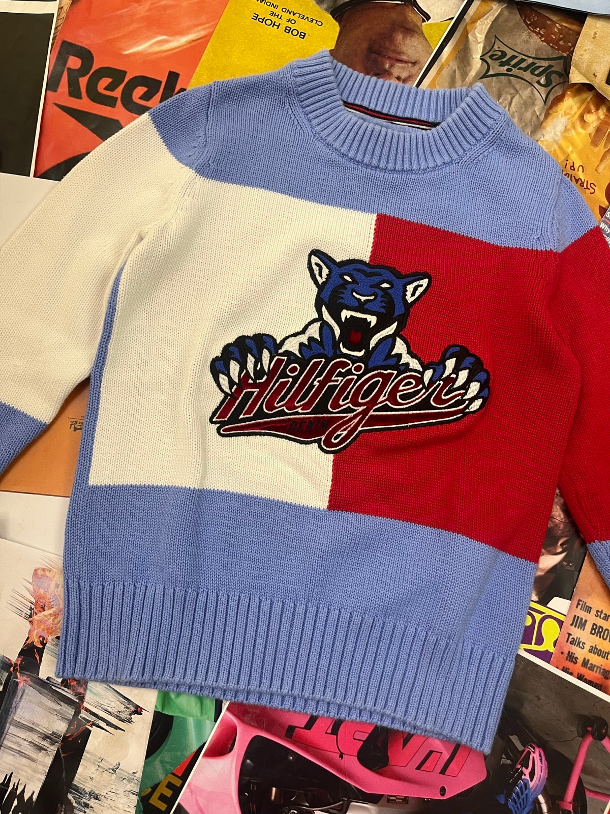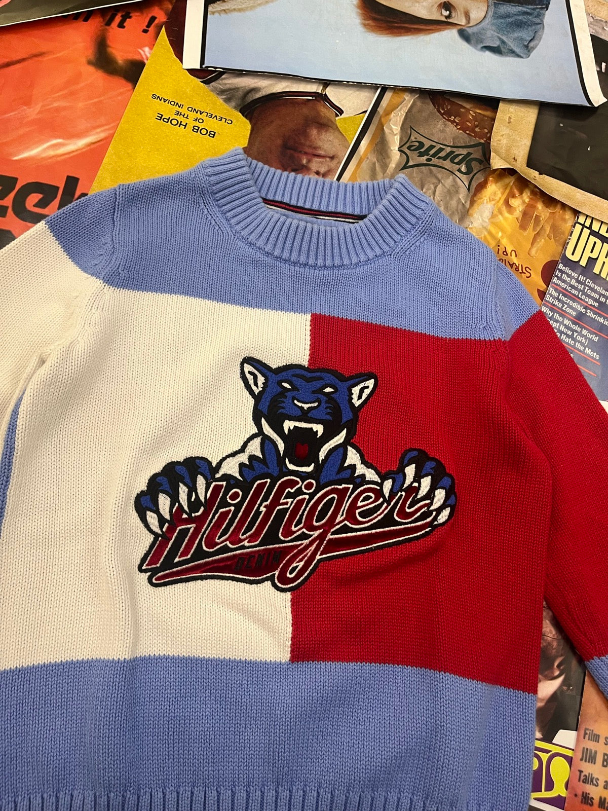 (S) Tommy Hilfiger Denim modro-bílo-červený dámský svetr s výšivkou tygra