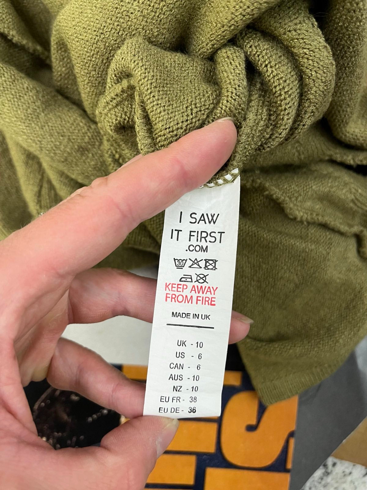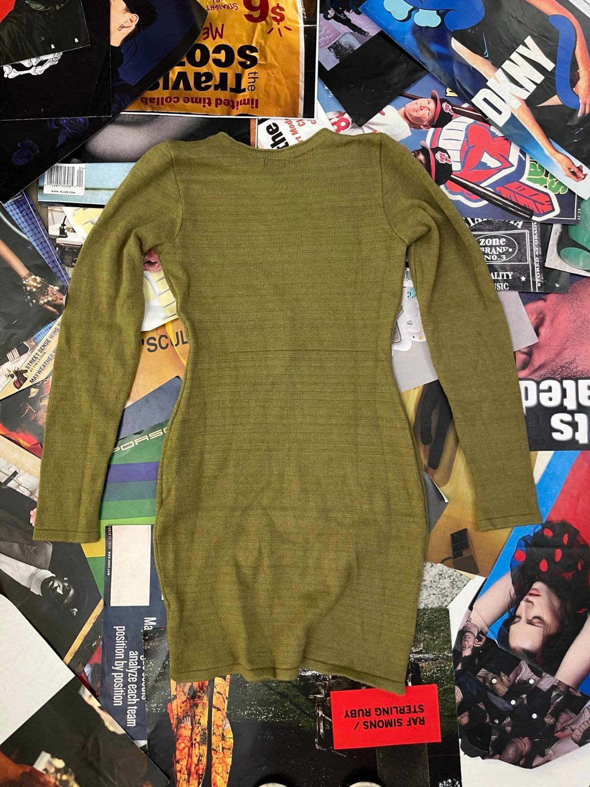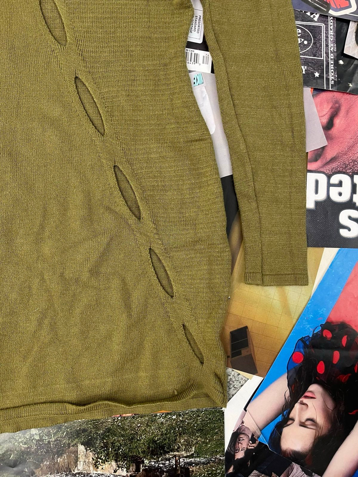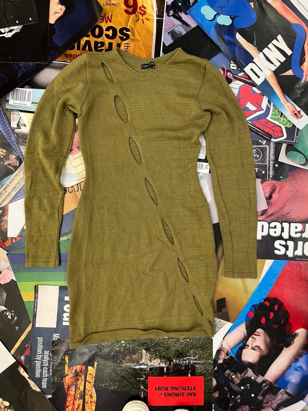 Saw it first pletené šaty khaki zelená nad kolena, detail průstřihů S