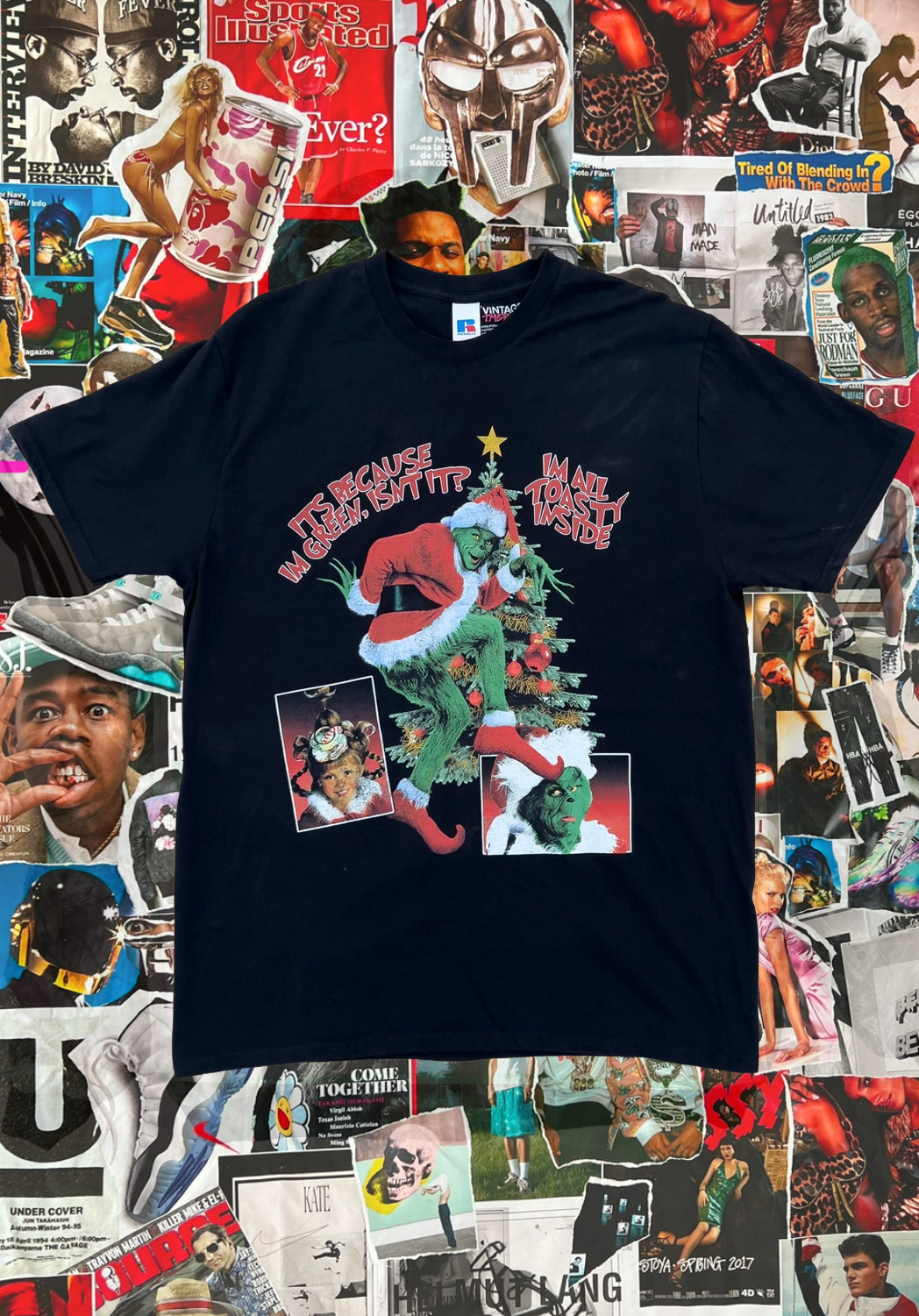 Černé a bílé triko značky Russell s bootlegovým potiskem na přední straně. Gramáž 180 GSM, regular fit. Potisk je formou přímého digitálního tisku (DTG), který si zaobstaráváme sami v naší dílně Vintage therapy.