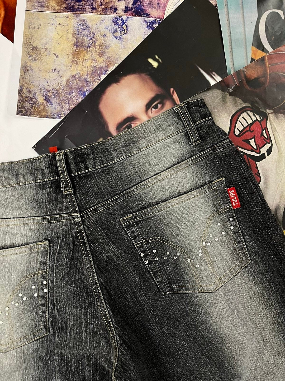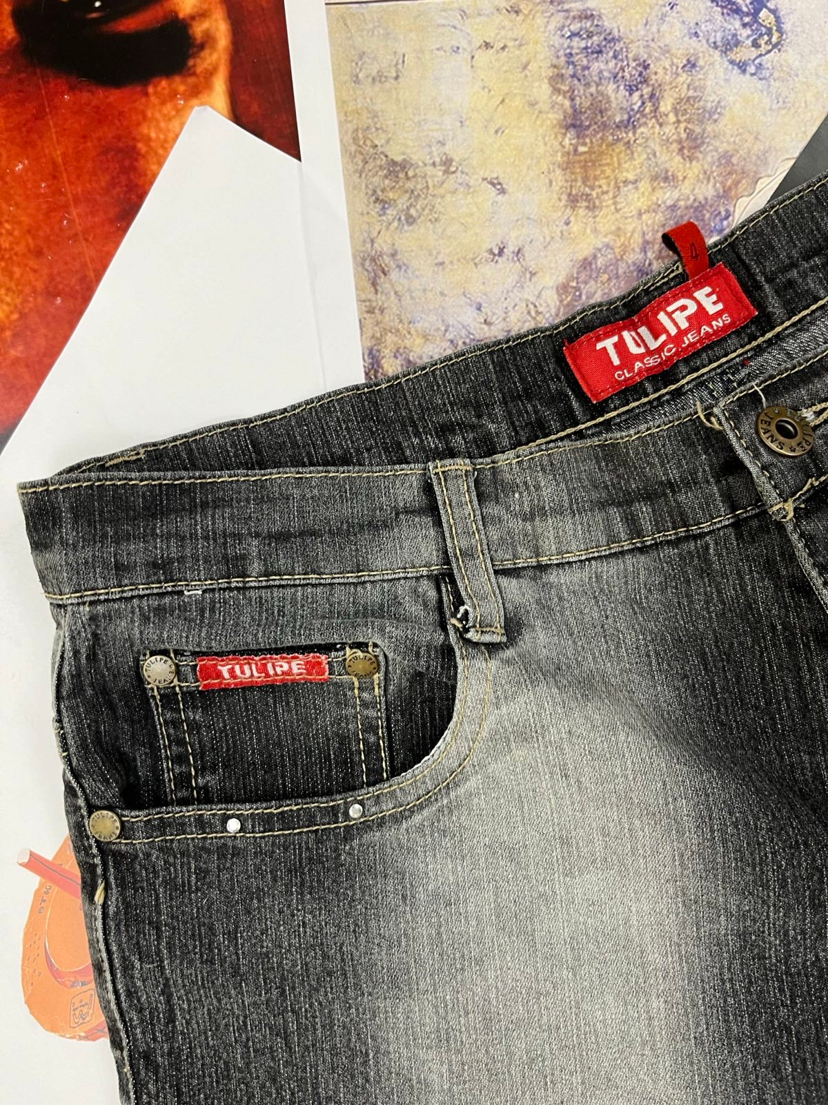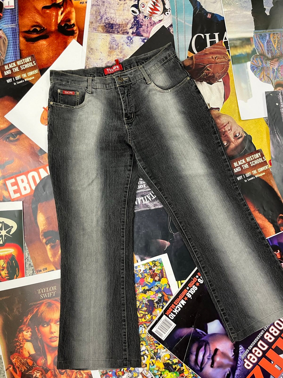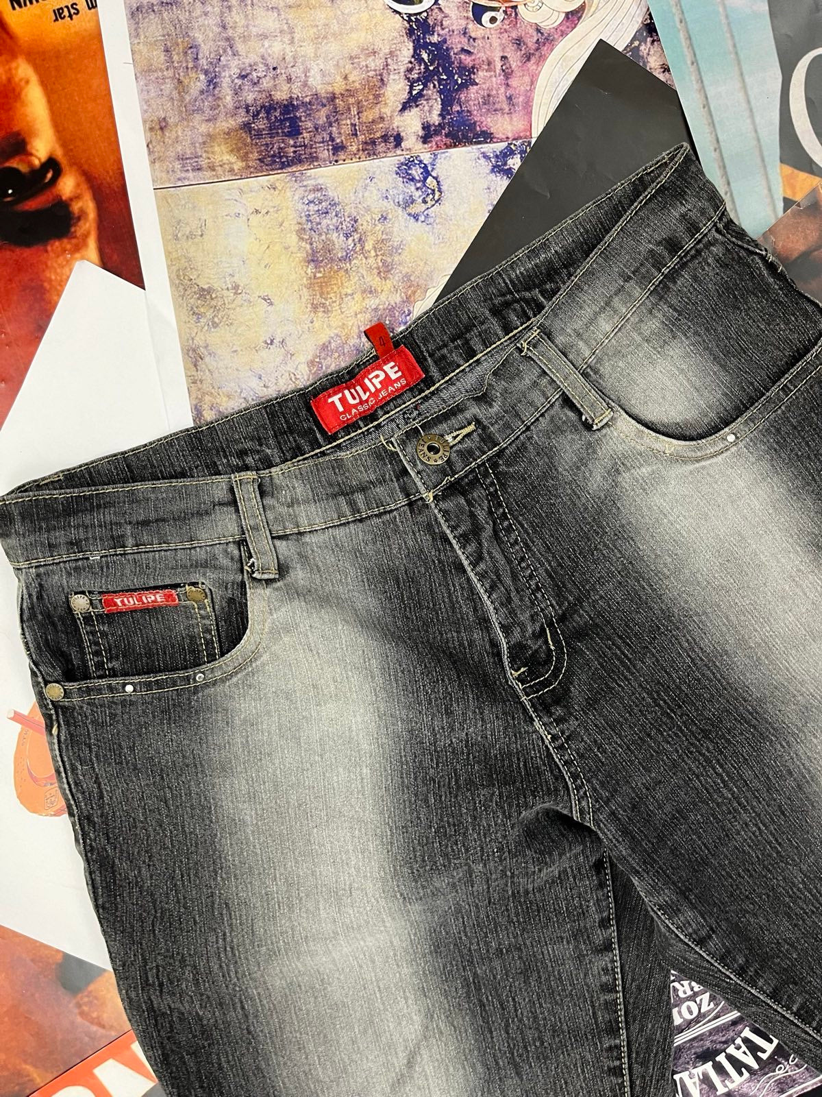 (M) Tulipe Jeans DŽÍNY dámské šedé s bílým vyšisováním do zvonu, kamínky na zadních kapsách