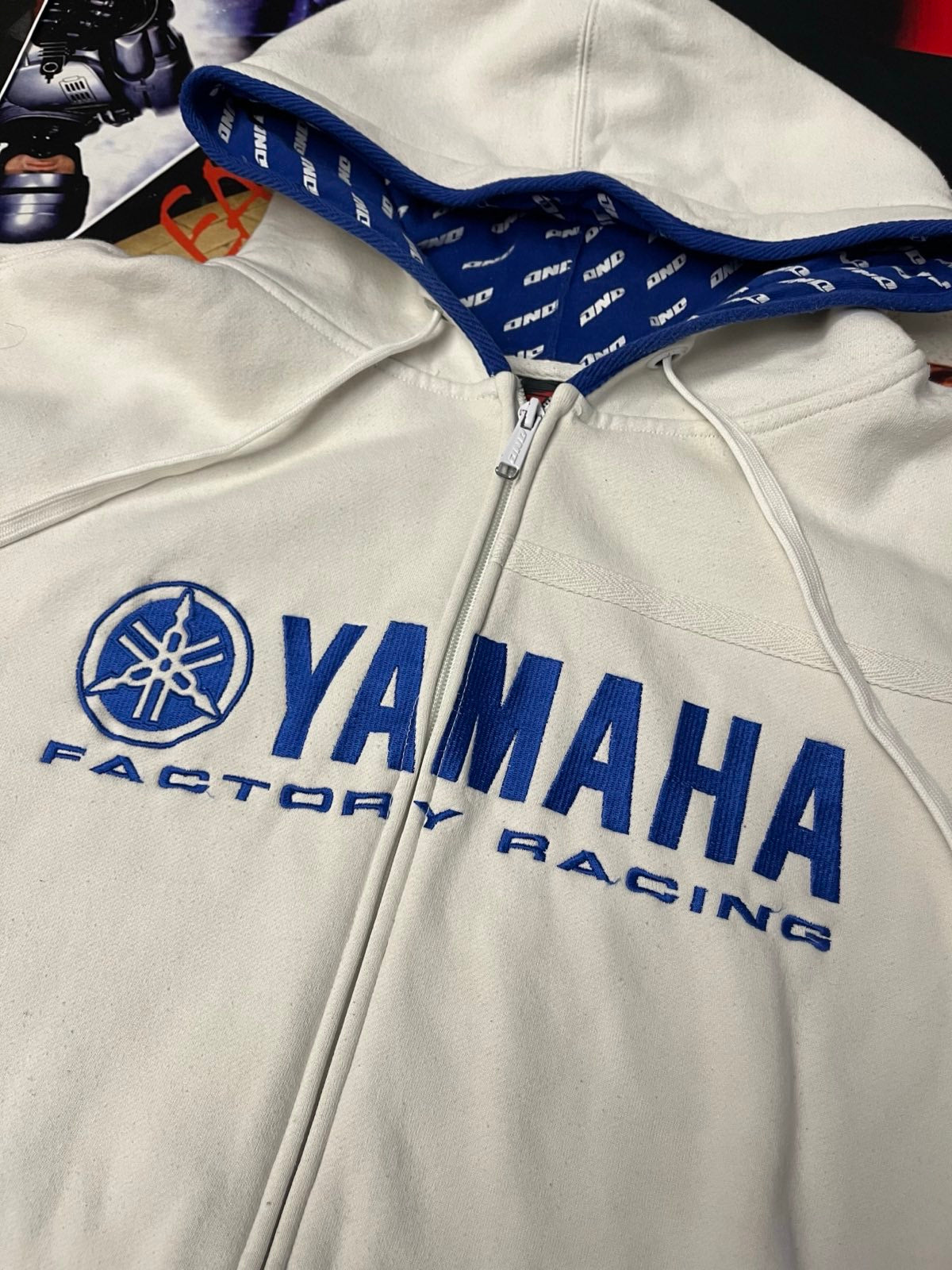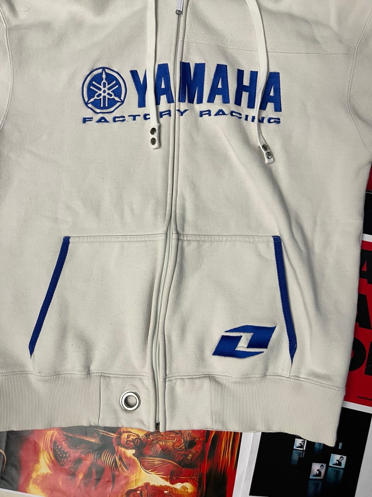 (M) Yamaha mikina bílá s modrou s kapucí na zip
